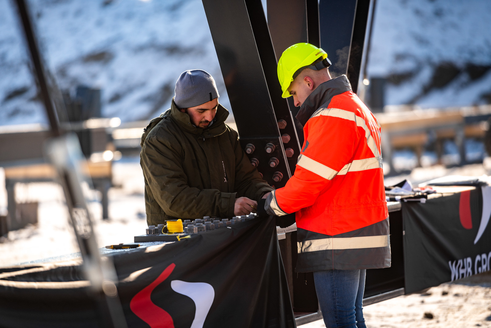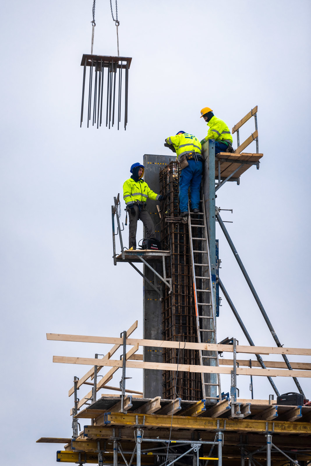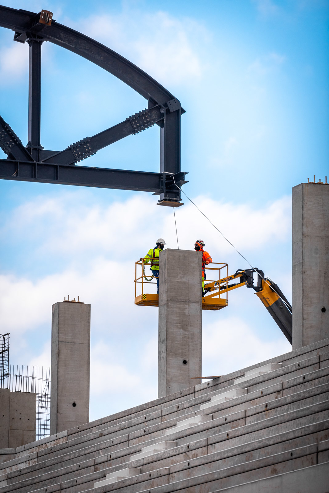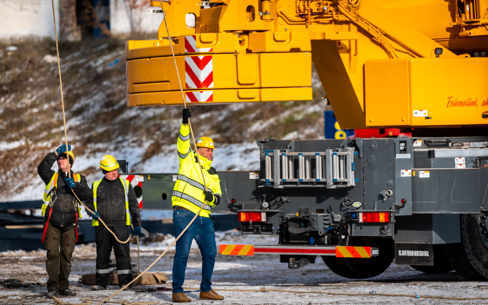 Az építkezés egyik leglátványosabb része zajlik, rendkívül összehangolt csapatmunkával.