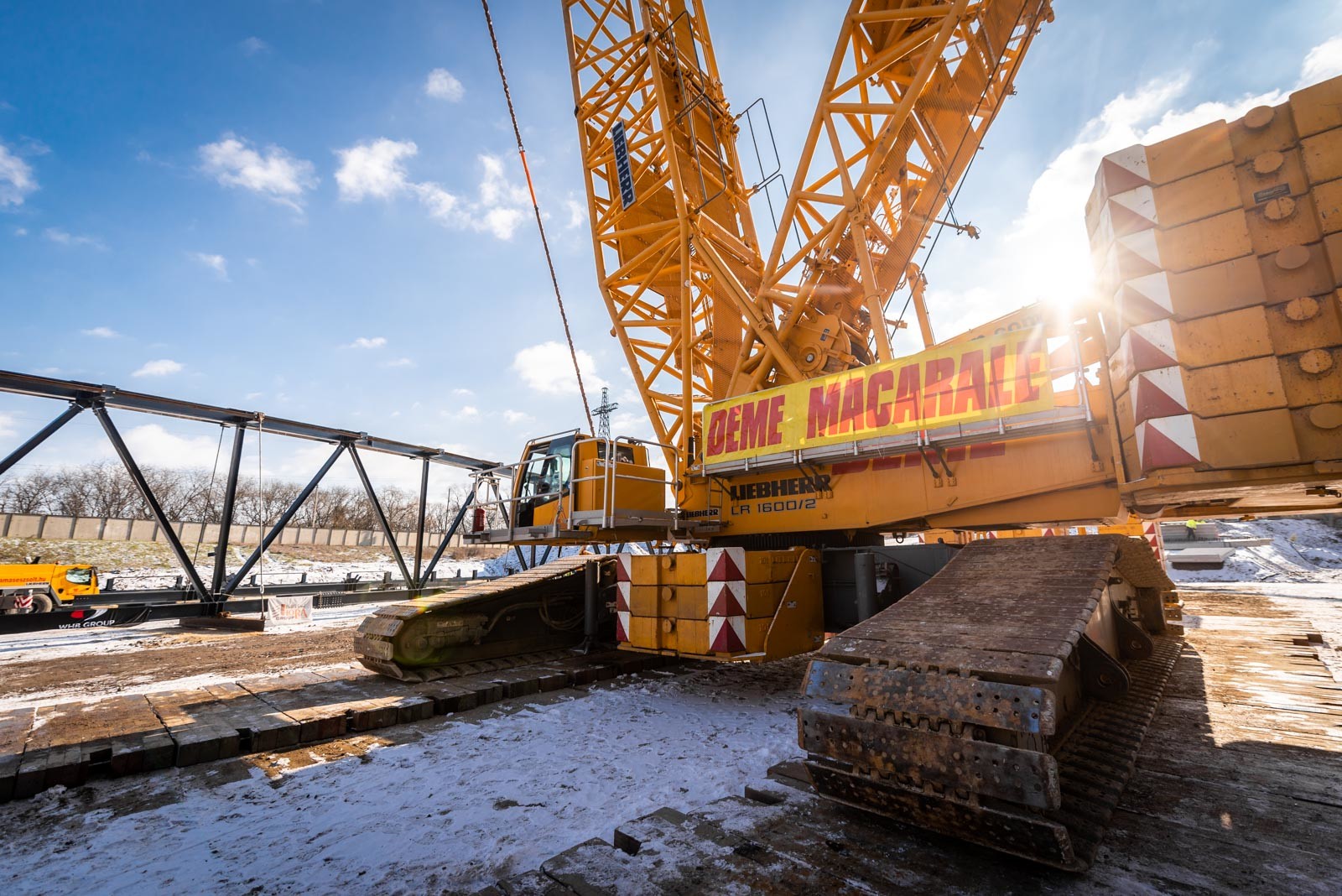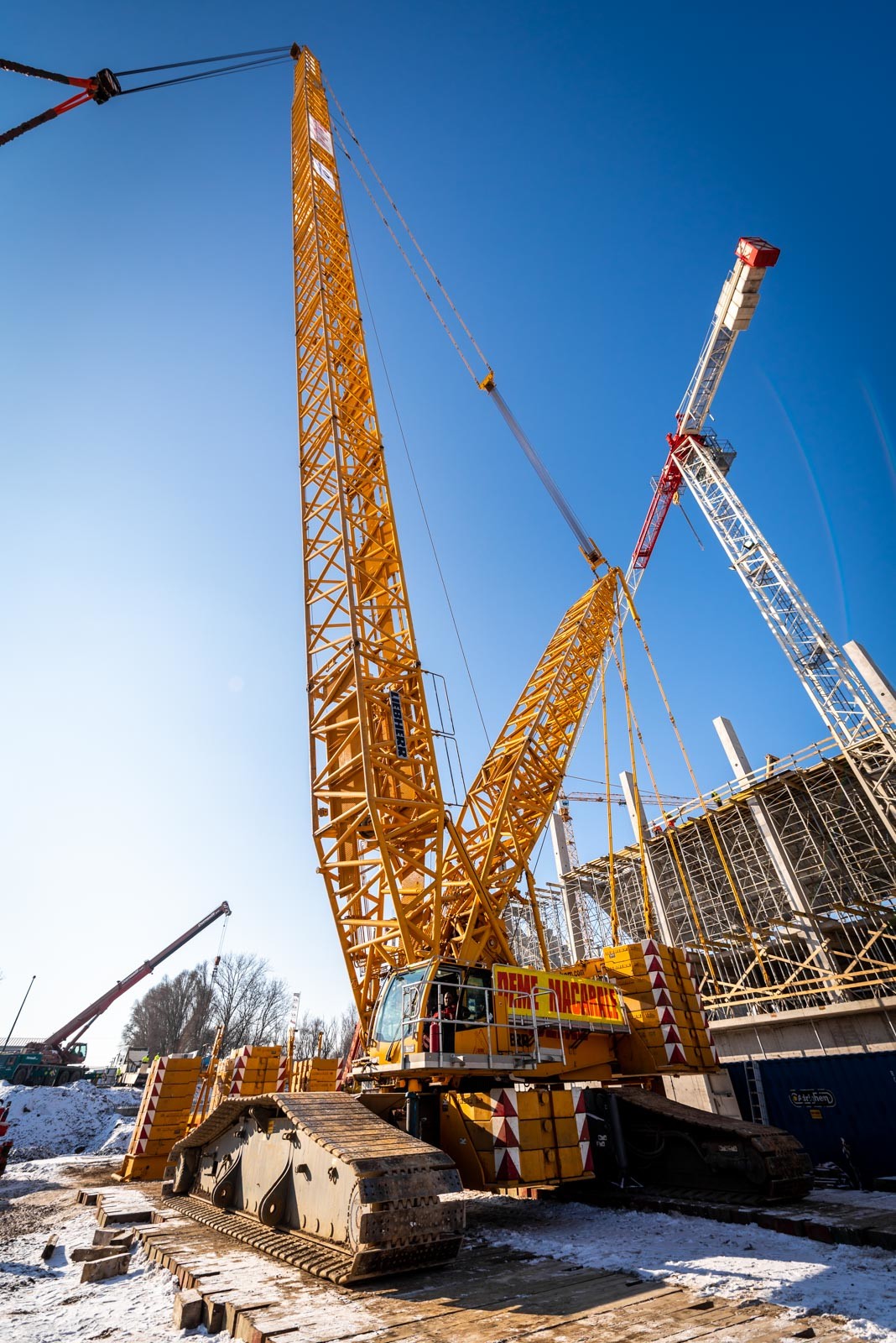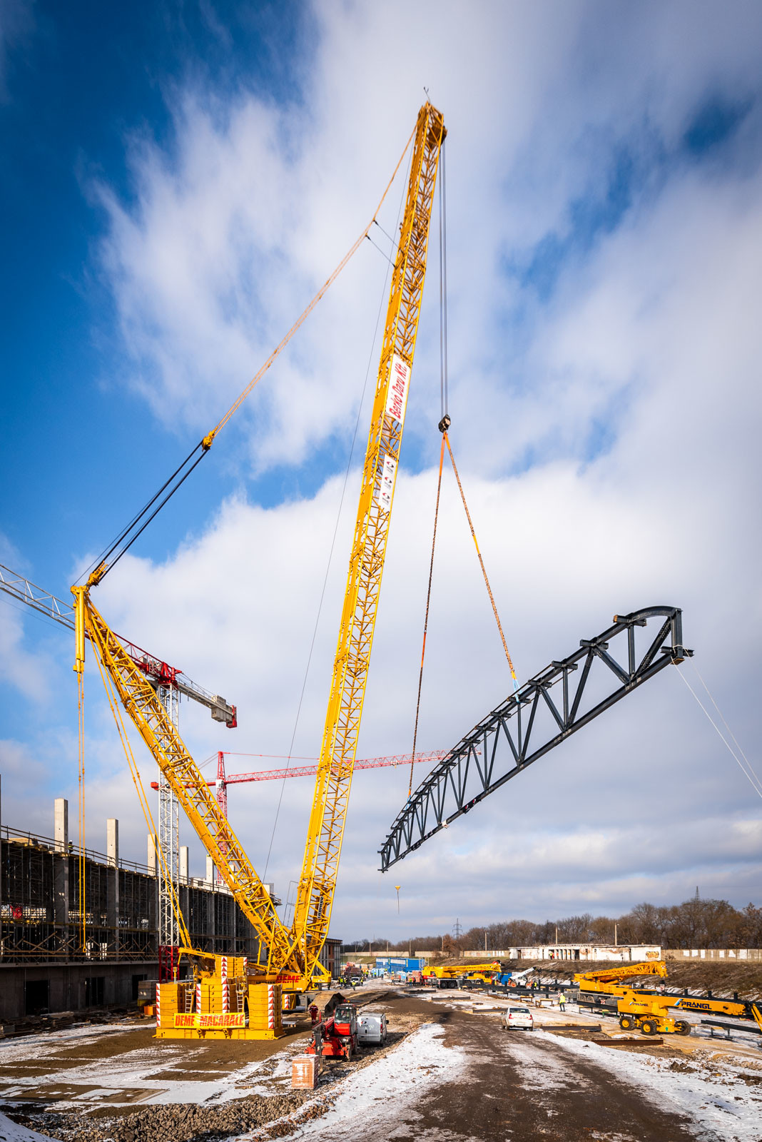 A 600 tonnás és 102 méter gémhosszú daru összeszereléséhez 60 kamion szállította az anyagot Szegedre.