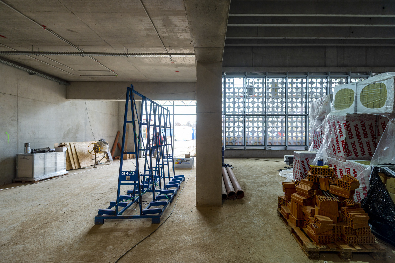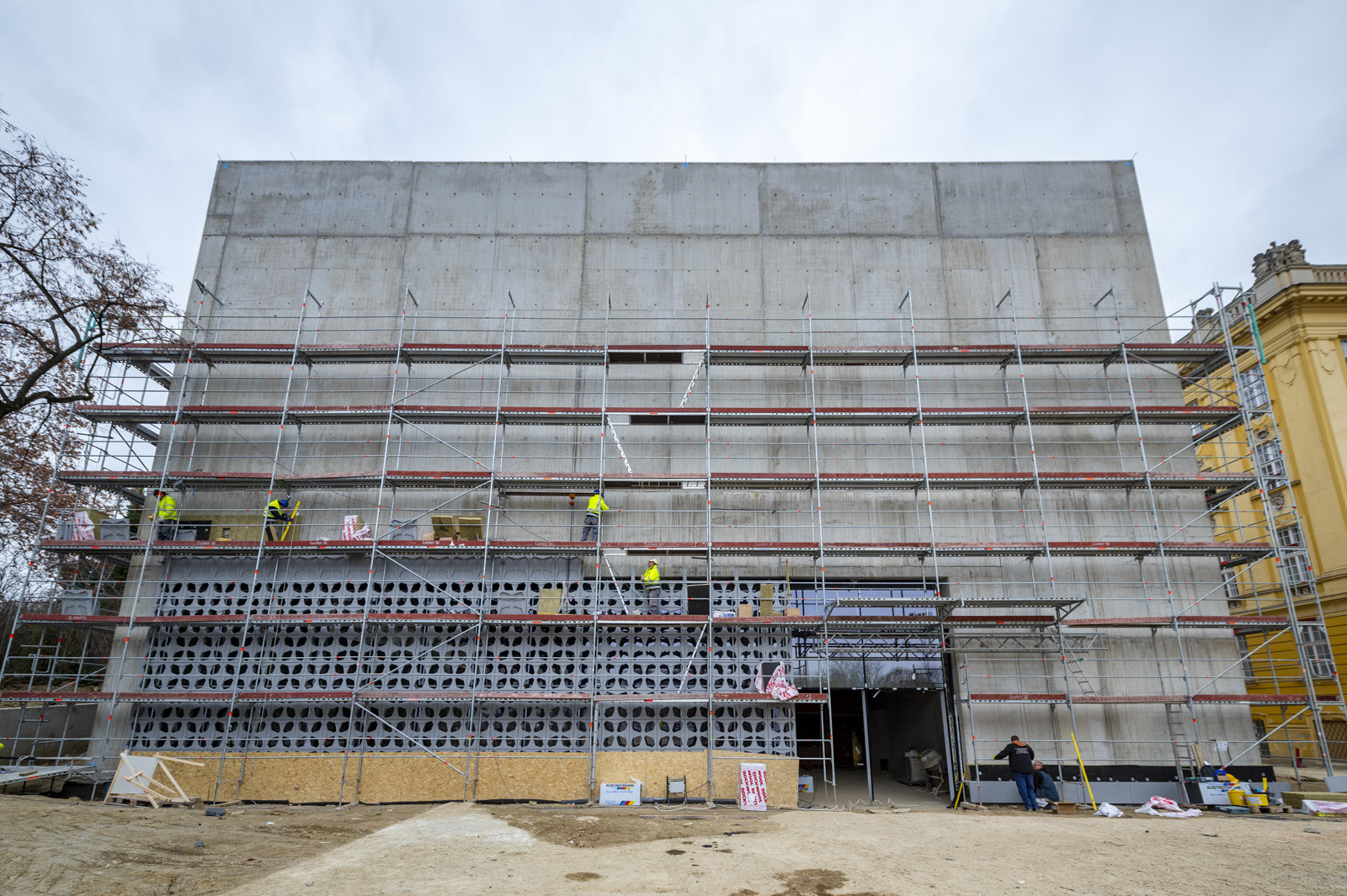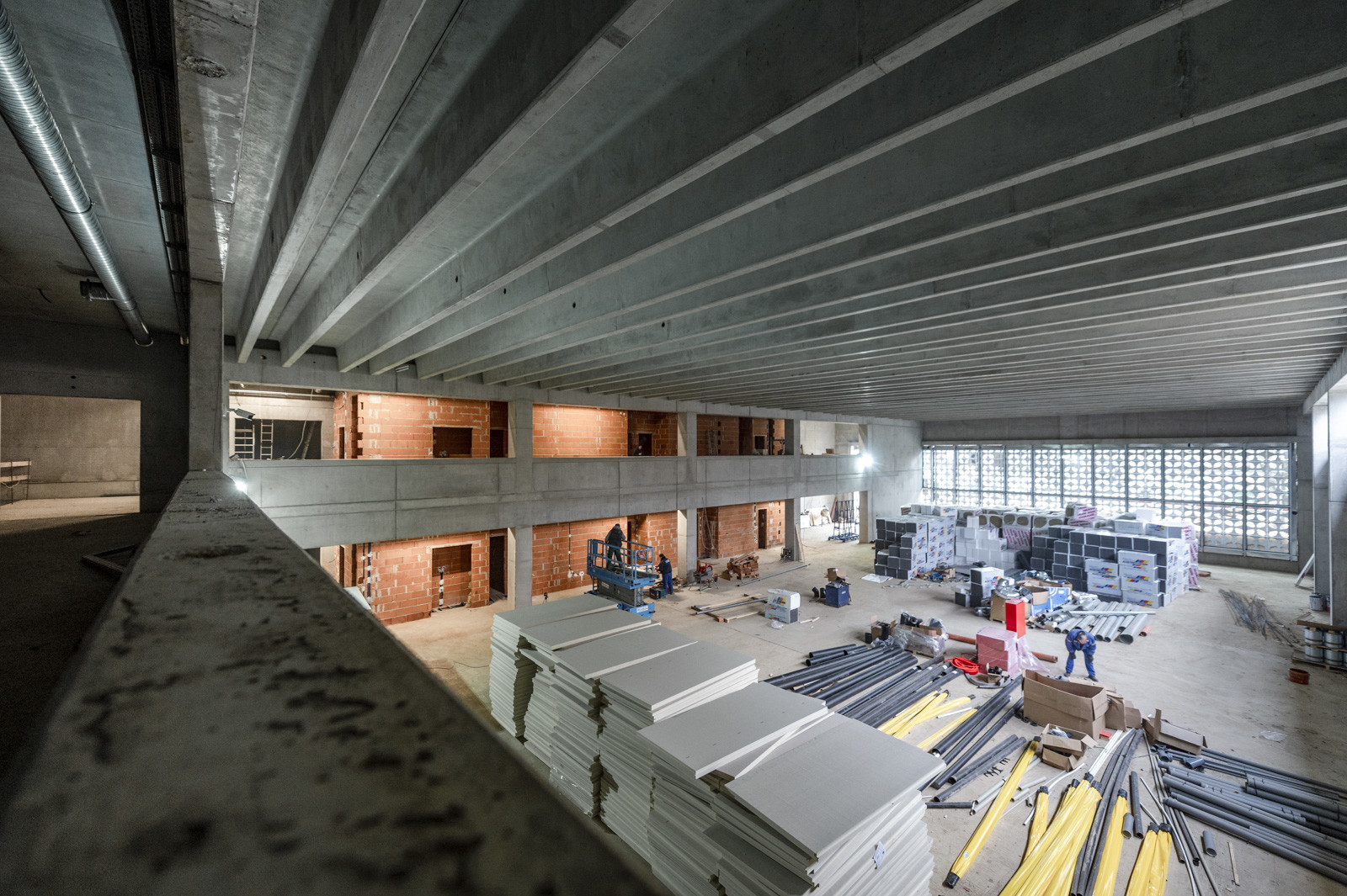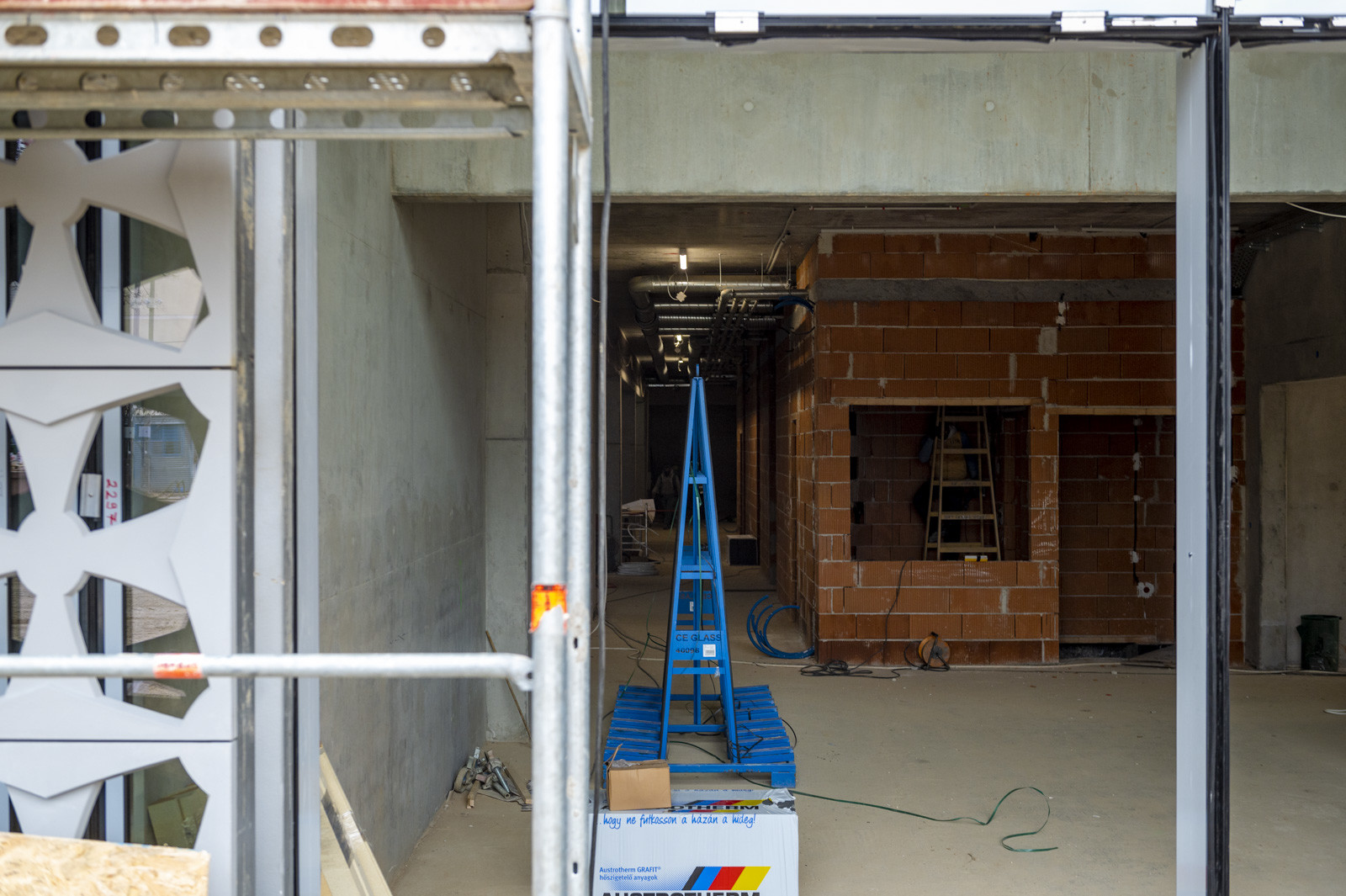 Jelenleg többek között a hőszigetelési munkák zajlanak, szerelik a homlokzati alumínium nyílászárókat és a finombeton homlokzat burkolatát, emellett a belső gépészeti és elektromos alapszereléseket is elvégzik. Rövidesen kezdődhetnek a tetőszigetelési munkák, az aljzatbetonozások, illetve a hő- és hangszigetelések fektetése.