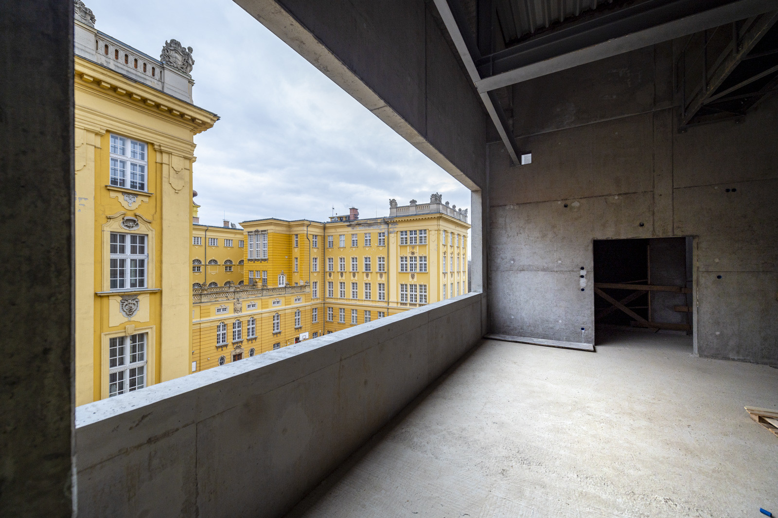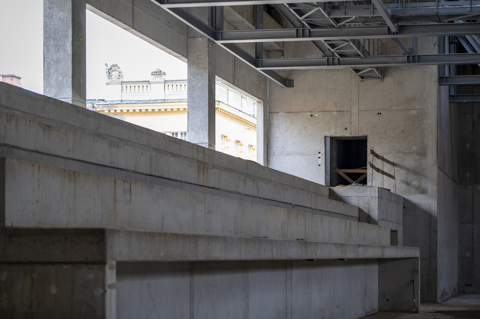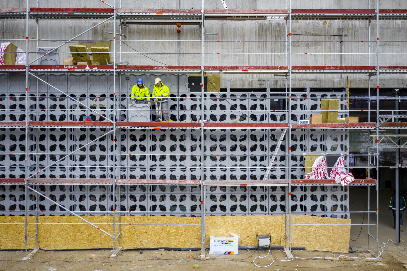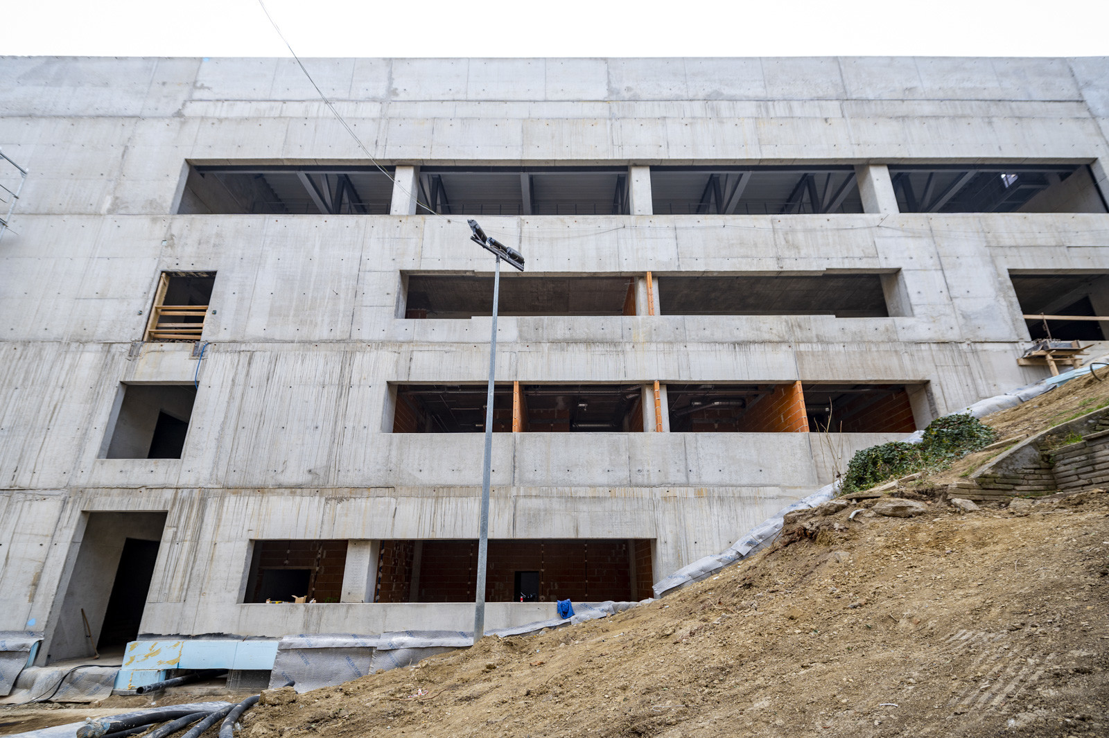 Jelenleg többek között a hőszigetelési munkák zajlanak, szerelik a homlokzati alumínium nyílászárókat és a finombeton homlokzat burkolatát, emellett a belső gépészeti és elektromos alapszereléseket is elvégzik. Rövidesen kezdődhetnek a tetőszigetelési munkák, az aljzatbetonozások, illetve a hő- és hangszigetelések fektetése.