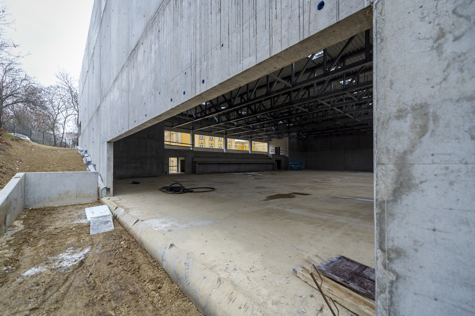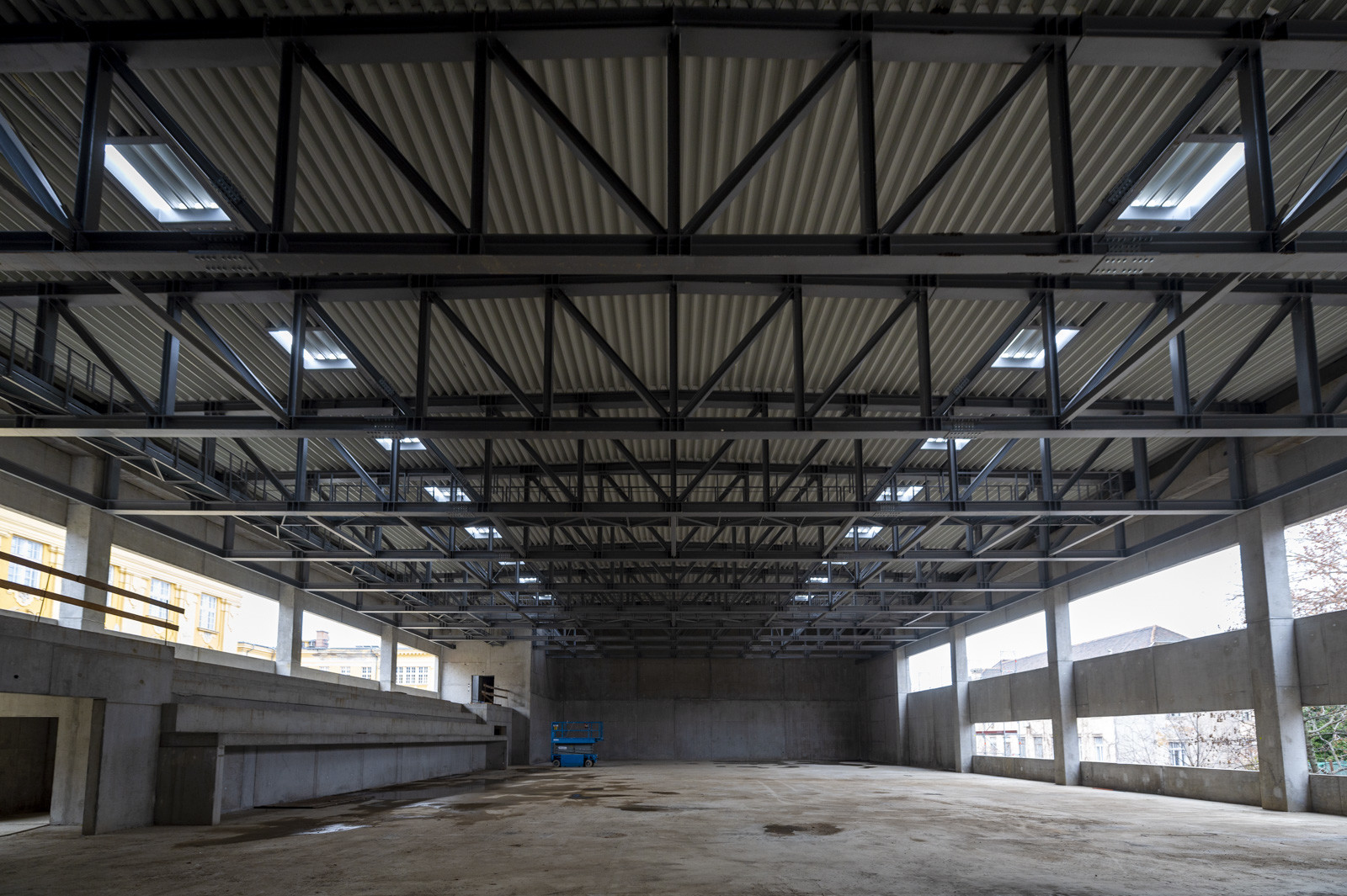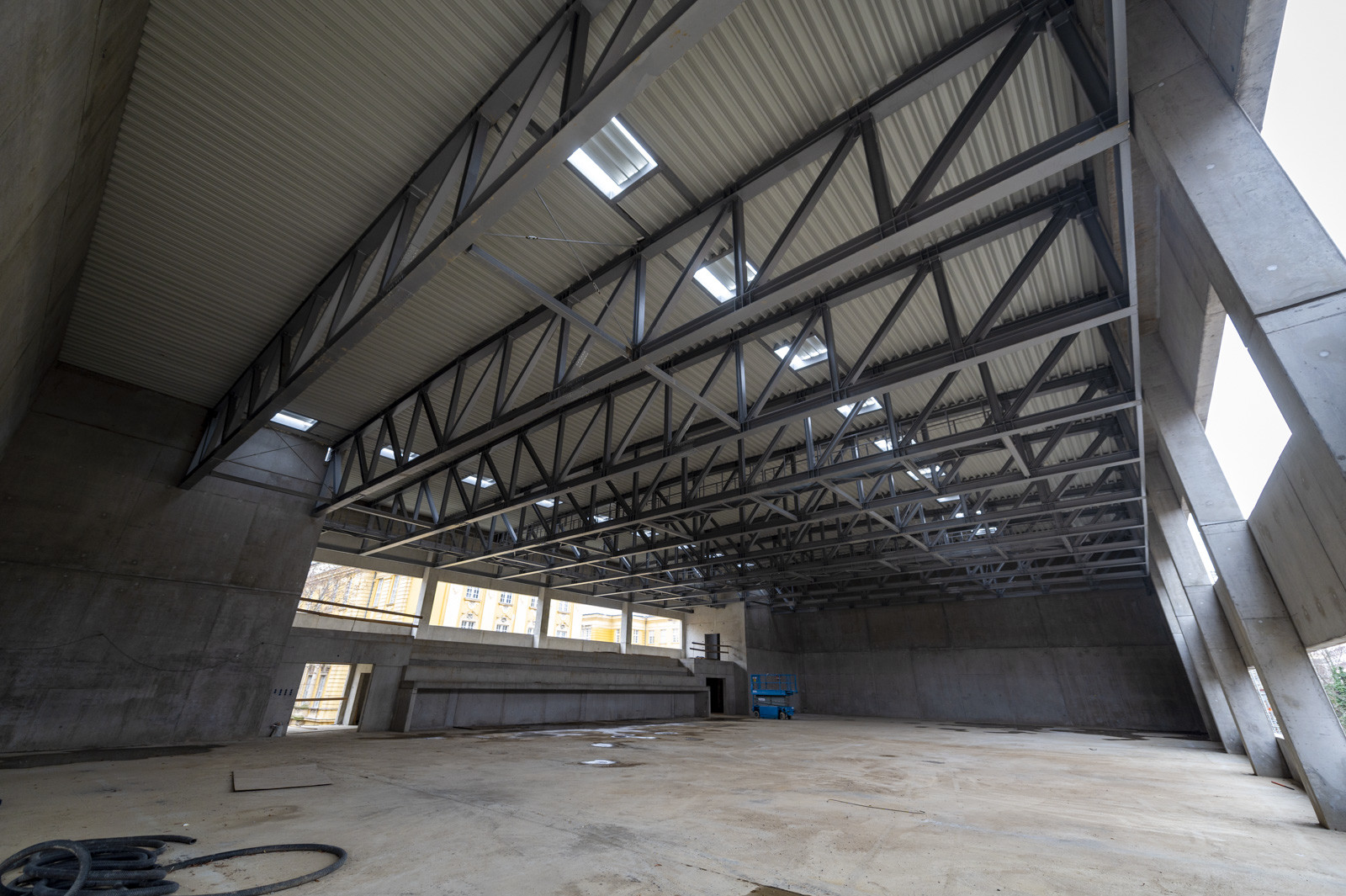 A sportcsarnok belső tereiben a látszóbeton felületeket is befejezték, és a komplett vasbeton szerkezet is a helyén van. Elkészültek az épület körüli látszóbeton támfalak és a belső válaszfalak is. A beszámolóból az is kiderült, hogy a szigetelési munkálatok során a talajnedvesség elleni védelem növelése érdekében vízzáró betont alkalmaztak a szakemberek.