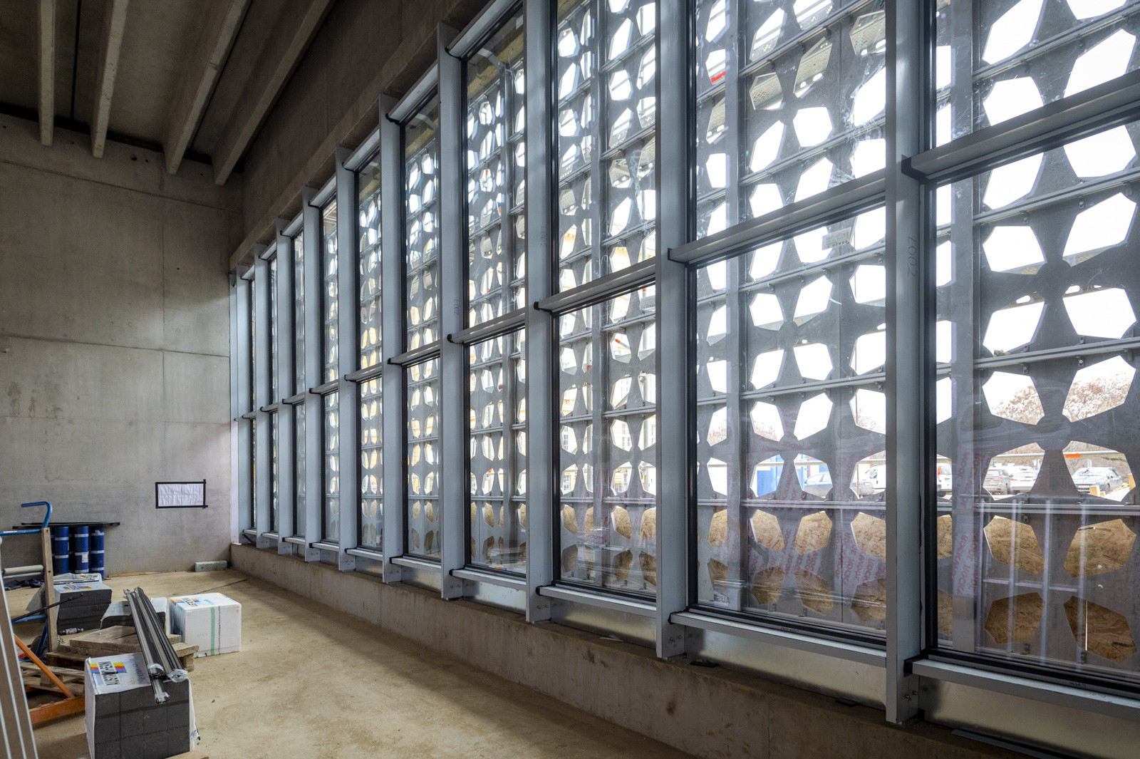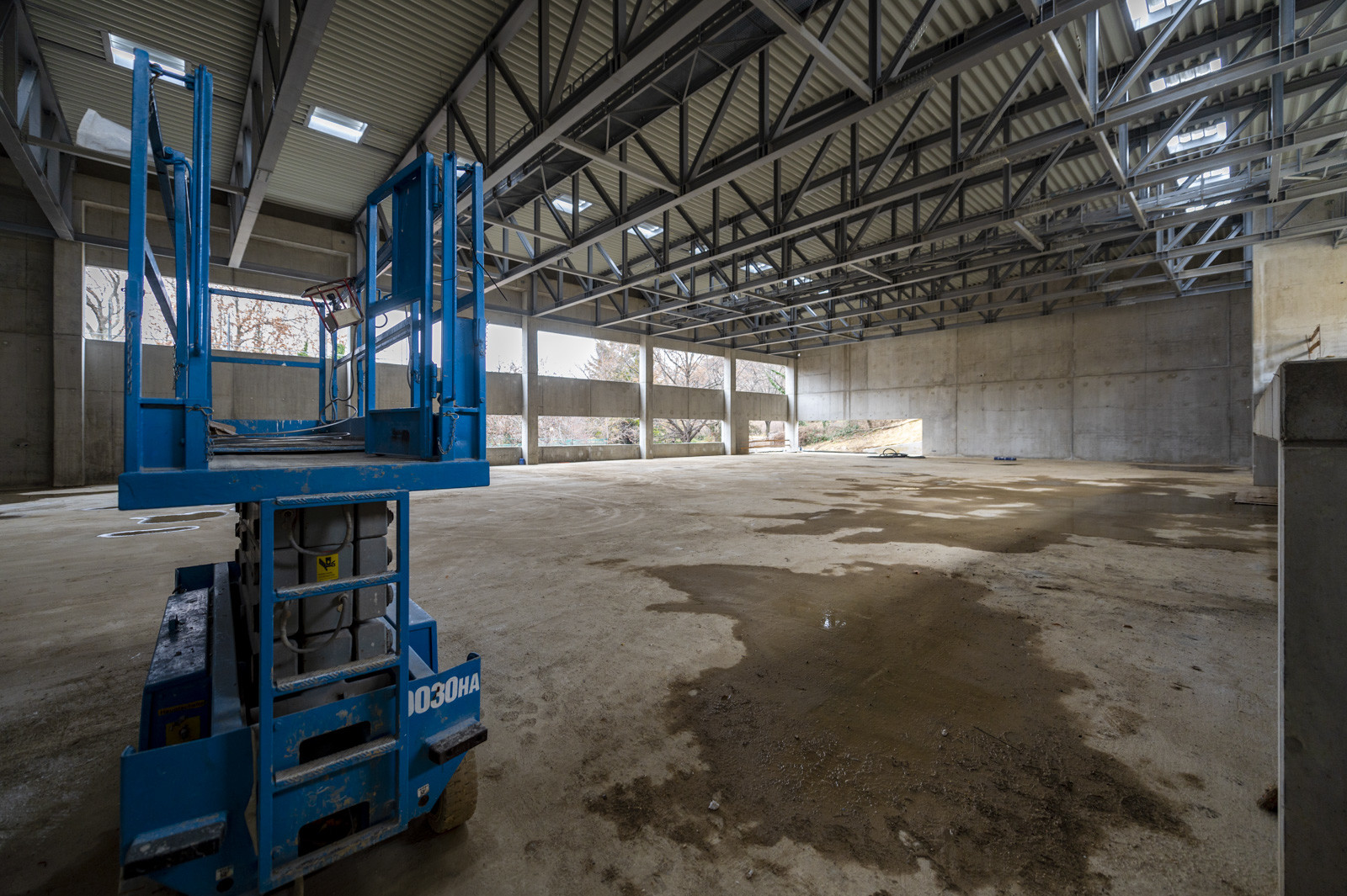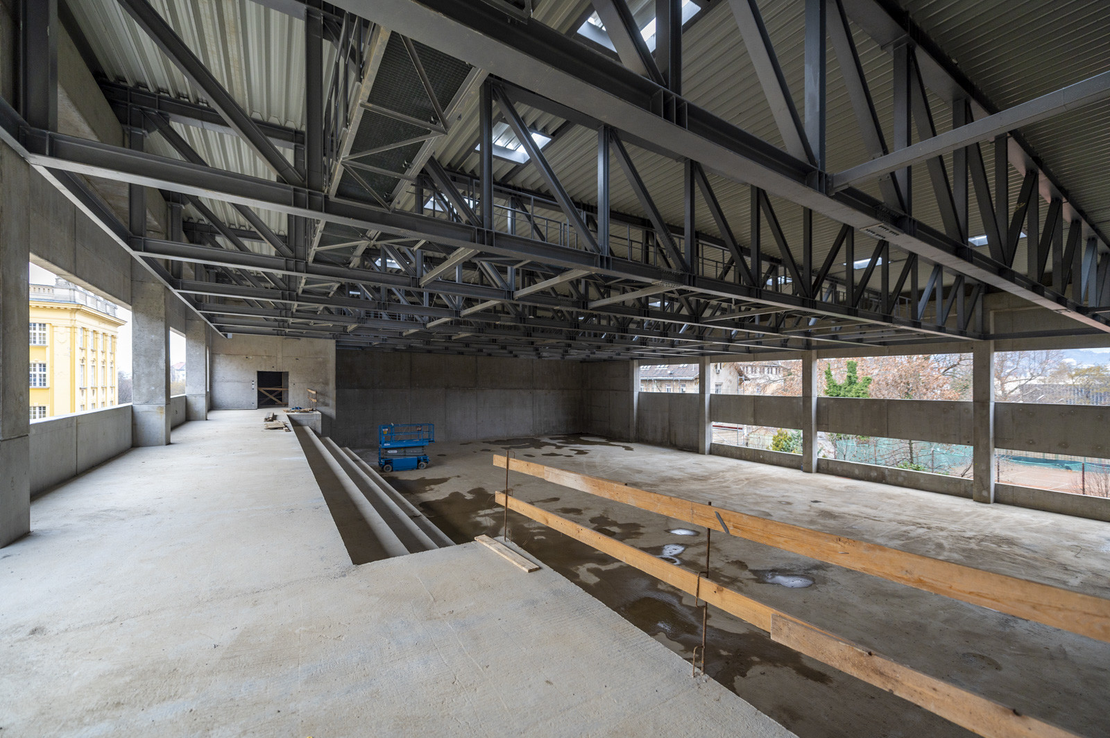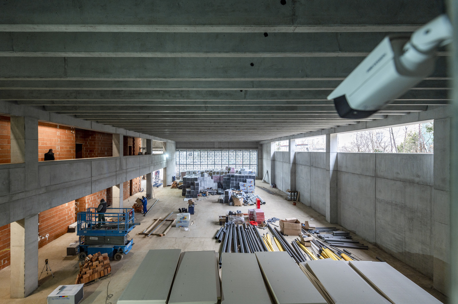 A sportcsarnok belső tereiben a látszóbeton felületeket is befejezték, és a komplett vasbeton szerkezet is a helyén van. Elkészültek az épület körüli látszóbeton támfalak és a belső válaszfalak is. A beszámolóból az is kiderült, hogy a szigetelési munkálatok során a talajnedvesség elleni védelem növelése érdekében vízzáró betont alkalmaztak a szakemberek.