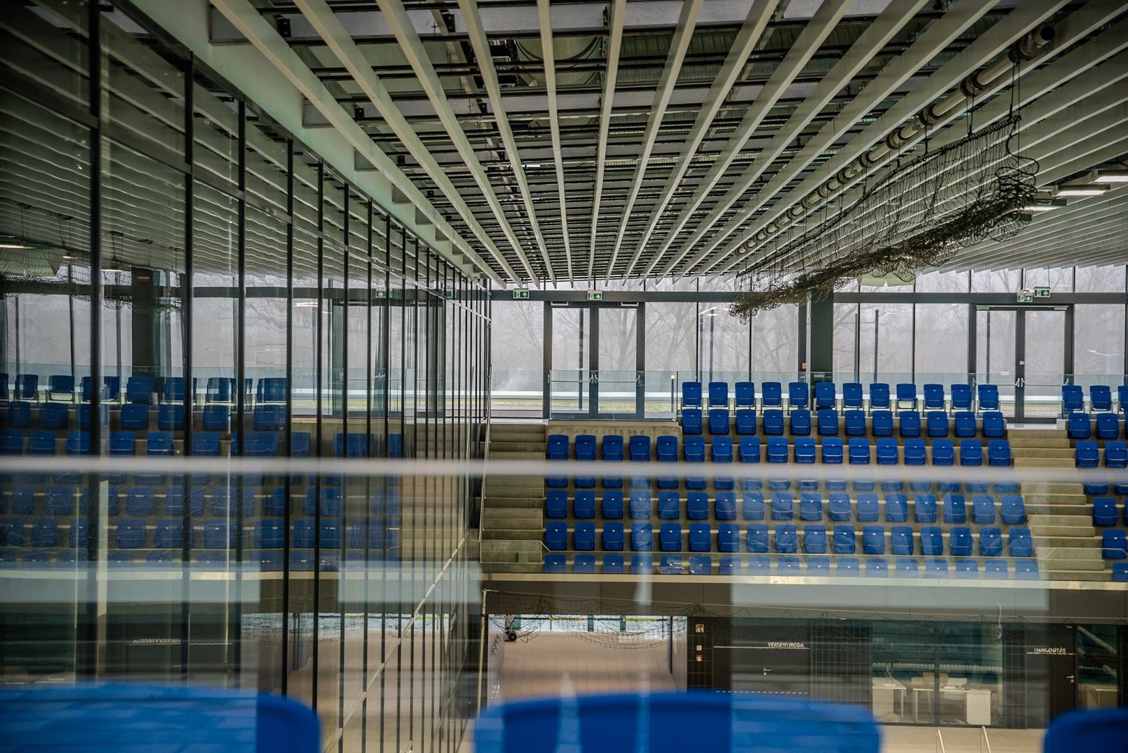 A medencecsarnok természetes megvilágítású, sötétíthető, és tévéközvetítésre alkalmas sportvilágítást is kiépítettek benne. A versenymedence mellett az uszoda része