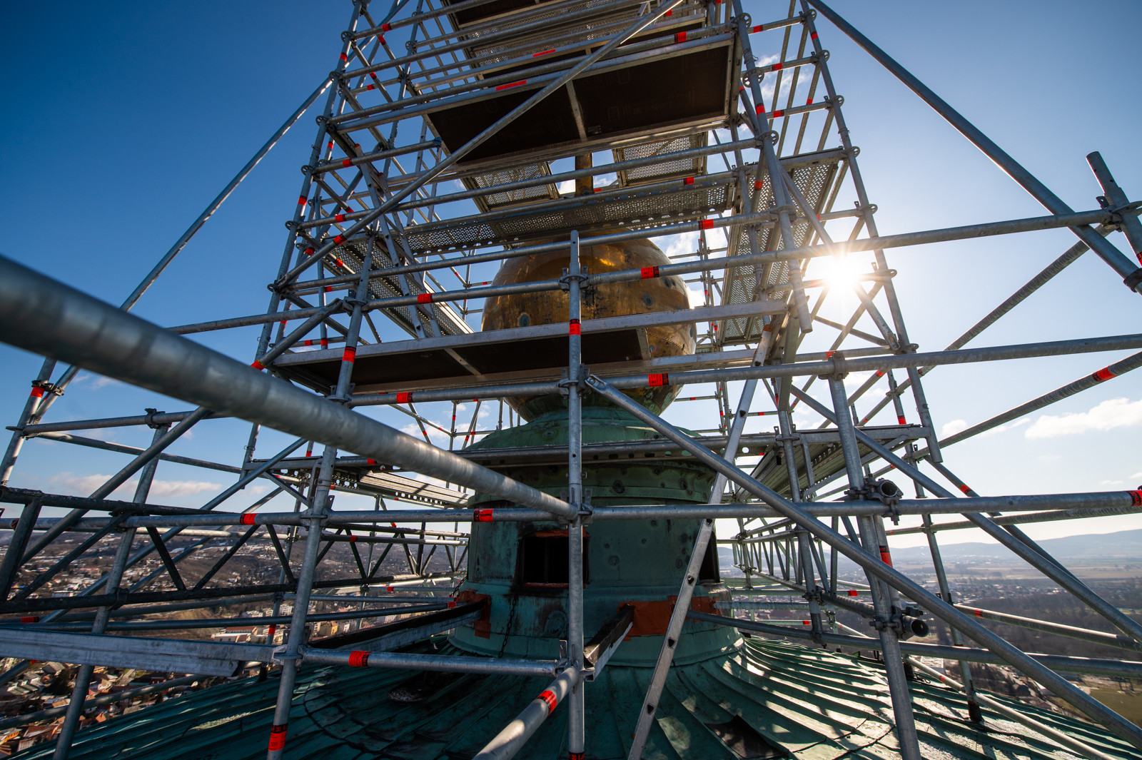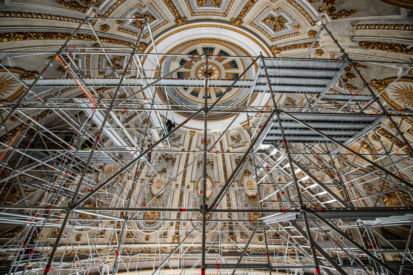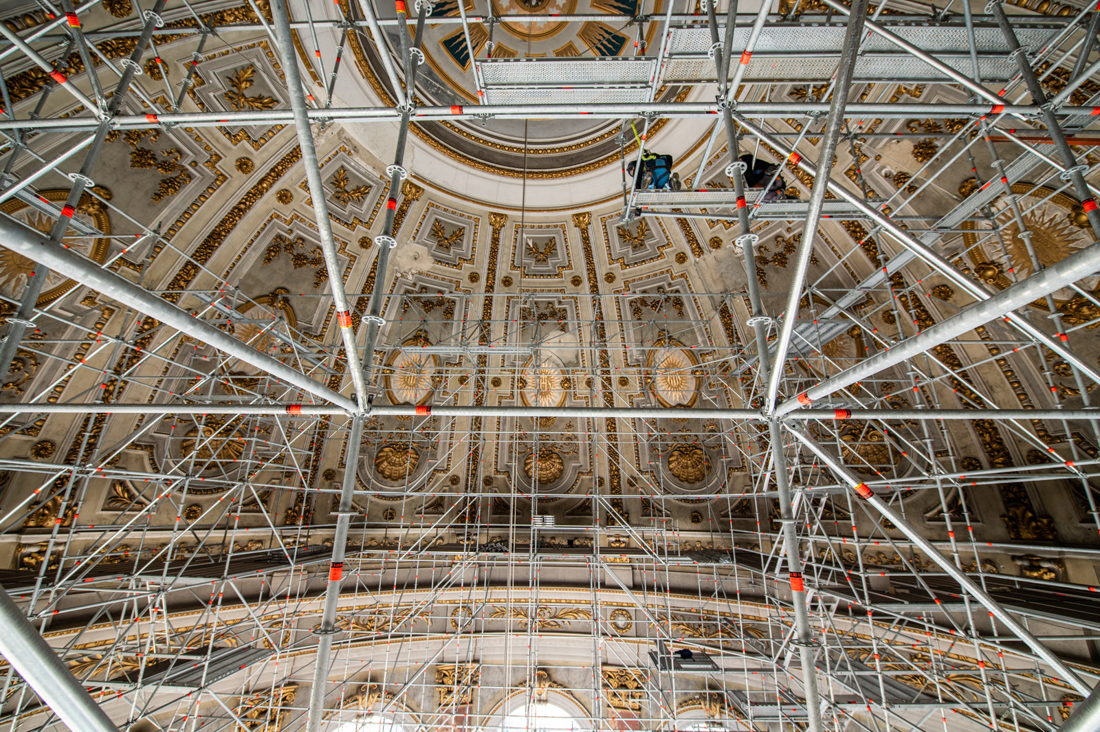 A főszékesegyház a munkák alatt látogatható marad, egyedül a tavaly ősszel kezdődött kupola külső-belső felújításához szükséges belső állvány felállításának idejére korlátozzák a templomi tér használatát. A világon is egyedülálló állványozási megoldást felvonultató Layher két műszaki szakembere, Pruzsinszki Gusztáv állványtervező építőmérnök és Tóth Patrik műszaki vezető tájékoztatta lapunkat a munkálatok részleteiről.