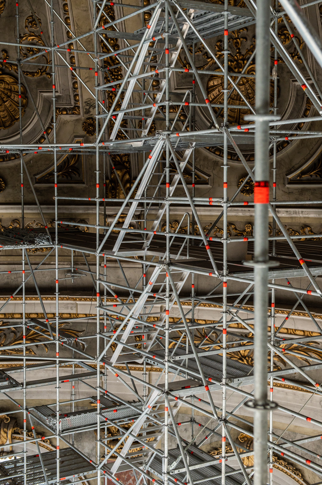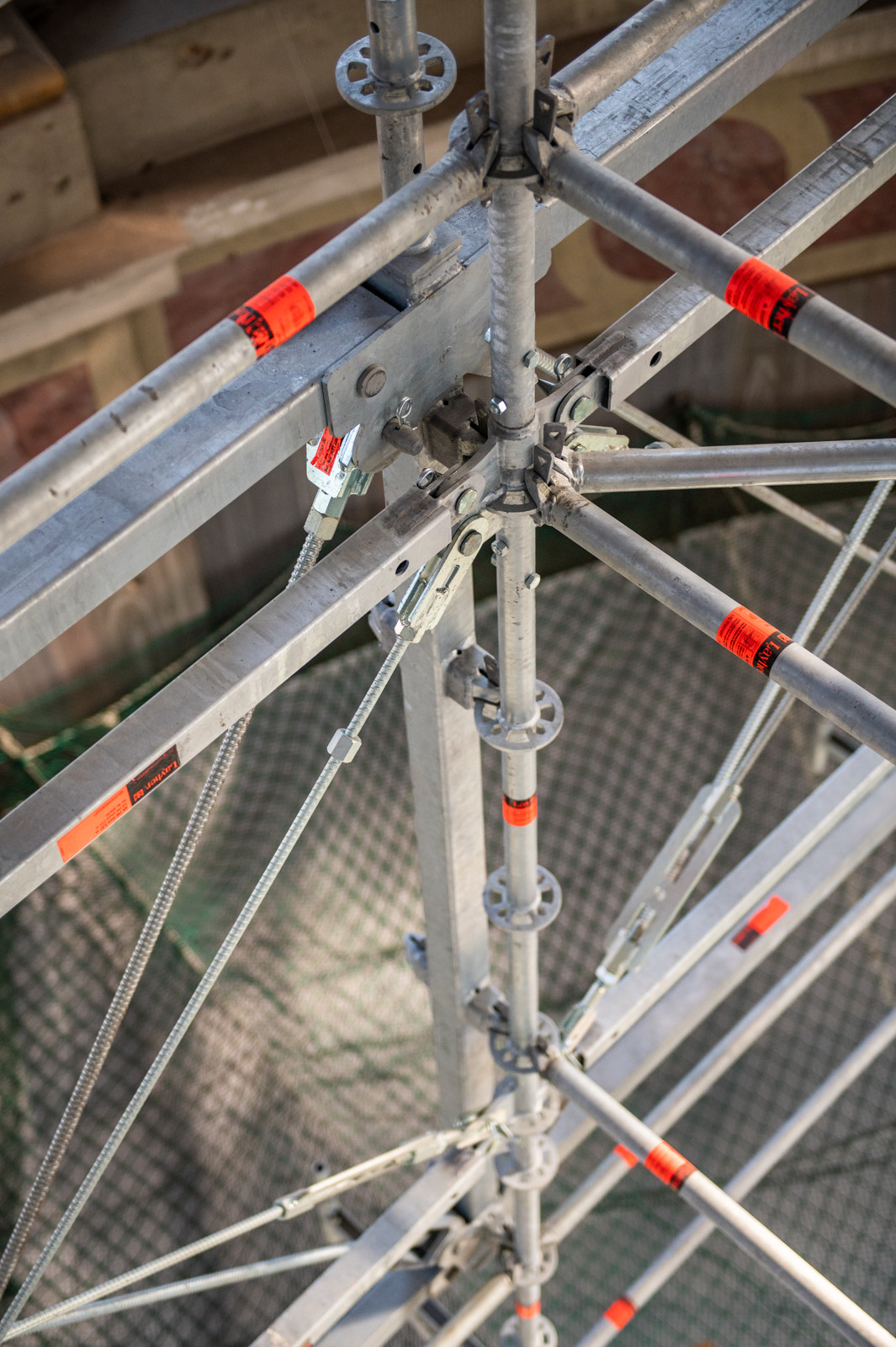 Két dupla Bridge szerkezet hidalja át az ablakokat, melyeket a Layher Allround nagy fesztávú és nagy teherbírású FW hídja köt össze. Ennek célja, hogy az állvány a fal mellett körben megépíthető legyen folytatólagosan. Erre a tartószerkezetre került a restauráláshoz szükséges munkaállvány, amelyet a flexibilis Allround állványból építettek. Így kényelmes és biztonságos munkafelületeket tudtak kialakítani a szakembereknek.