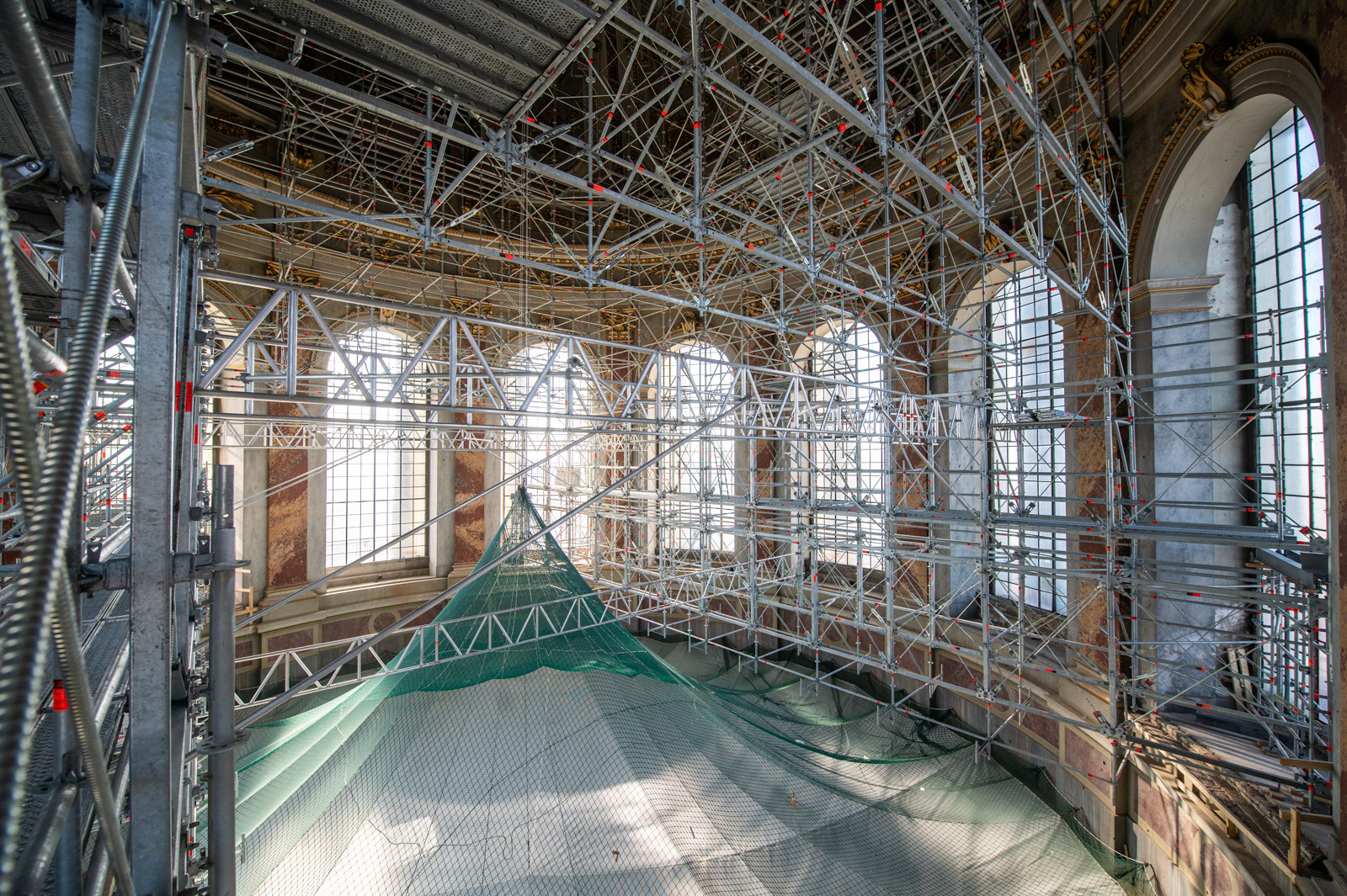 A további munkákról Pruzsinszki Gusztáv elmondta, már elkészült a kereszt állványzata, illetve a kupola tetőterének belső állványa is, melyről az acélszerkezet korrózióvédelmét és a szükséges elemcseréket végzik. A kupolafedél alatti rész esetében is jól átgondolt állványmegoldásra volt szükség, hiszen olyan állványzatot kellett felépíteni, amely befér a külső és a belső kupola közé. Ezt a feladatot szintén a flexibilis Layher Allrounddal oldották meg.