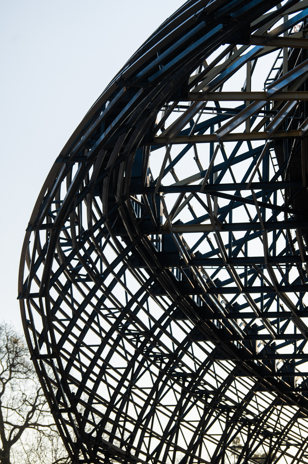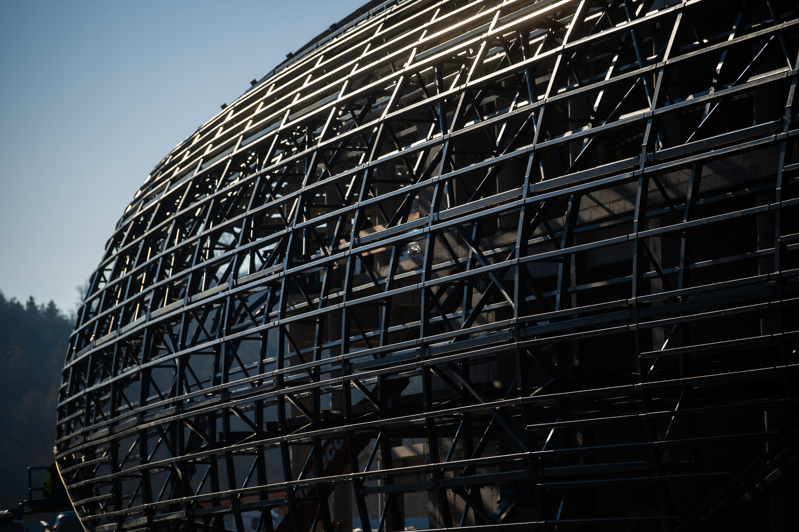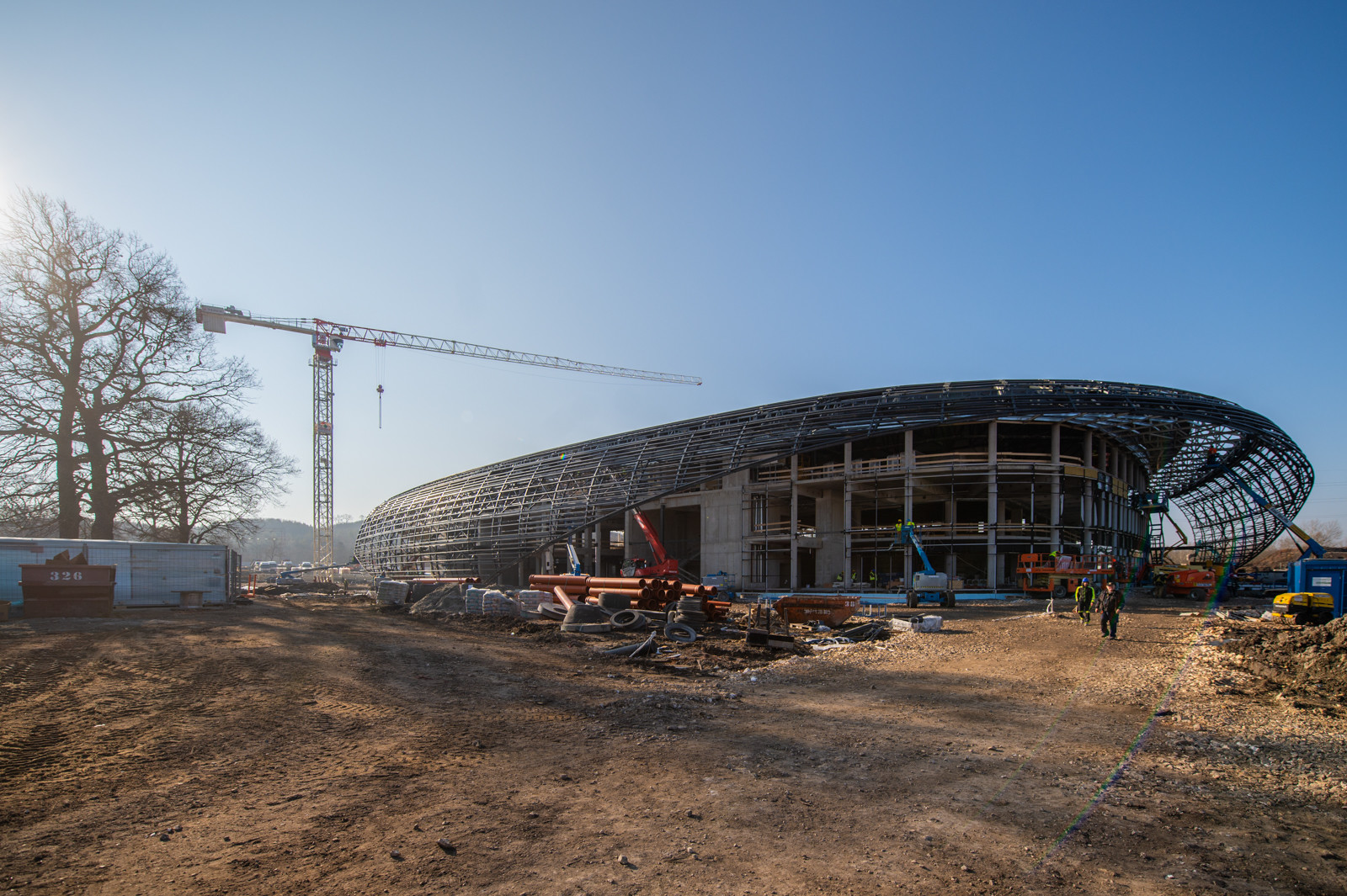 Az épület látványosan kezdi elnyerni végső, különleges „kavics” formáját a szerkezetépítés befejező szakasza felé közeledve.