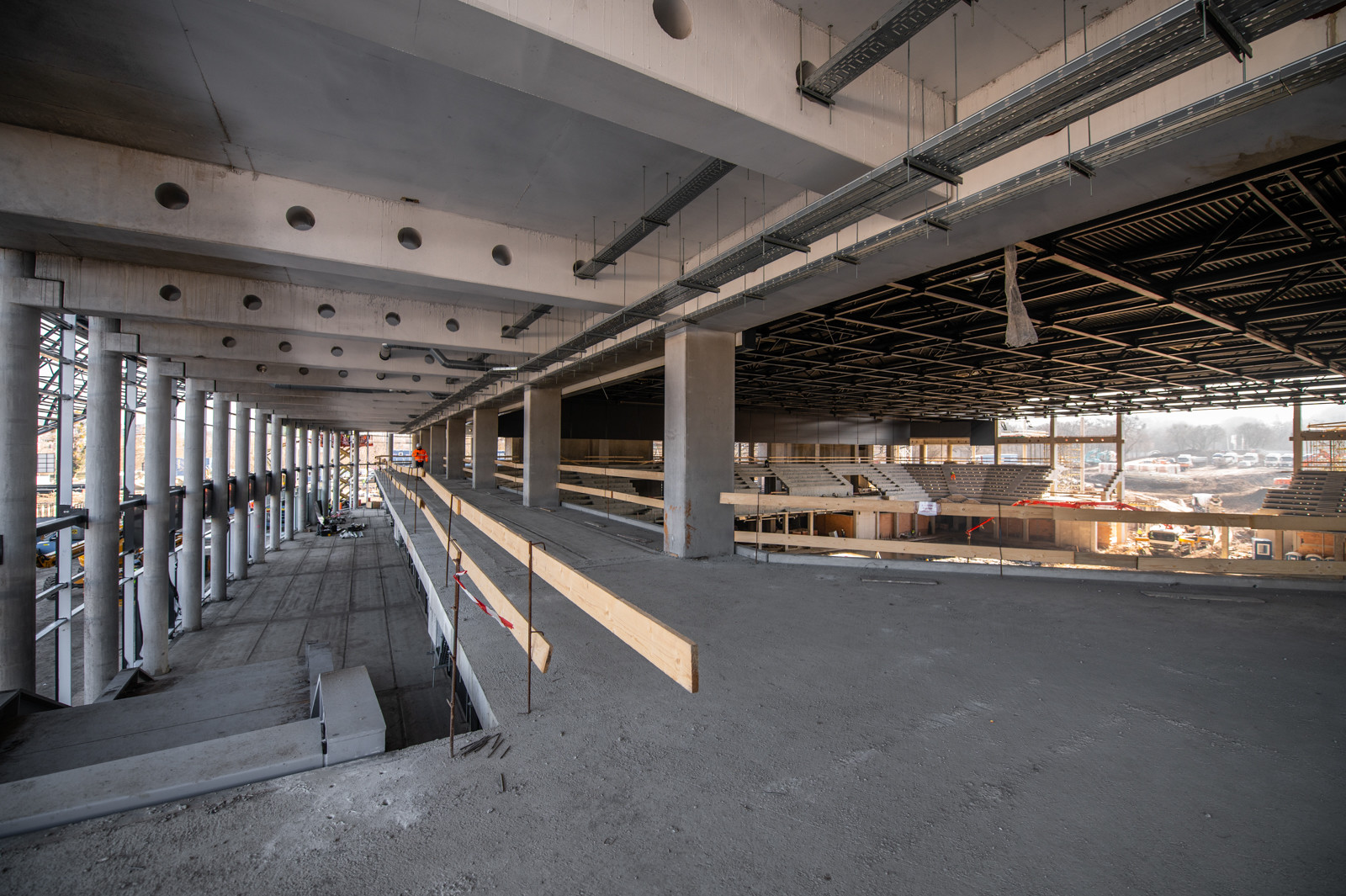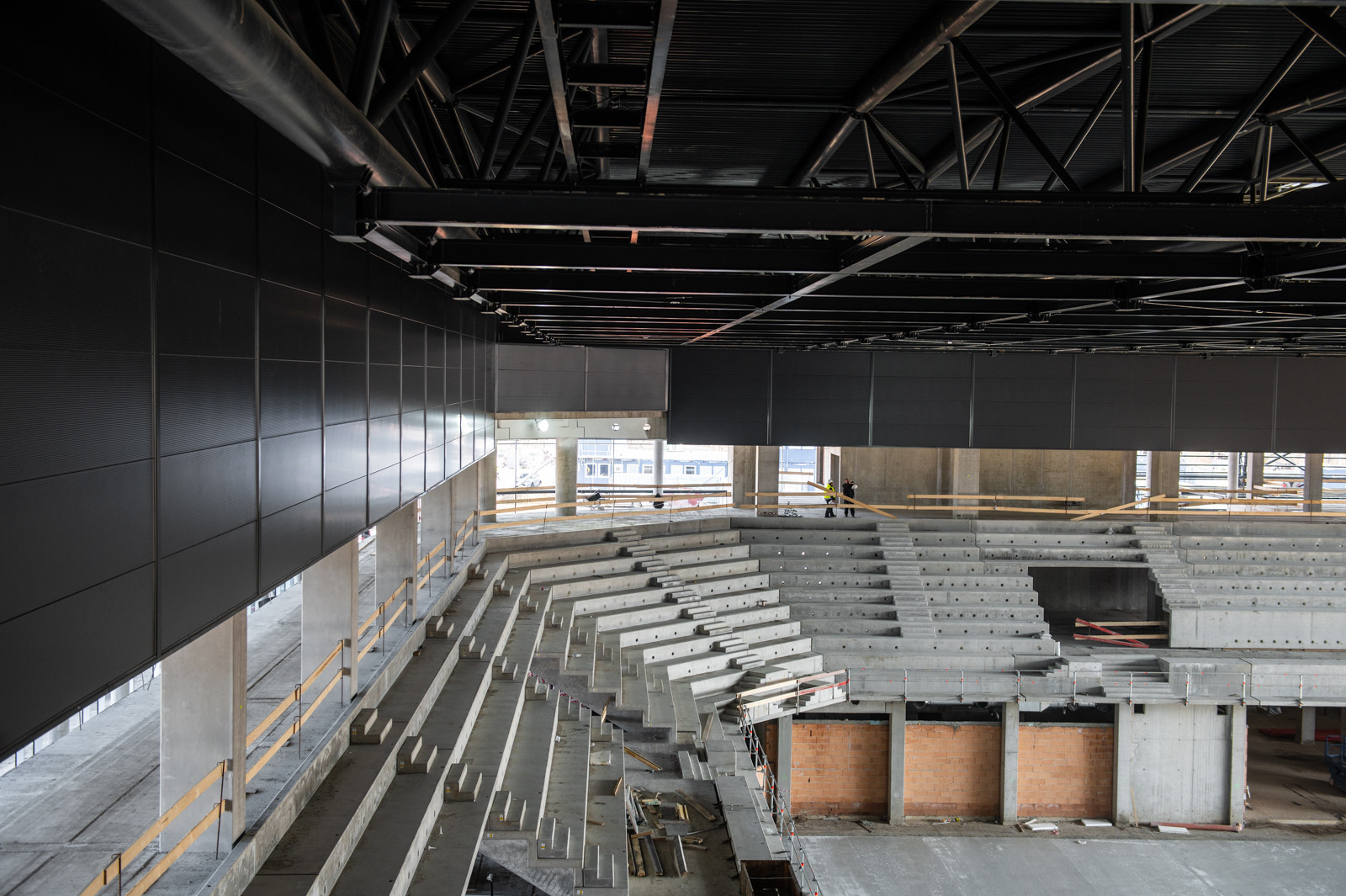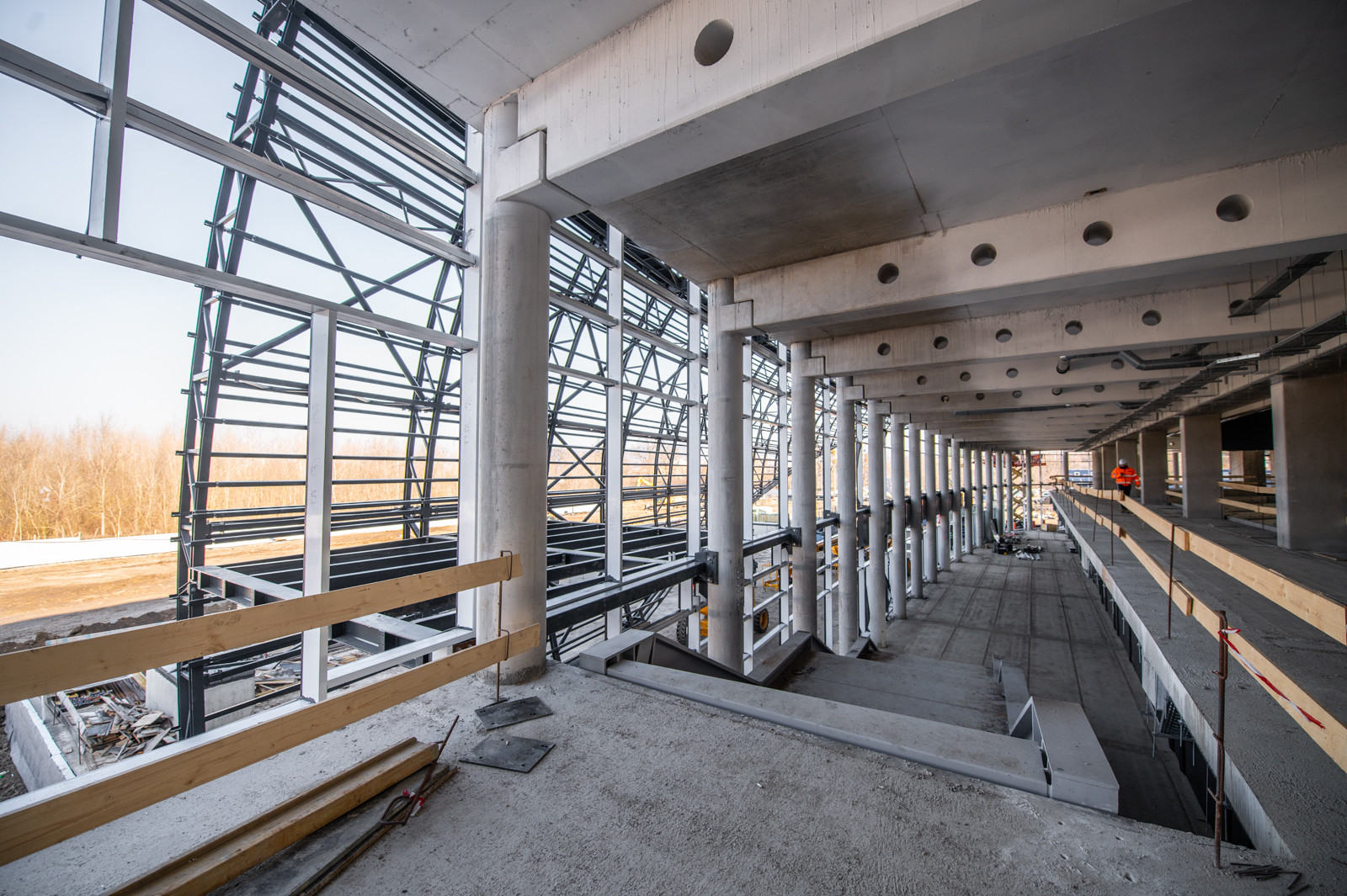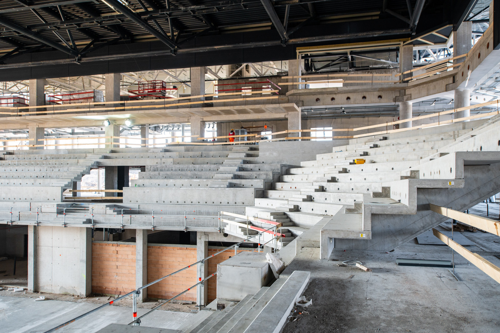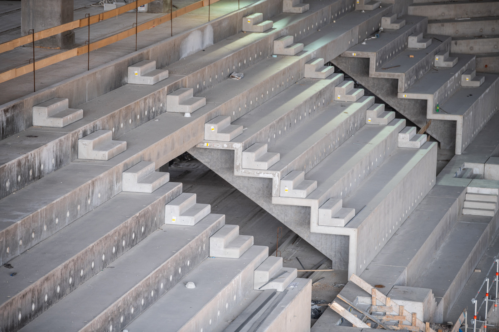 A főtartók elhelyezését követően beépítésre kerültek a vasbeton lelátó-, és hozzá kapcsolódó lépcsőelemek, mellyel a küzdőtér is megkapja végleges formáját.