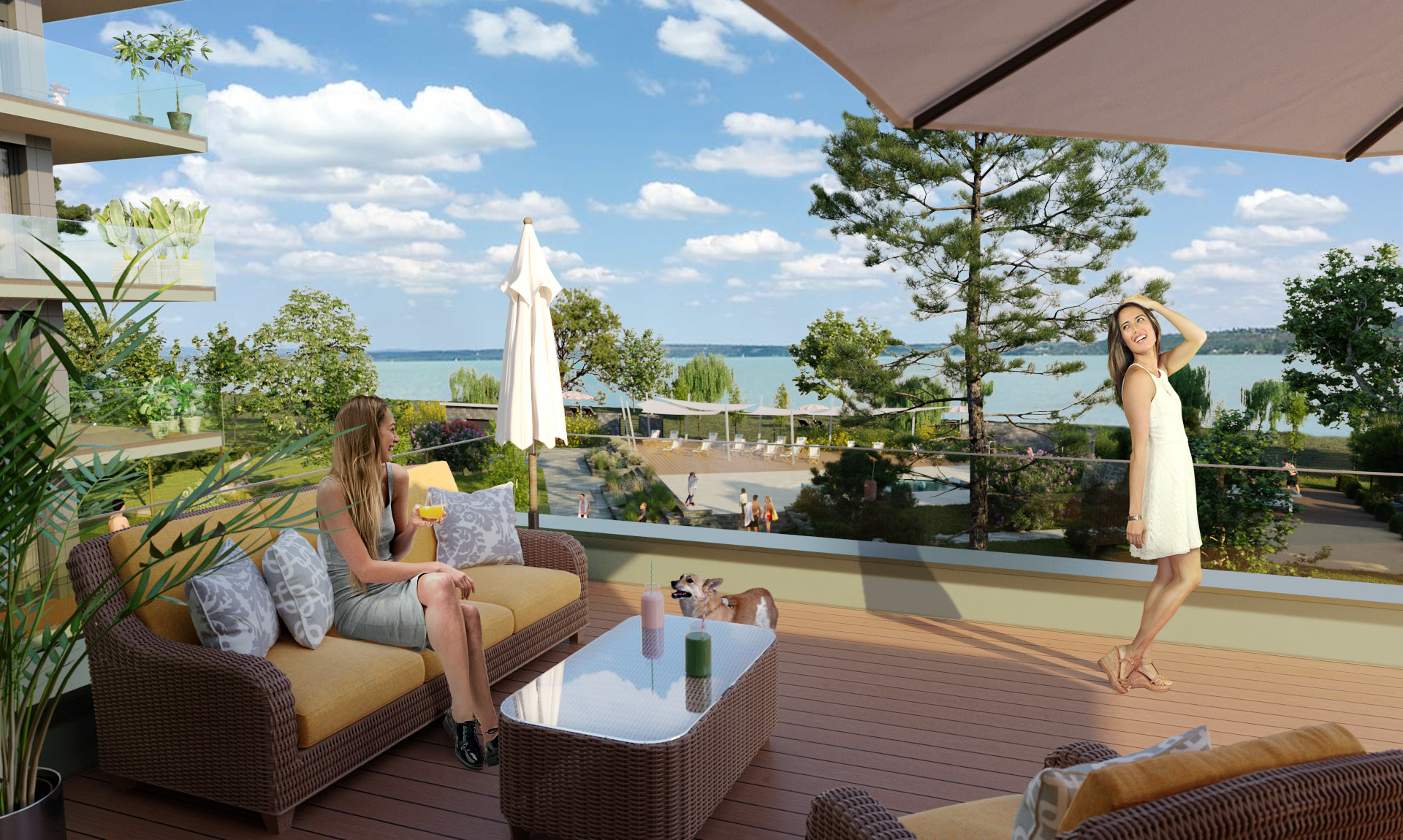 Mindkét épületrész legfelső emeletén különleges penthouse lakások épülnek. A balatoni kilátást pontmegfogott üvegkorlátok biztosítják az erkélyekről, emellett parkosított udvar, kültéri medence, és egy 50 férőhelyes parkoló is épül az otthonokhoz. A közel nulla energiaigényű, a 2021-ben életbe lépő energetikai követelményeknek is megfelelő otthonok további előnye, hogy az új tulajdonosok részben berendezetten, gépesített konyhával, azonnal beköltözhető formában vehetik át ezeket.