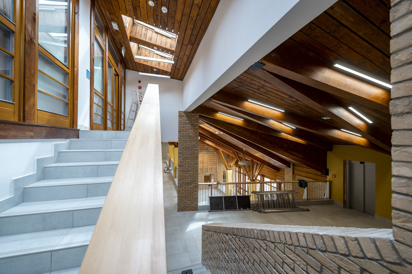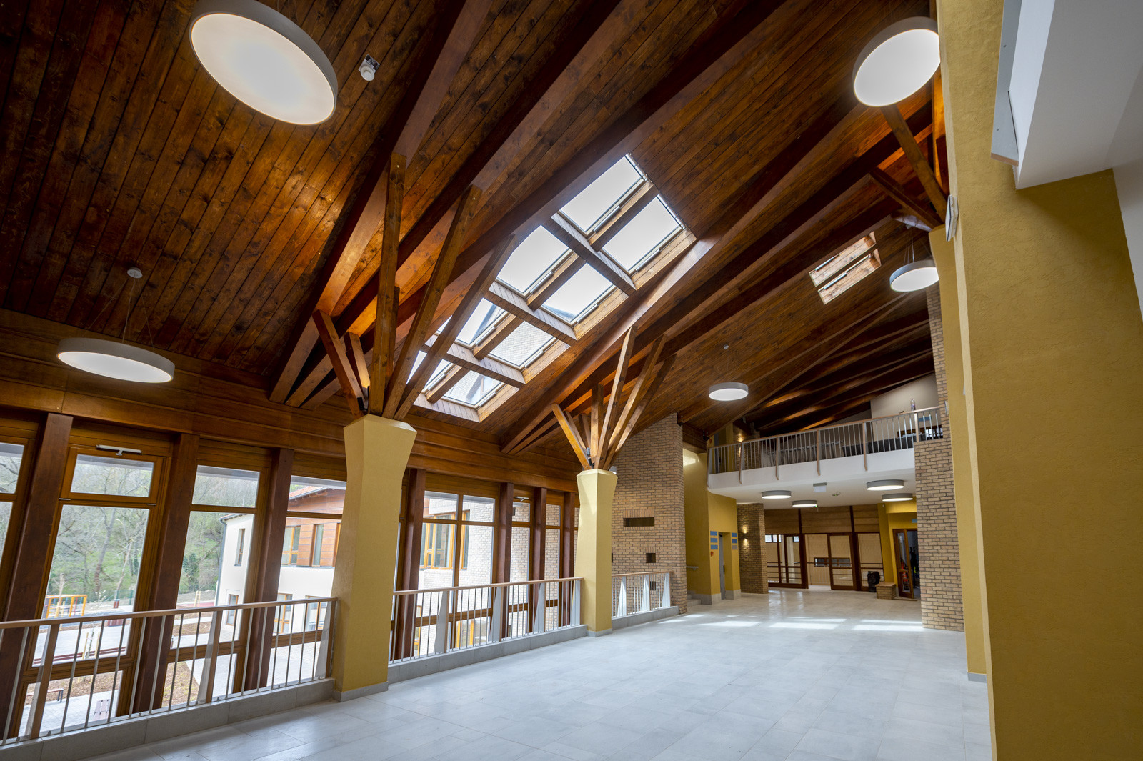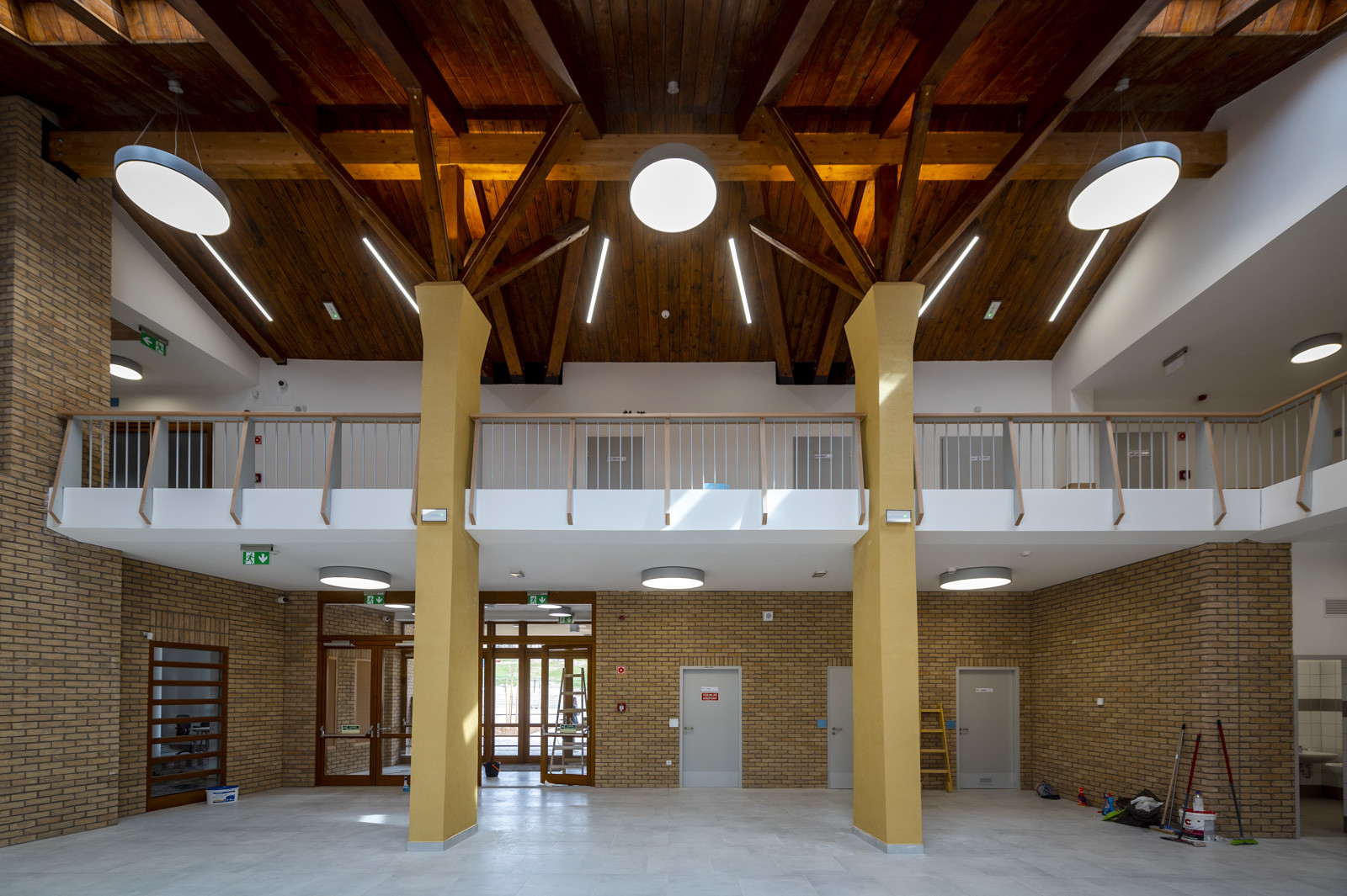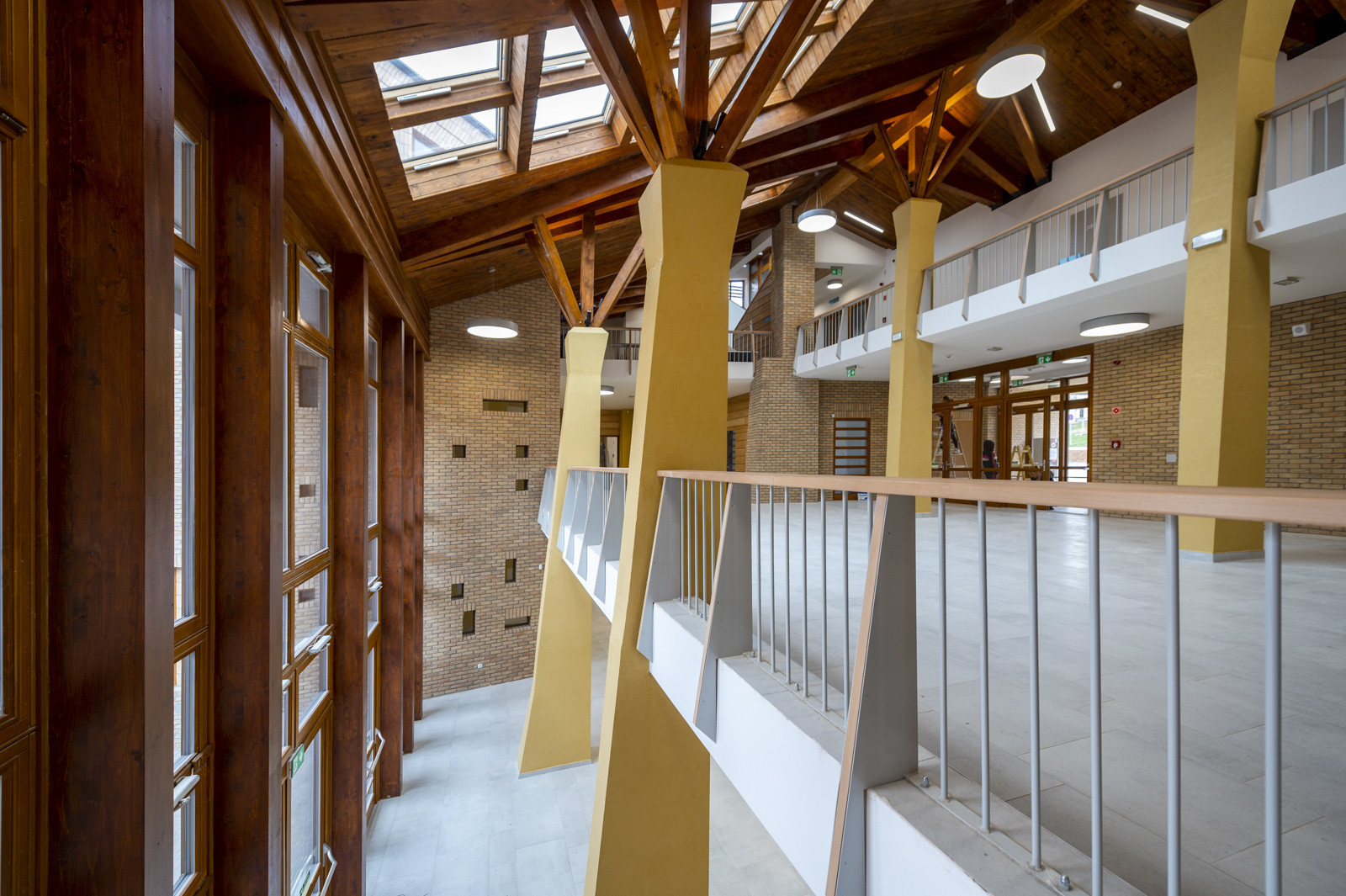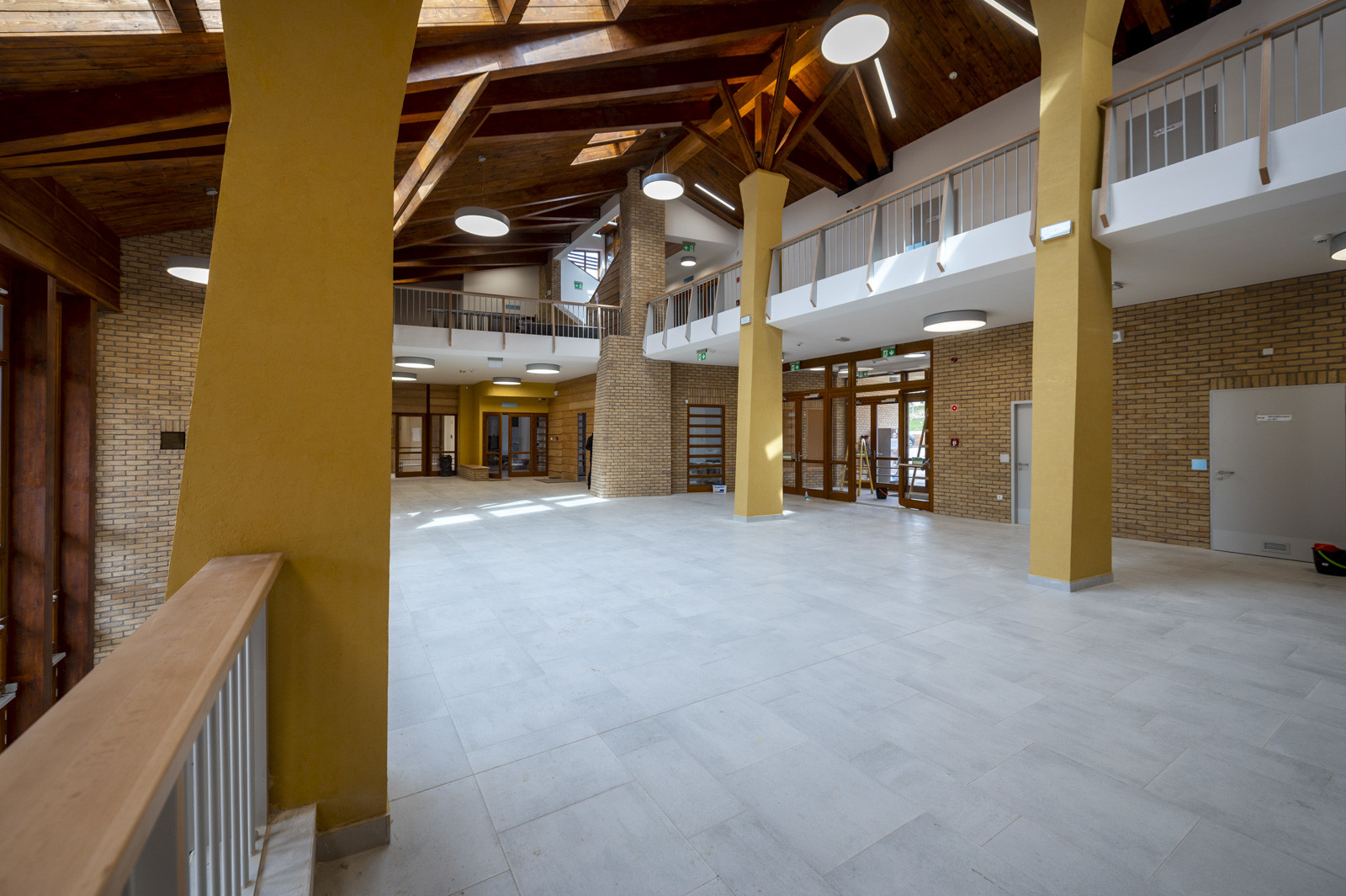 A szakember elmondta, multimédiás könyvtár és napelemekkel fedett tornaterem is helyet kapott a projektben, melyet íves toldott rétegragasztott fatetőszerkezettel fedtek le és 22 méteres fesztávolságú sportpadlórendszert kapott. Ennek tetőfelületén 210 napelemtáblát is elhelyeztek.
