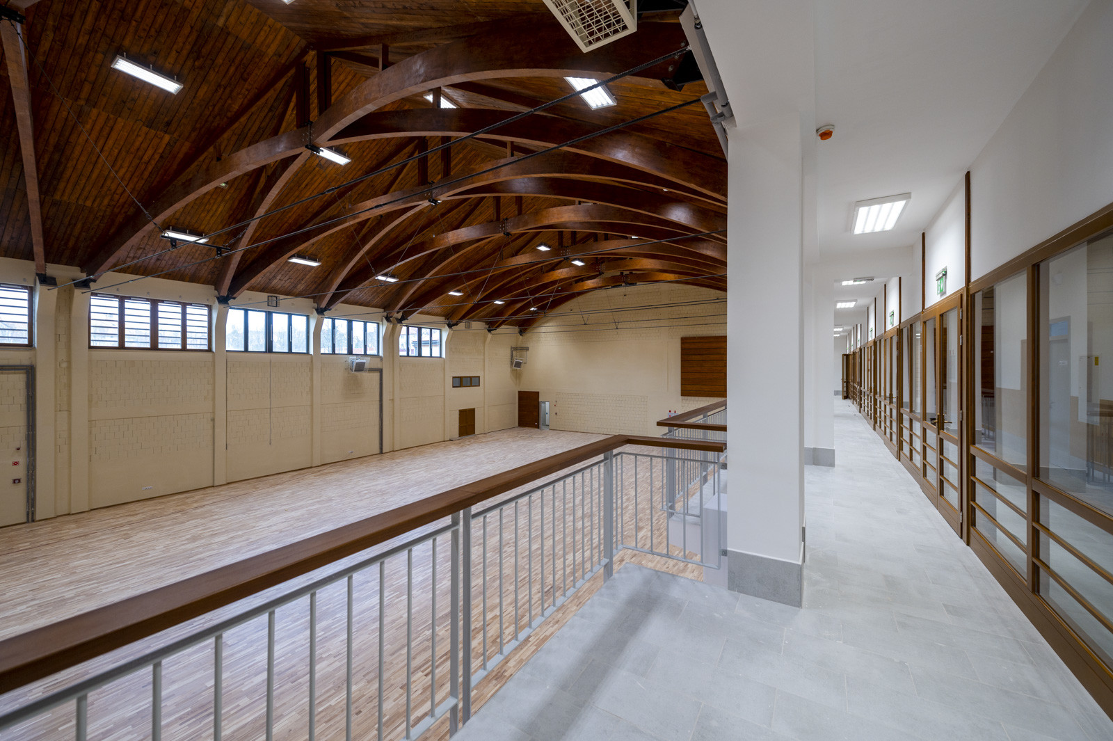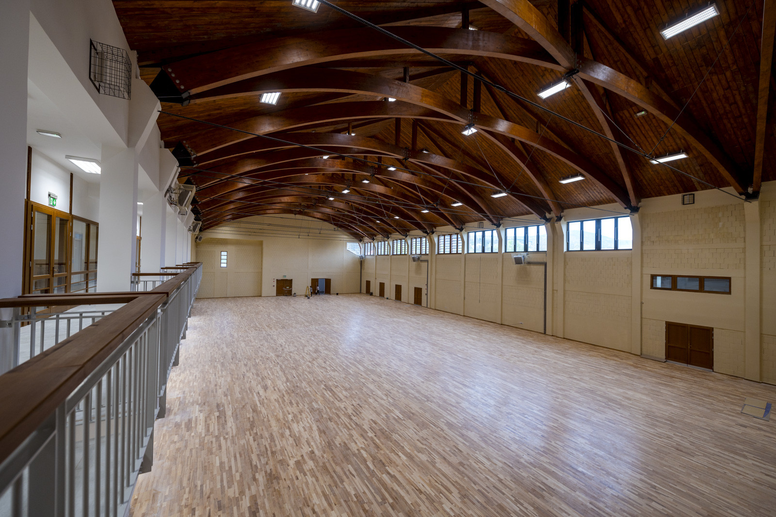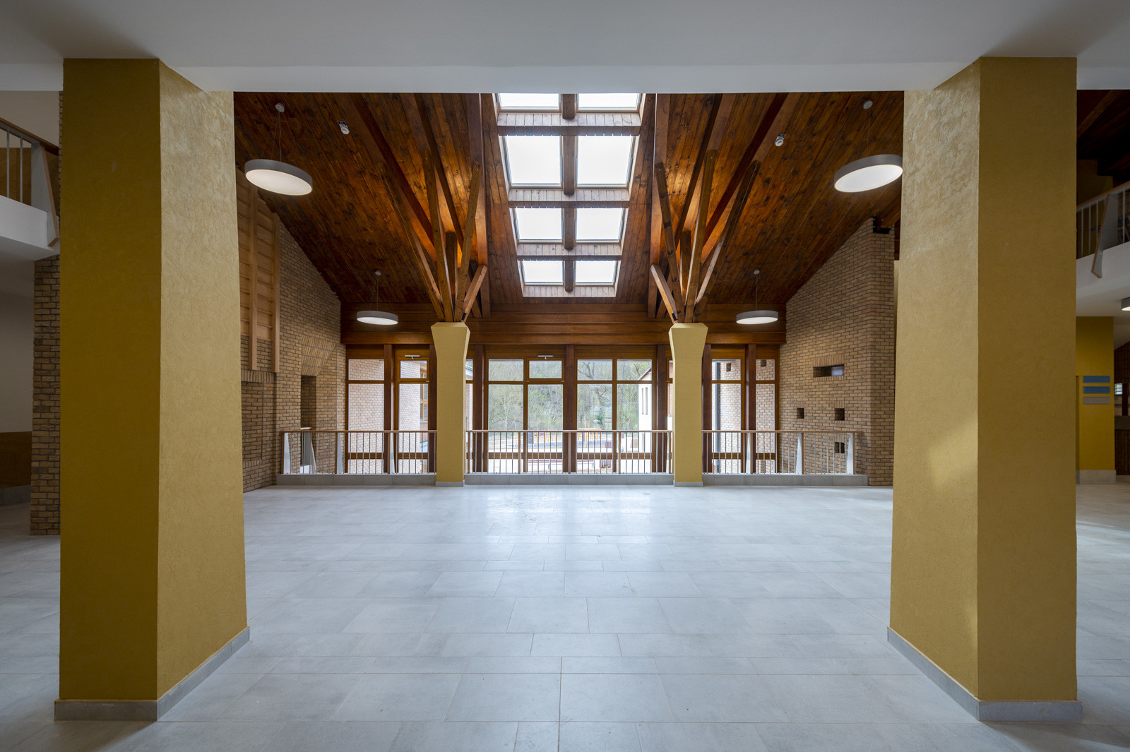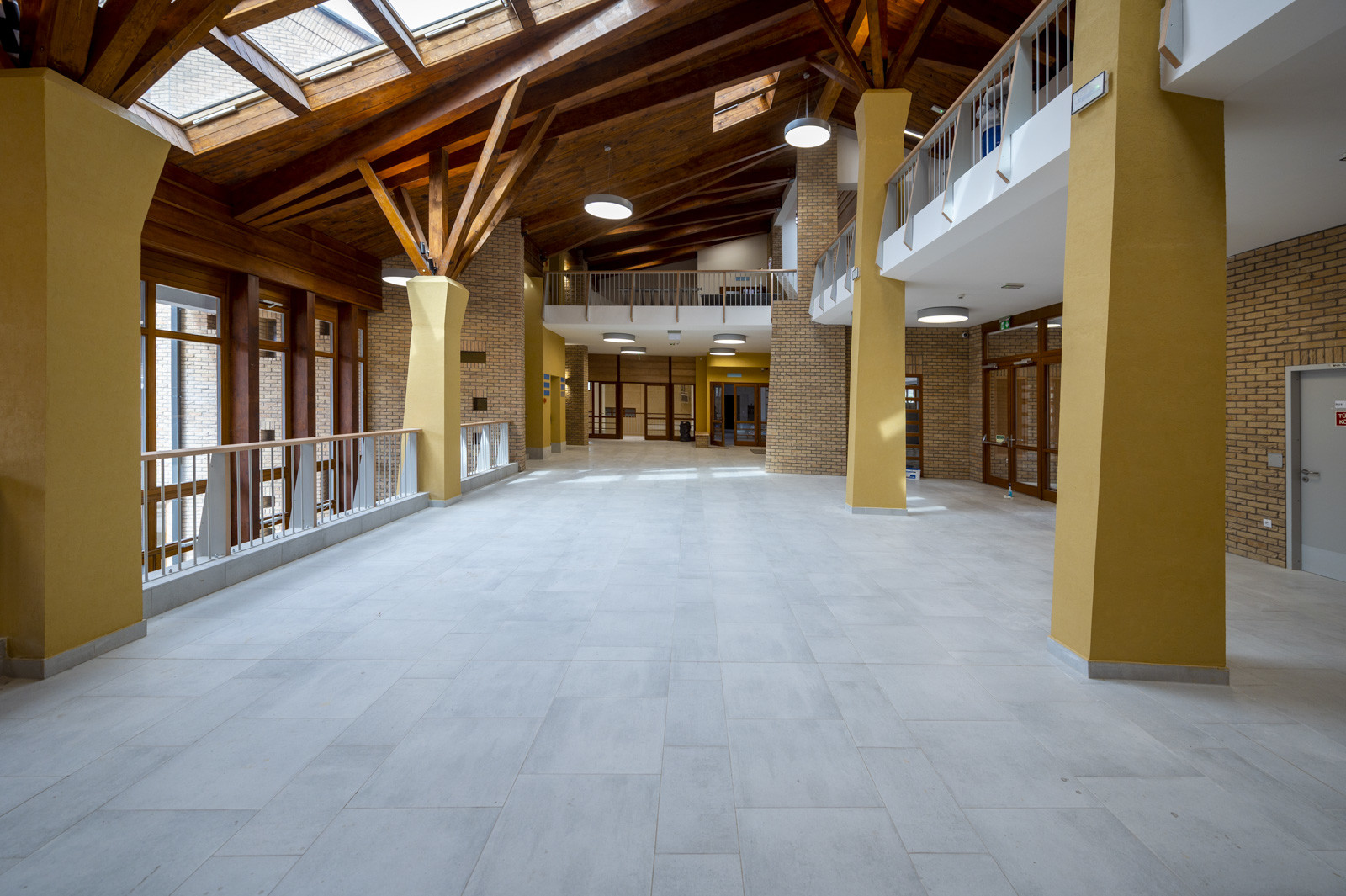 A szakember elmondta, multimédiás könyvtár és napelemekkel fedett tornaterem is helyet kapott a projektben, melyet íves toldott rétegragasztott fatetőszerkezettel fedtek le és 22 méteres fesztávolságú sportpadlórendszert kapott. Ennek tetőfelületén 210 napelemtáblát is elhelyeztek.