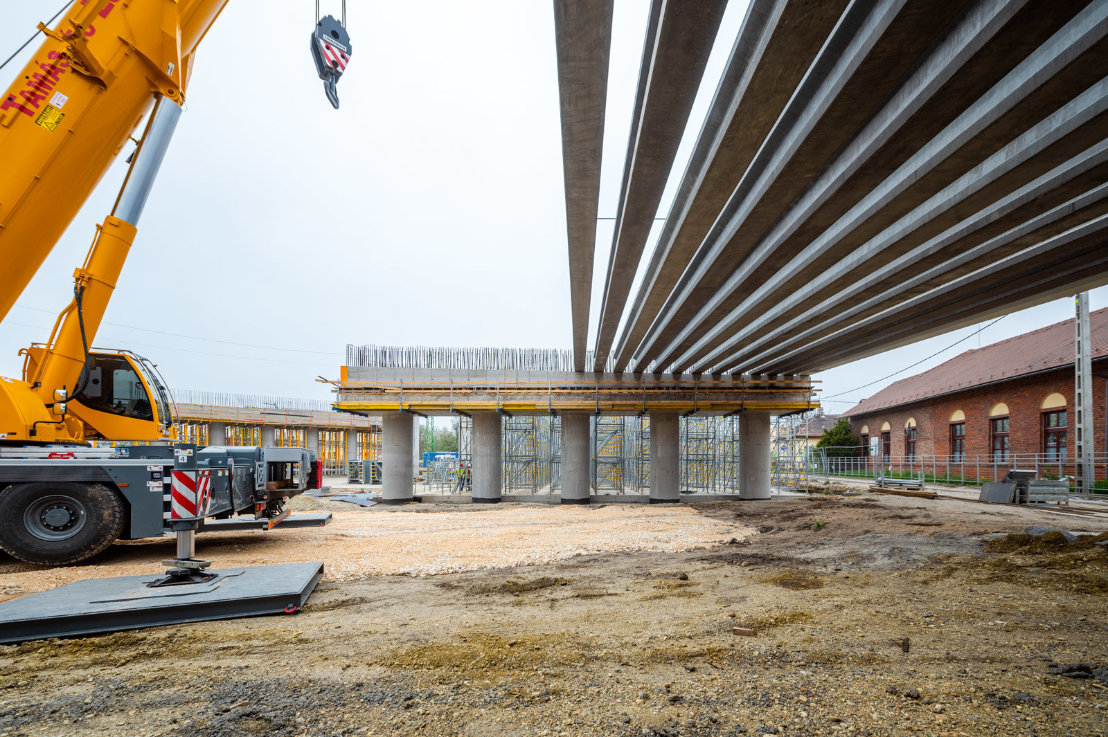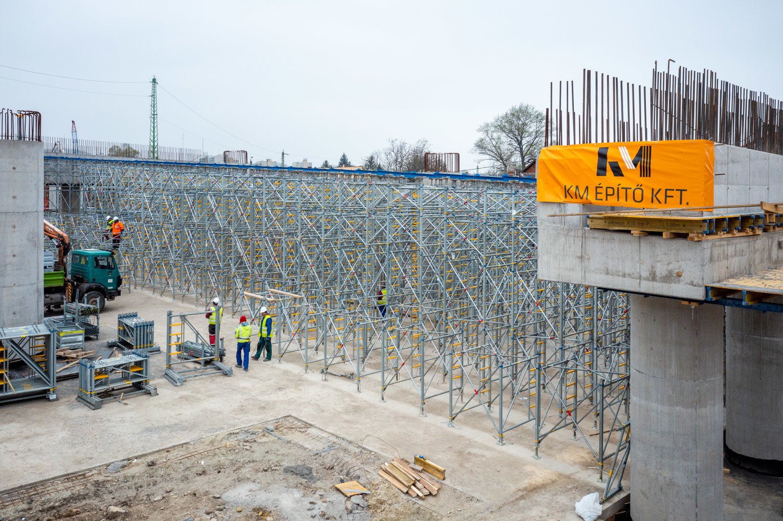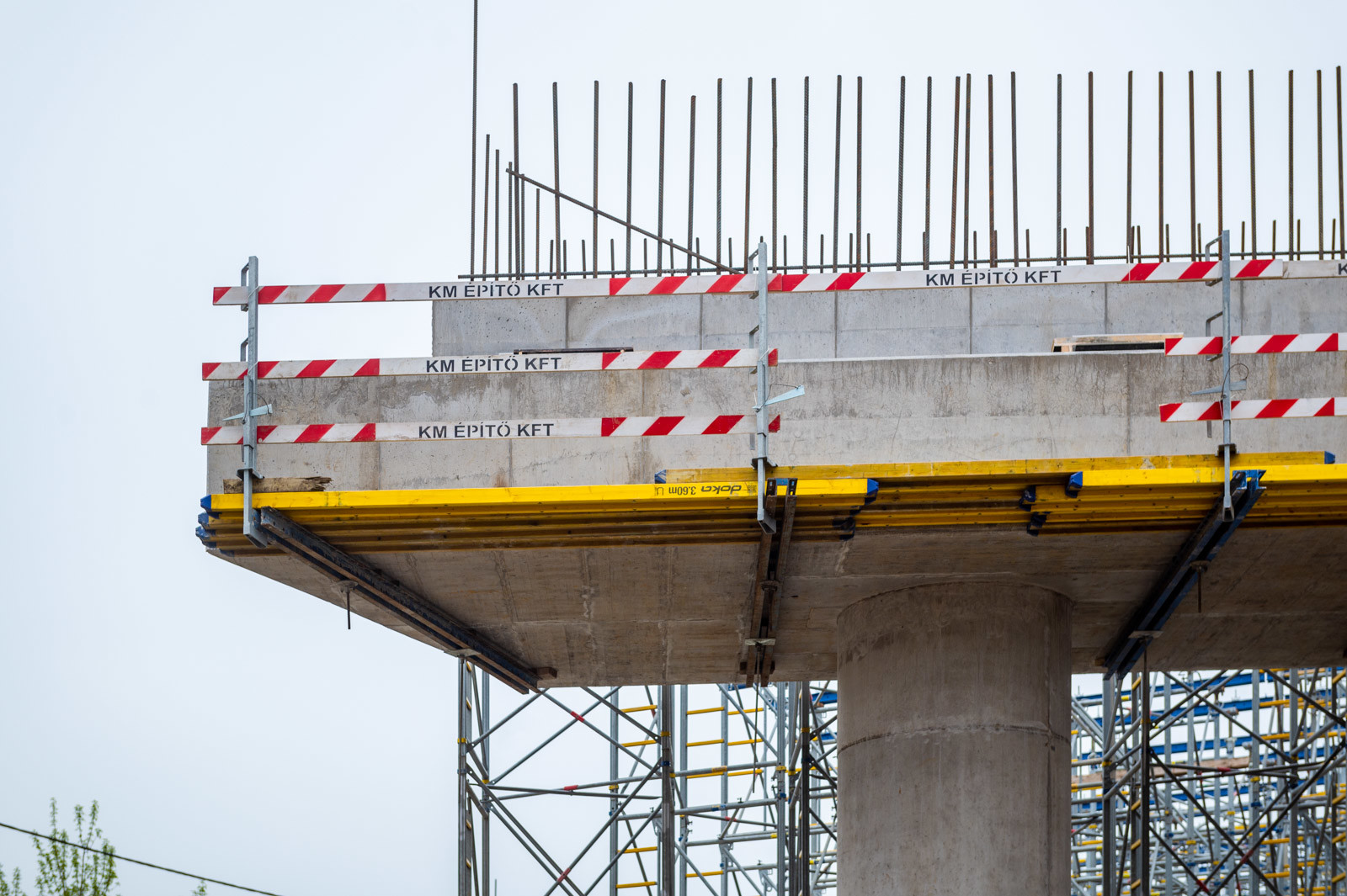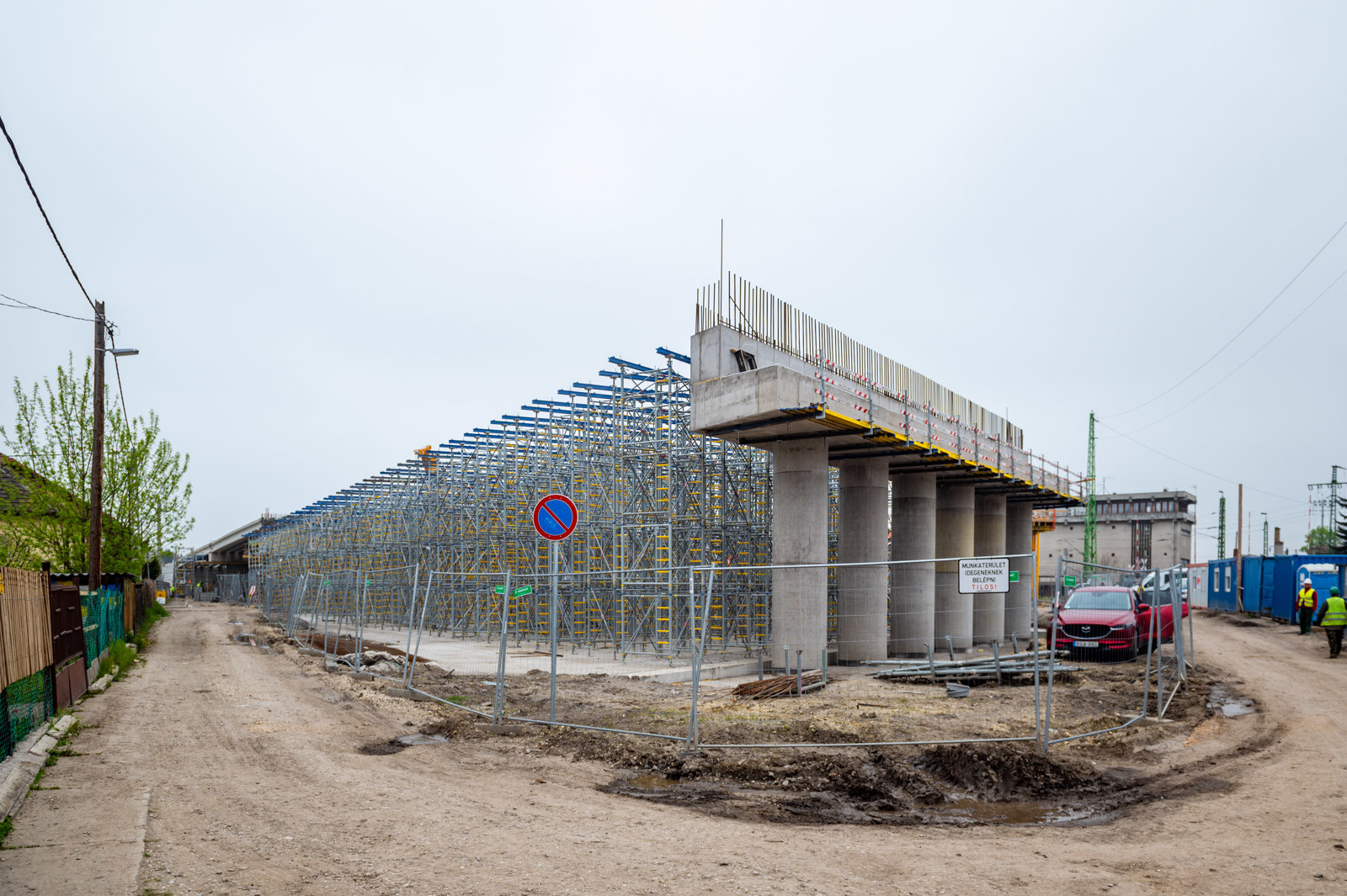 A hídpilléreken már elhelyezték a mintegy 25 méter távolságot áthidaló előregyártott gerendákat, és rövidesen a Kisfaludy utca felé vezető ág cölöpalapozása is megkezdődik.