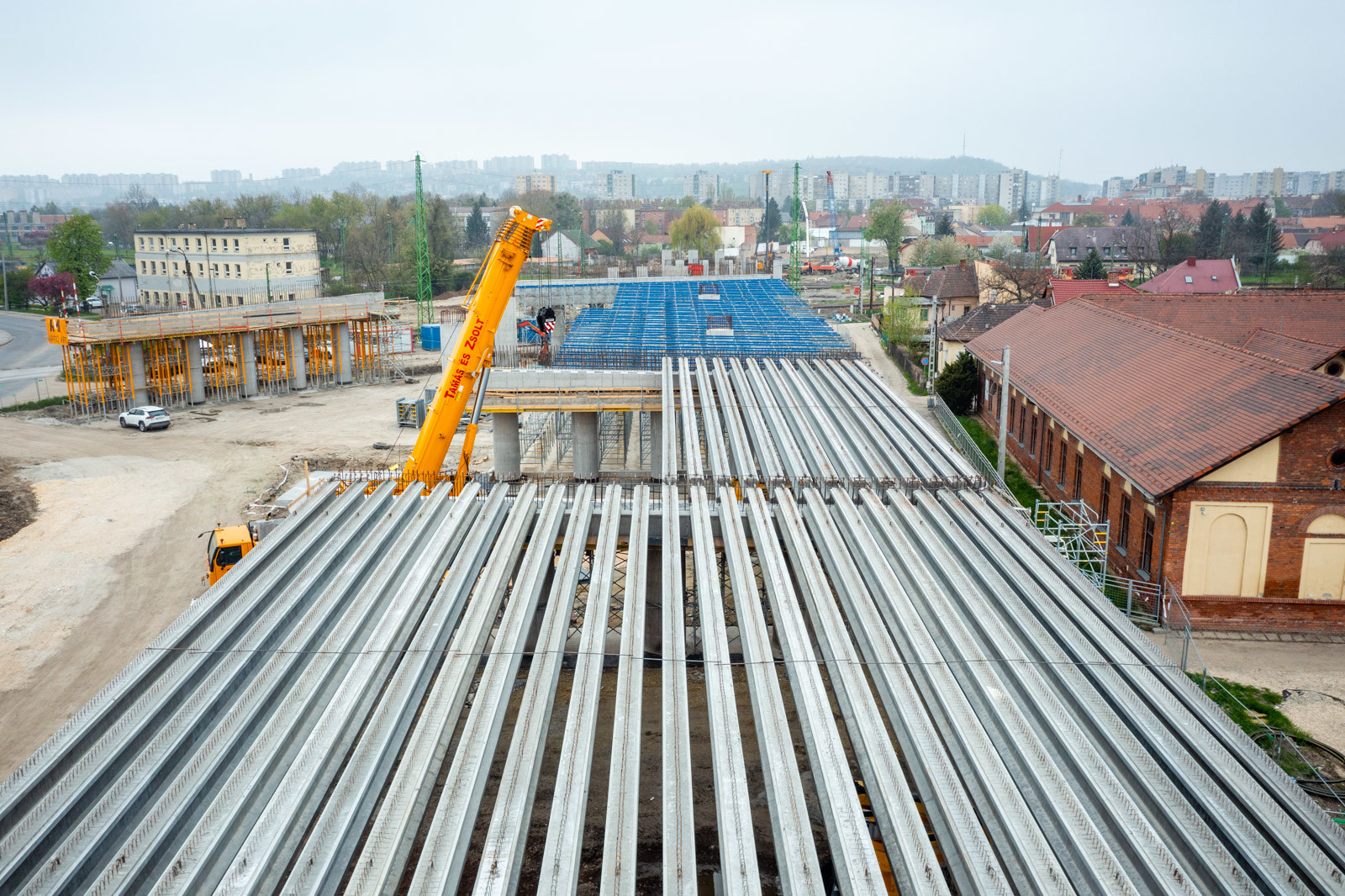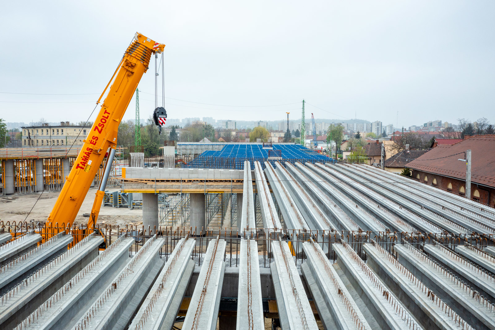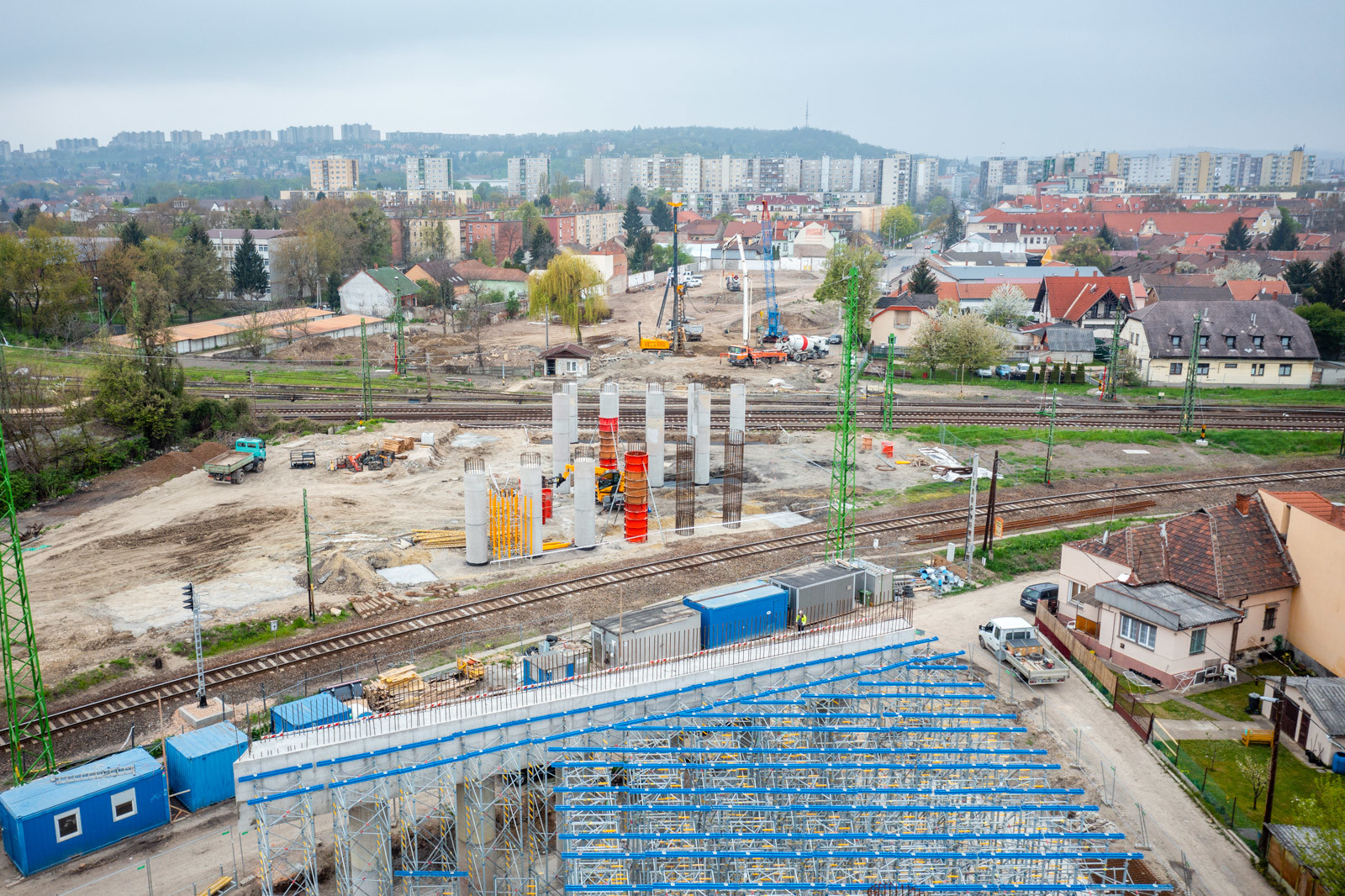 A hídpilléreken már elhelyezték a mintegy 25 méter távolságot áthidaló előregyártott gerendákat, és rövidesen a Kisfaludy utca felé vezető ág cölöpalapozása is megkezdődik.