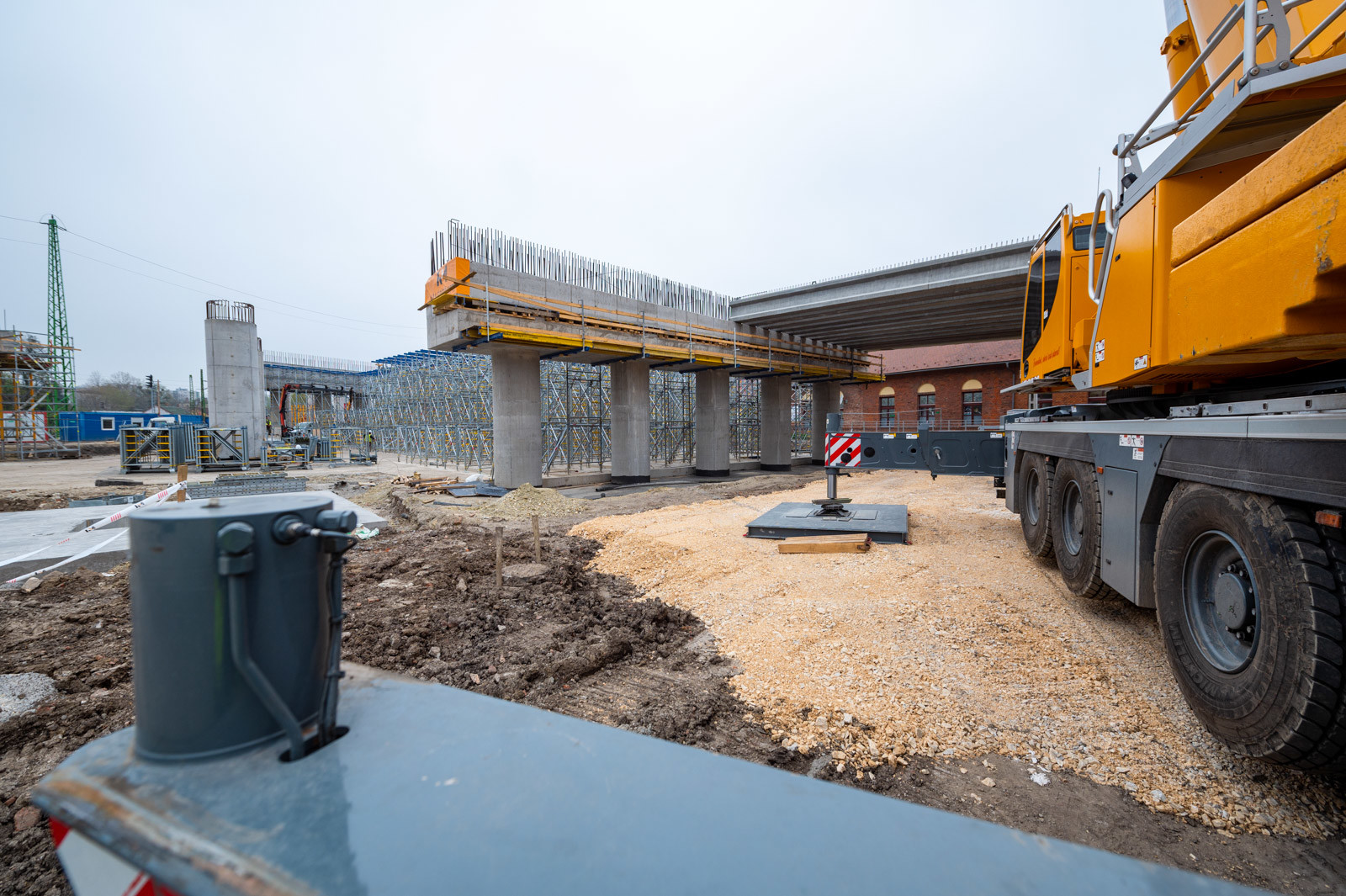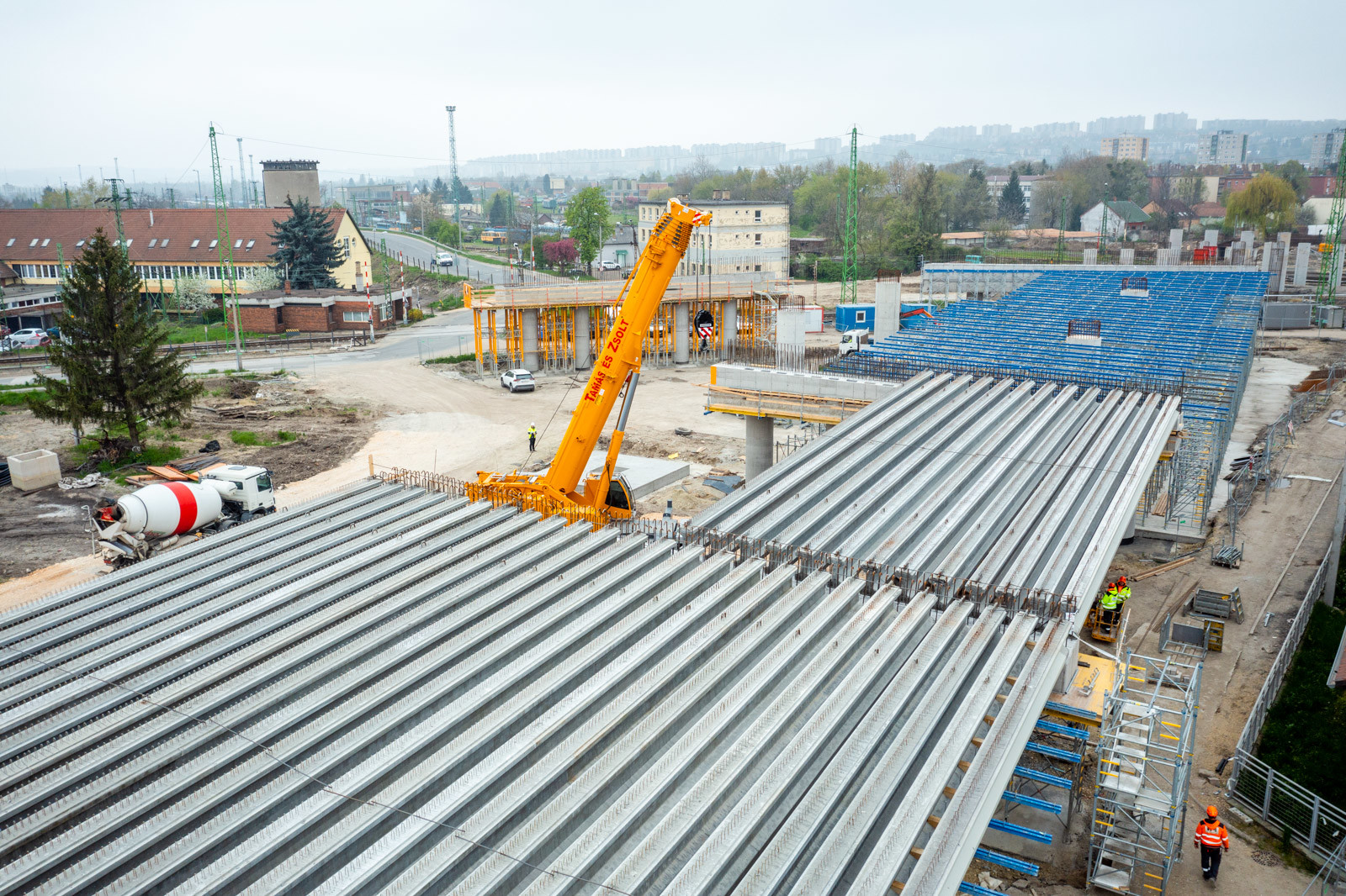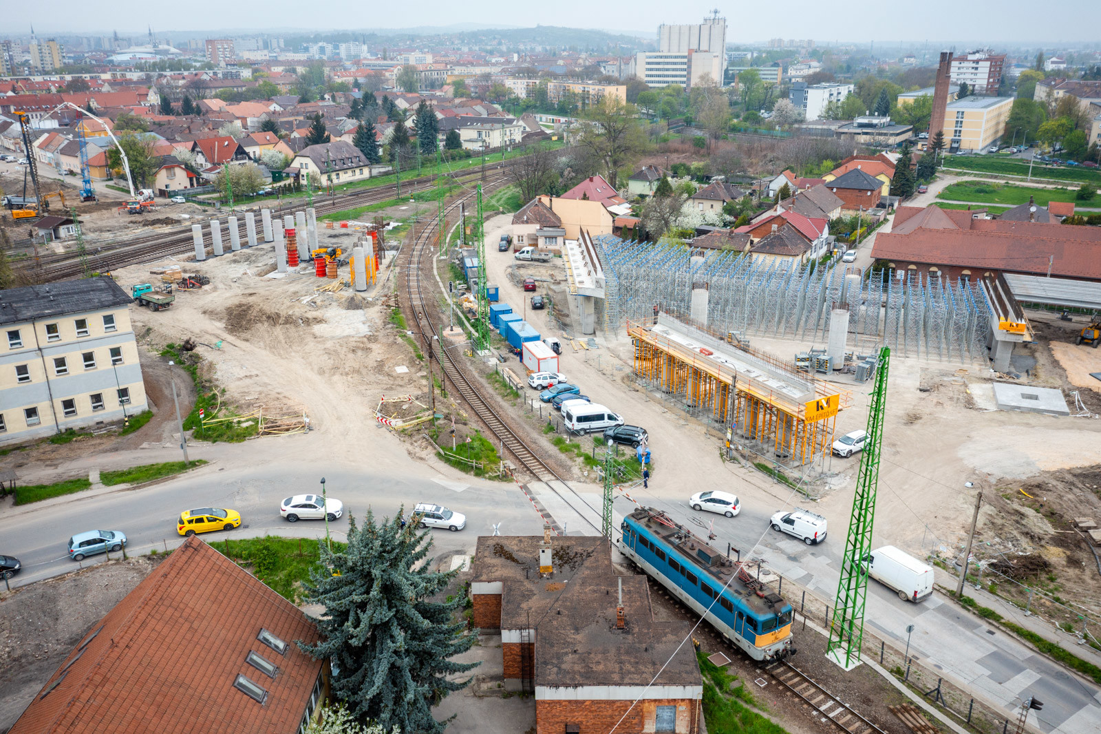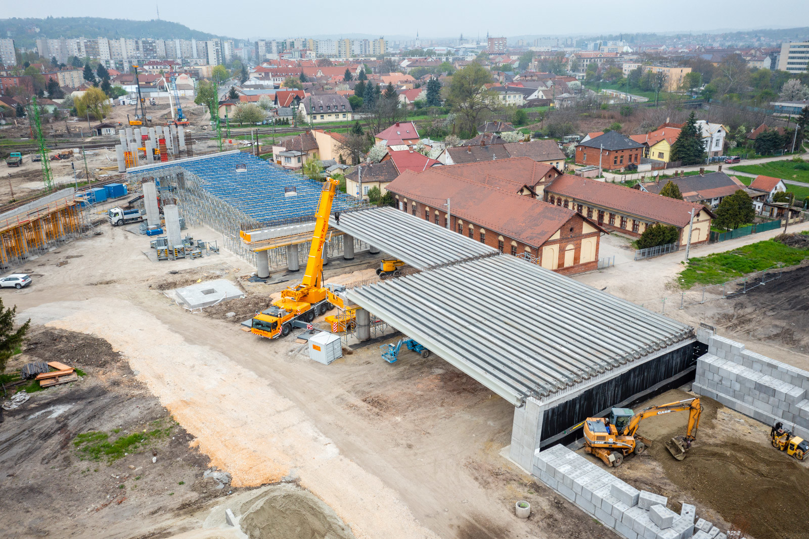 A hídpilléreken már elhelyezték a mintegy 25 méter távolságot áthidaló előregyártott gerendákat, és rövidesen a Kisfaludy utca felé vezető ág cölöpalapozása is megkezdődik.