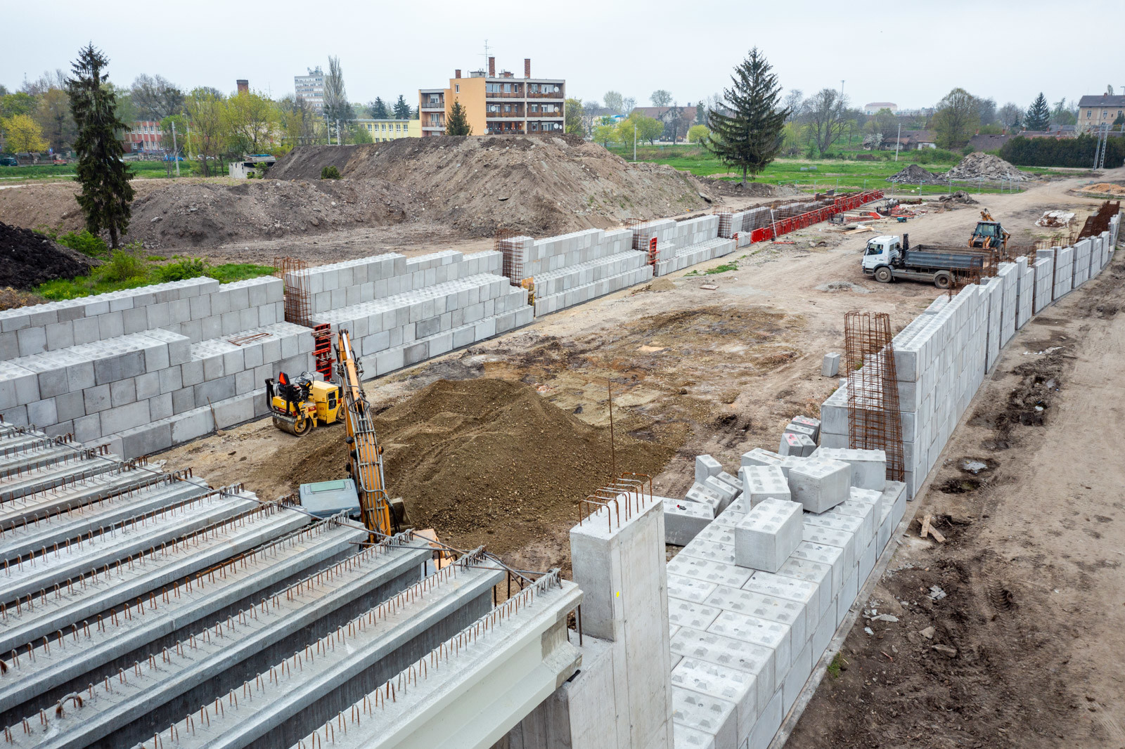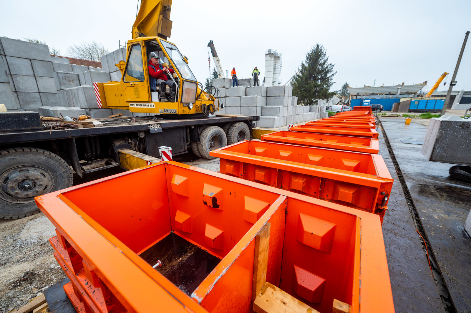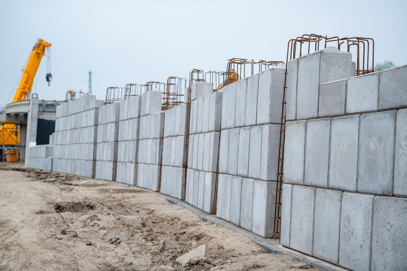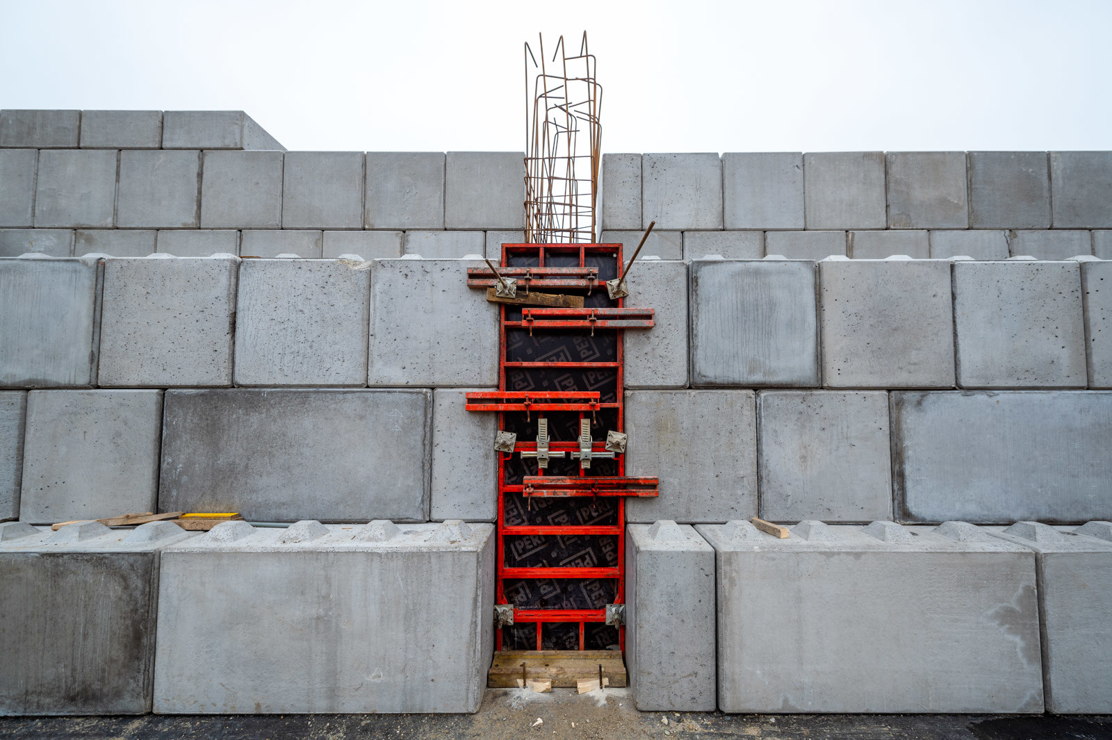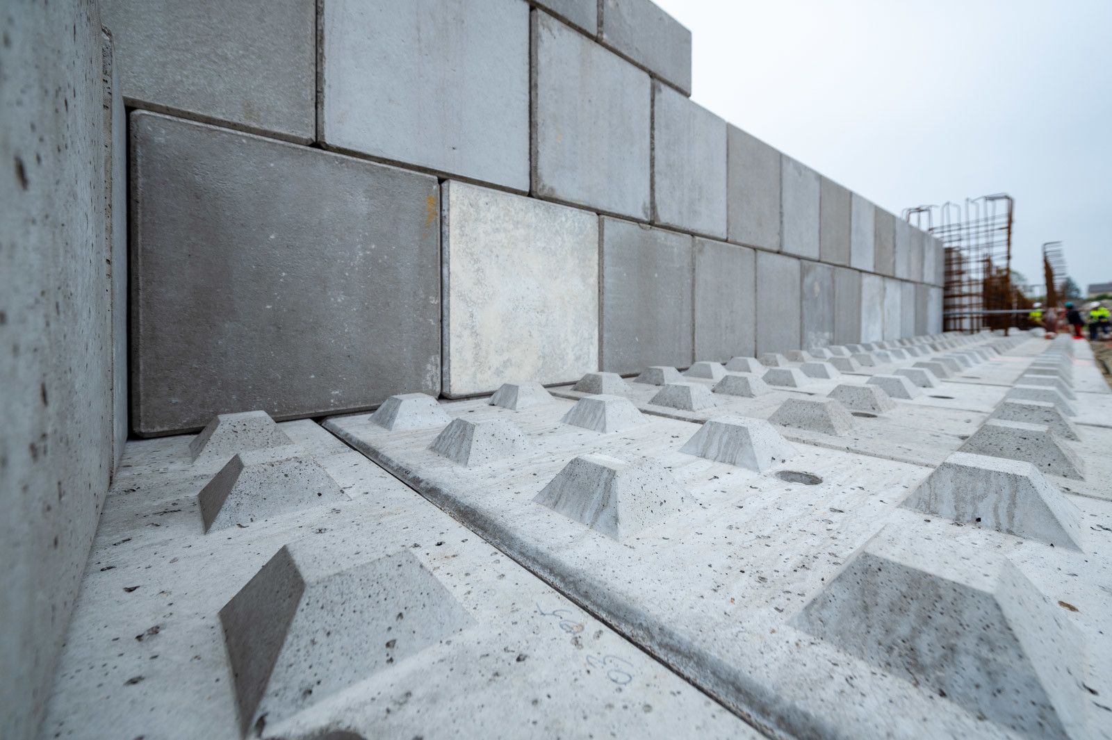 Ütemezetten halad a CLC Construct Kft. által előregyártott támfal elemek helyszíni összeállítása is, már több helyen látható a végleges helyén ez a támfal szerkezet.