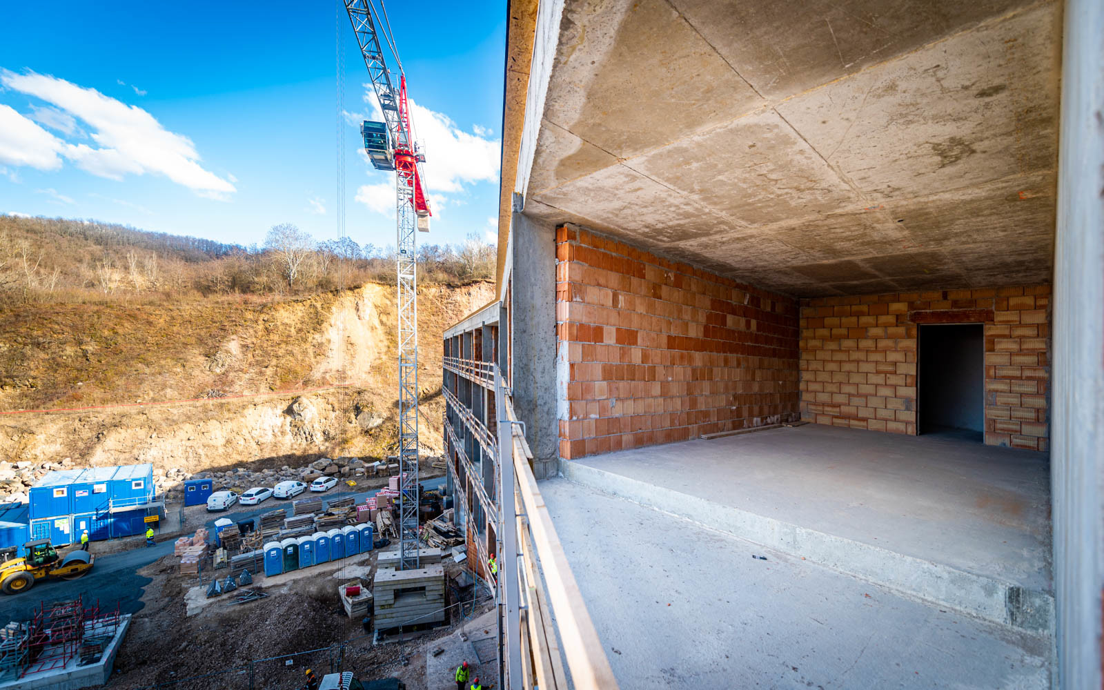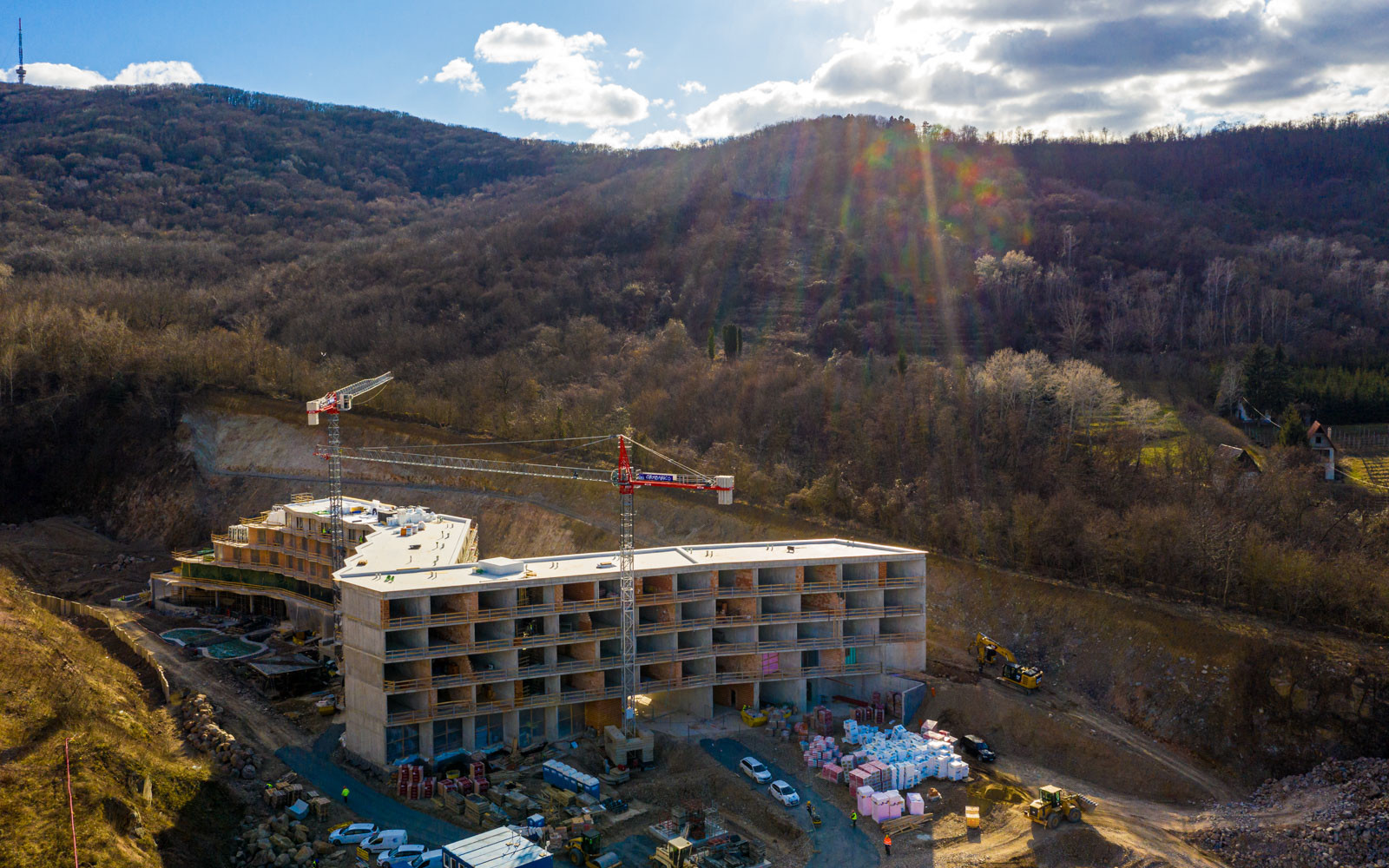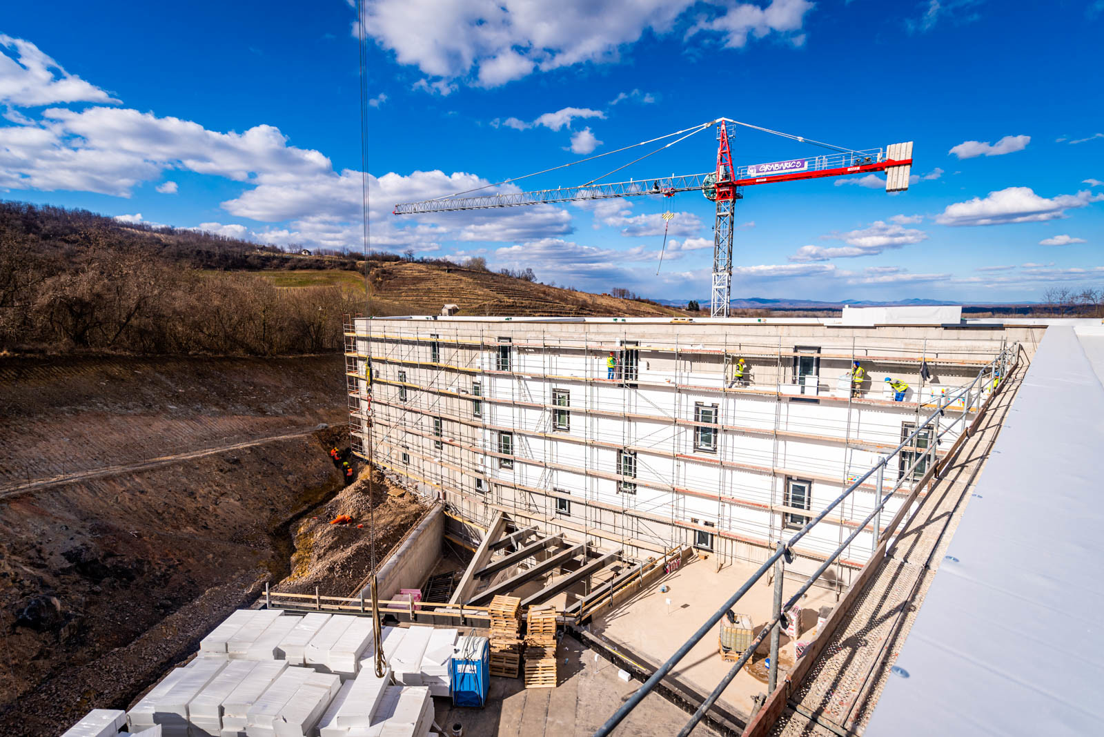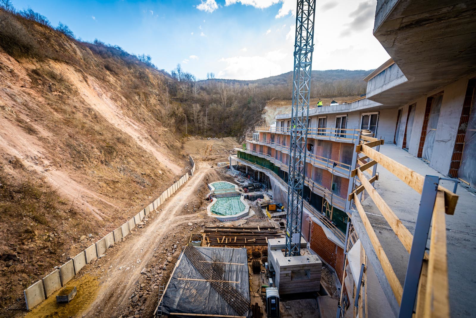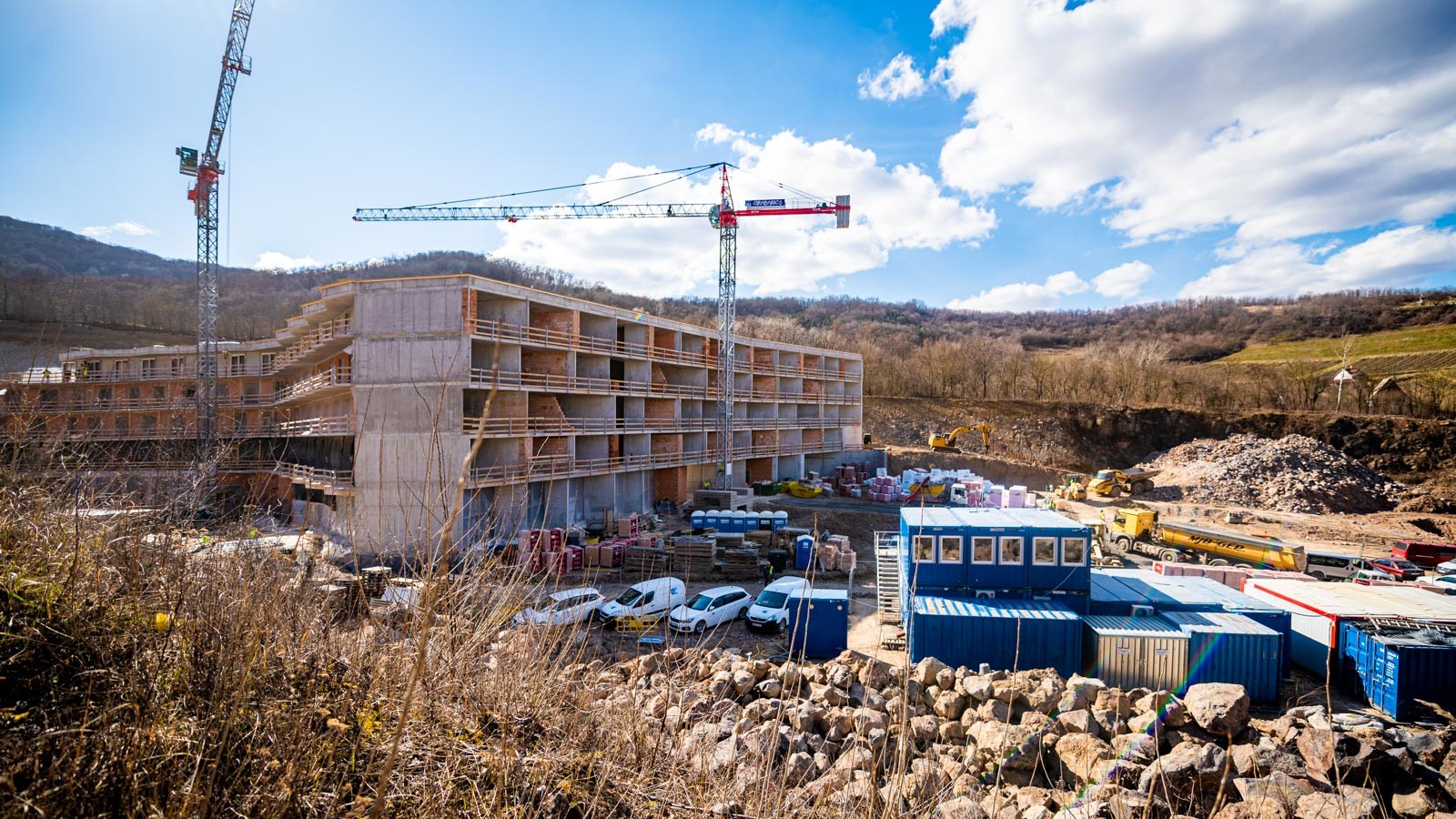 A beruházás a Grabarics Építőipari Kft. és az Aktuál Bau Építőipari Kft. kivitelezésében valósul meg, a projekten a CLC-Construct Kft. is dolgozik szerkezetépítőként. A különleges helyszínen zajló építési munkálatokról az Aktuál-Bau vezető létesítményfelelősével, Szabó Gáborral beszélgettünk. Bevezetésképp a szakember tájékoztatott a már elkészült munkákról: befejezték a nagytömegű földmunkákat, a falazásokat és a vakolásokat, továbbá elkészült egy mintaszoba is.