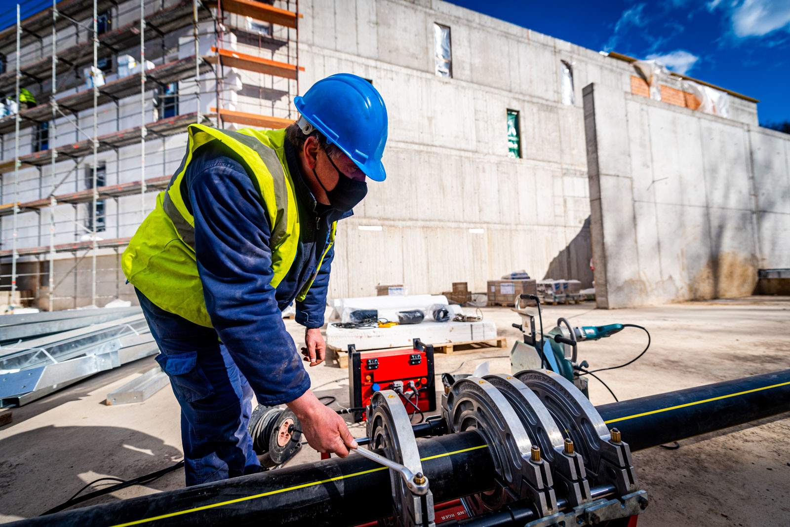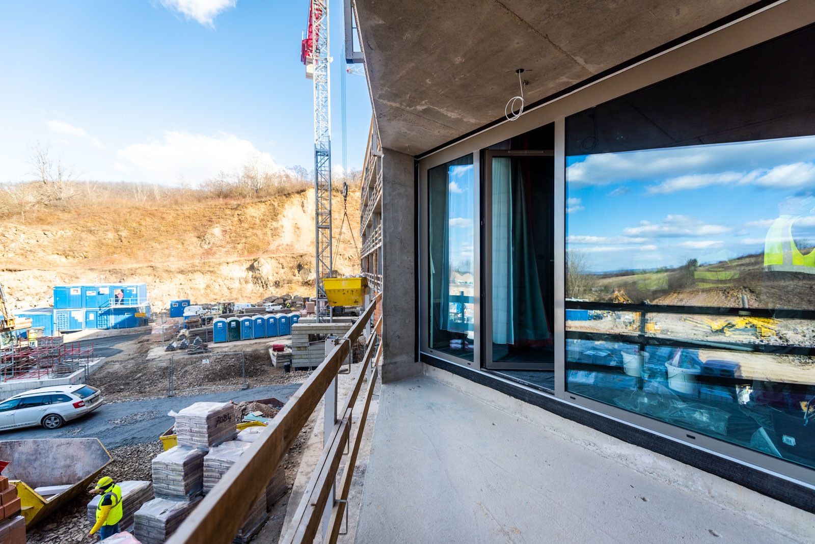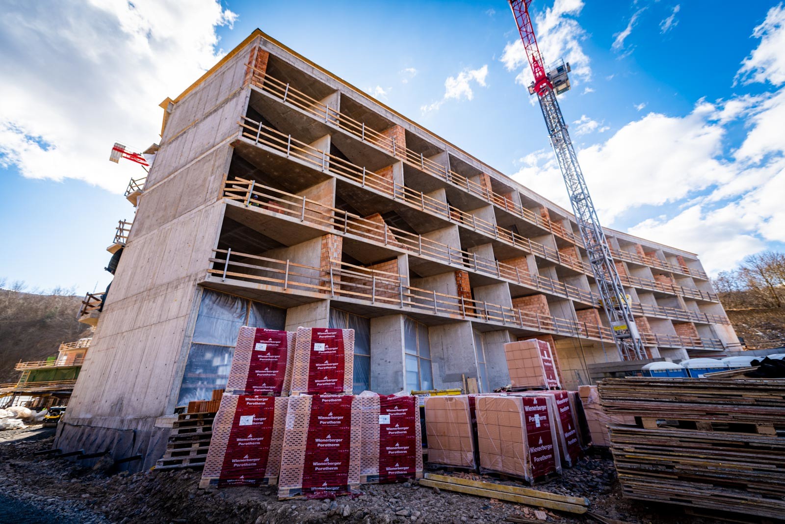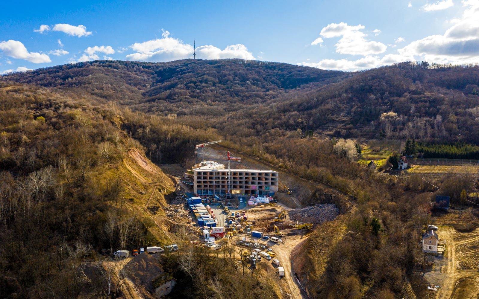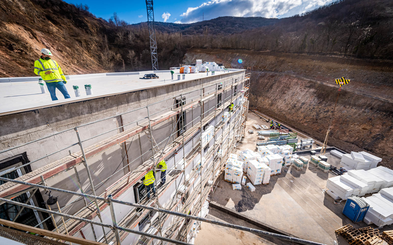 A beruházás a Grabarics Építőipari Kft. és az Aktuál Bau Építőipari Kft. kivitelezésében valósul meg, a projekten a CLC-Construct Kft. is dolgozik szerkezetépítőként. A különleges helyszínen zajló építési munkálatokról az Aktuál-Bau vezető létesítményfelelősével, Szabó Gáborral beszélgettünk. Bevezetésképp a szakember tájékoztatott a már elkészült munkákról: befejezték a nagytömegű földmunkákat, a falazásokat és a vakolásokat, továbbá elkészült egy mintaszoba is.