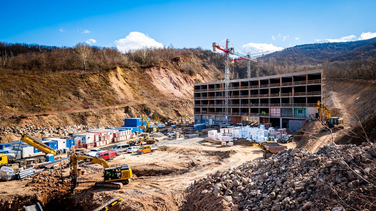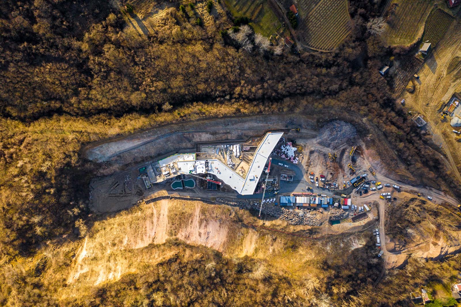 A projekt kihívásaival kapcsolatban a létesítményfelelős ismertette, hogy az építési helyszín egy korábbi bánya területén helyezkedik el, így a nagy tömegű föld- és sziklamunka komoly kihívást jelentett, illetve az alépítményi munkákat is nehezíti. A régi meddő kőfejtőben három oldalról mintegy 60-80 méteres meredek falak veszik körbe a területet.