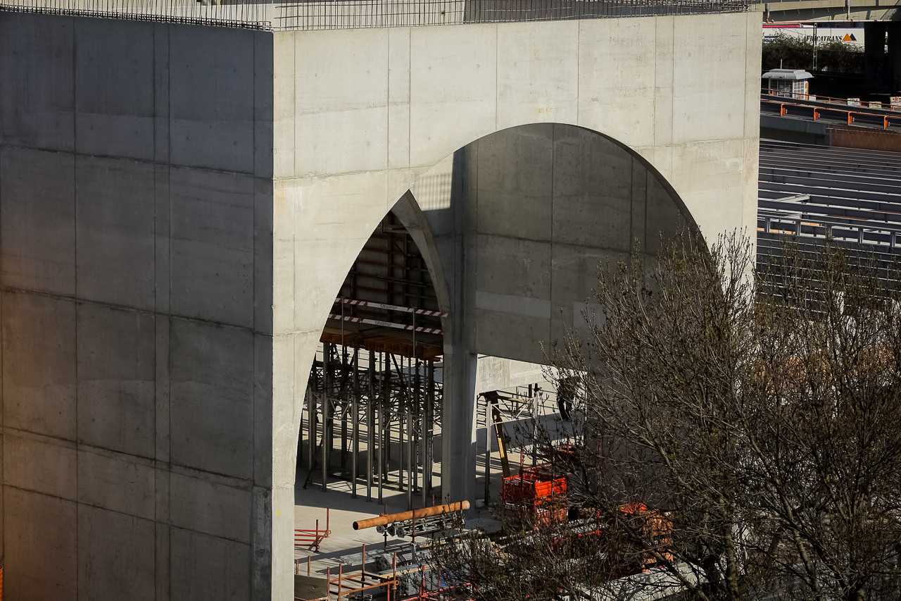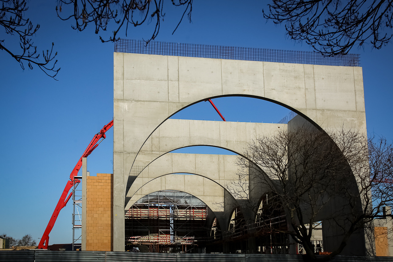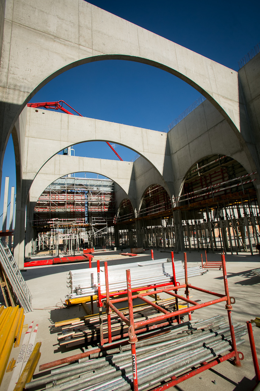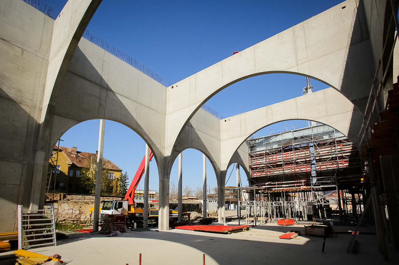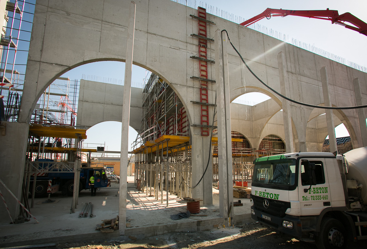 Az épület belső oldalán második ütemben 5,80 méter magas monolit vasbeton függönyfalak épülnek majd, melyeket az íves tartófalak tartanak. Oláh Zoltán elmondta azt is, hogy az íves monolit vasbeton főtartók zsaluzása és a friss beton alátámasztása MEP keretes állványzatról történik 4 méter magasságban kialakított munkaszintről.