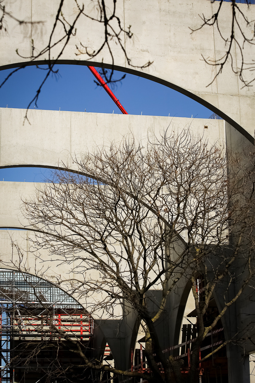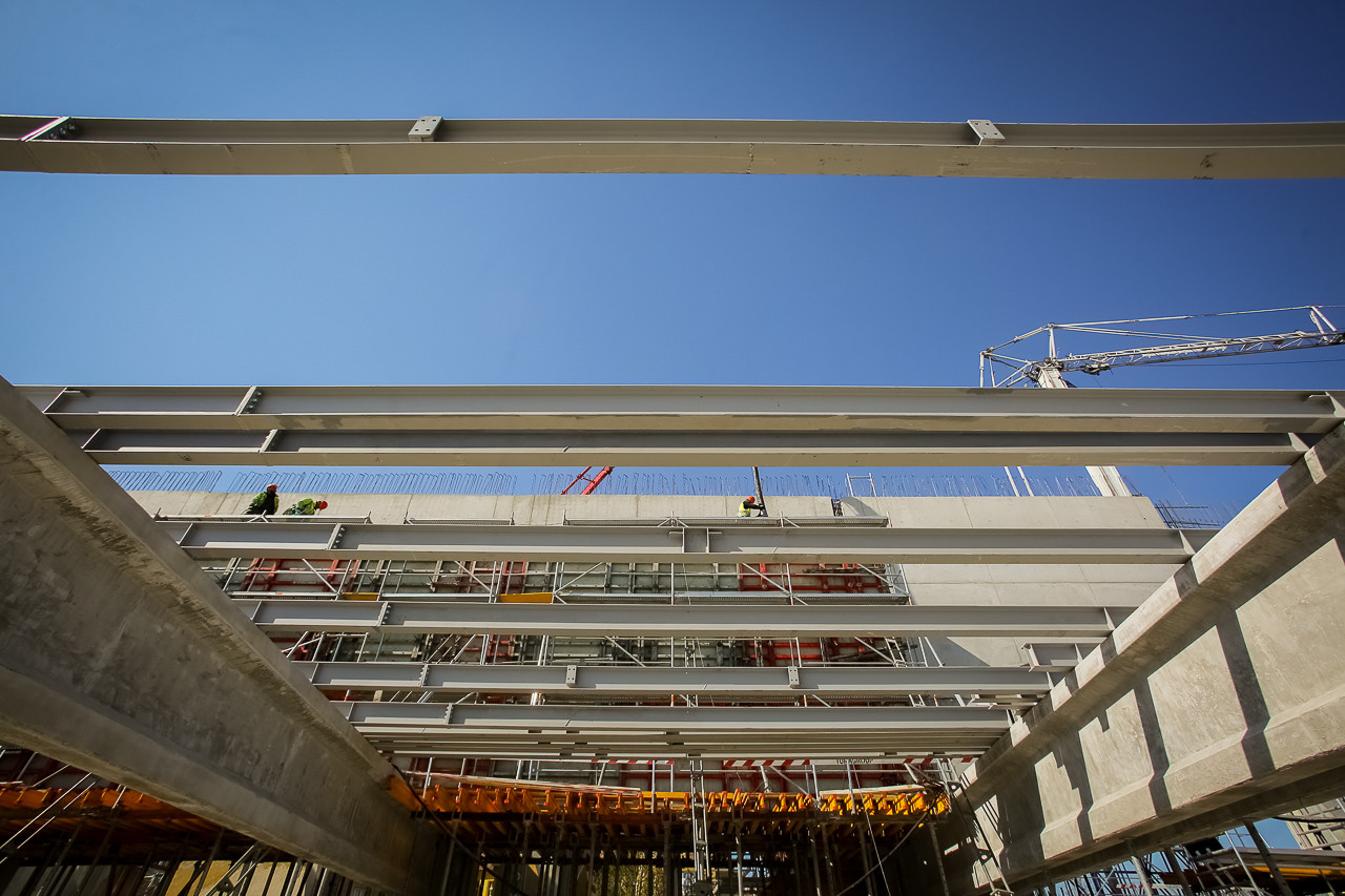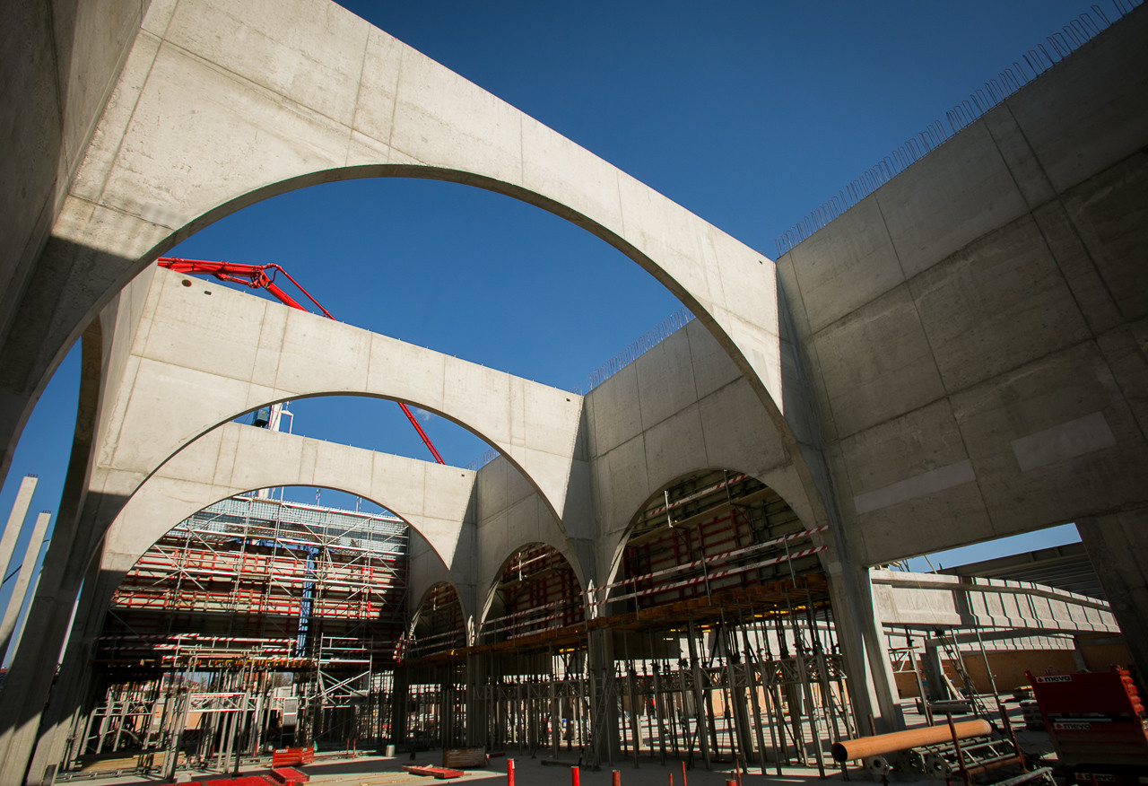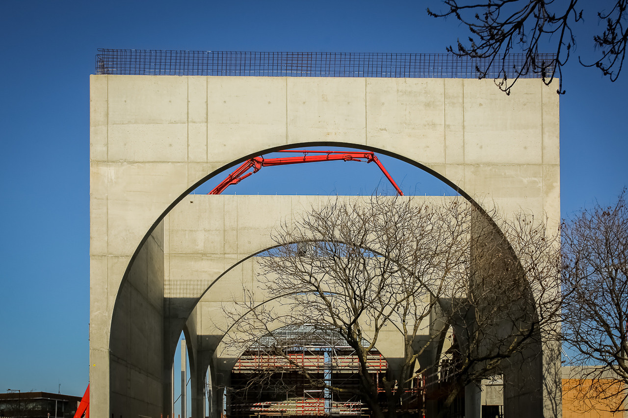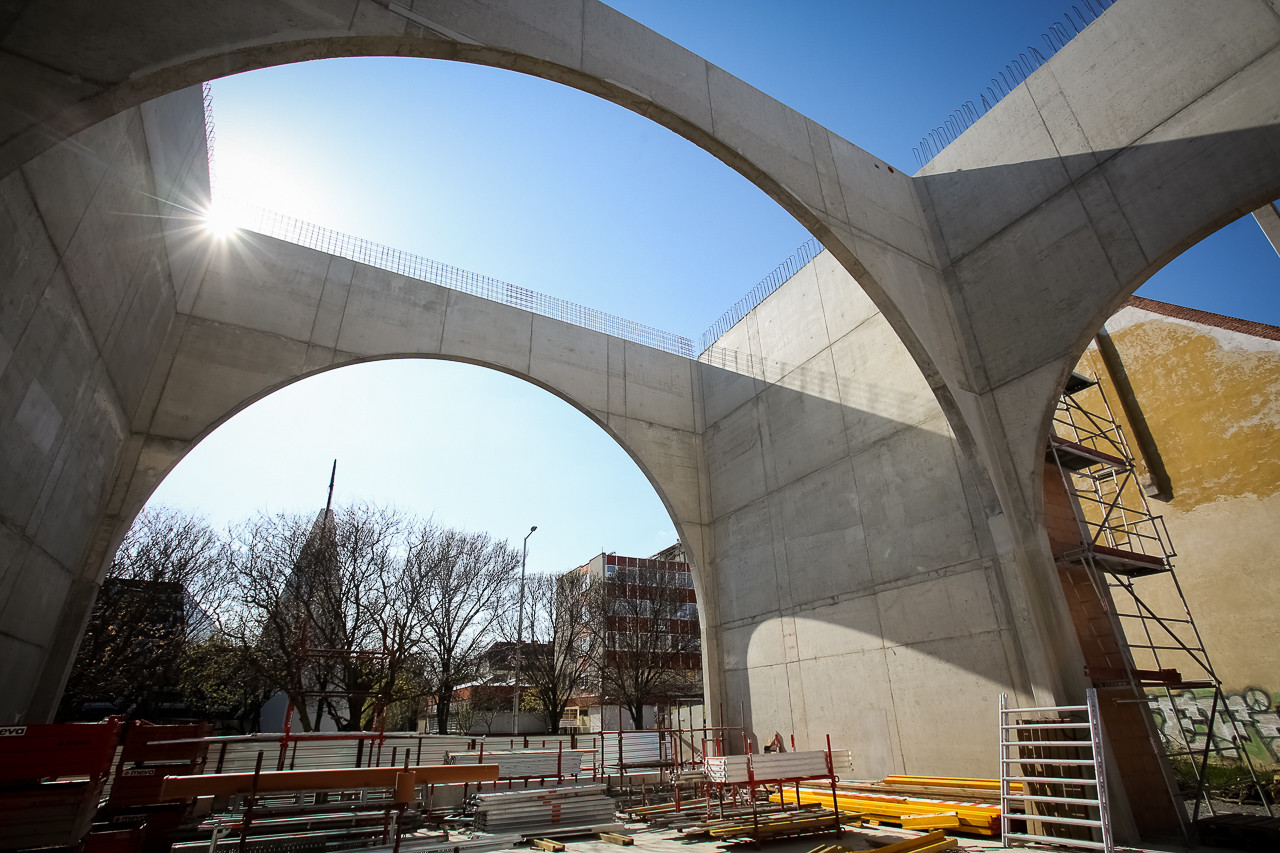 Az épület belső oldalán második ütemben 5,80 méter magas monolit vasbeton függönyfalak épülnek majd, melyeket az íves tartófalak tartanak. Oláh Zoltán elmondta azt is, hogy az íves monolit vasbeton főtartók zsaluzása és a friss beton alátámasztása MEP keretes állványzatról történik 4 méter magasságban kialakított munkaszintről.