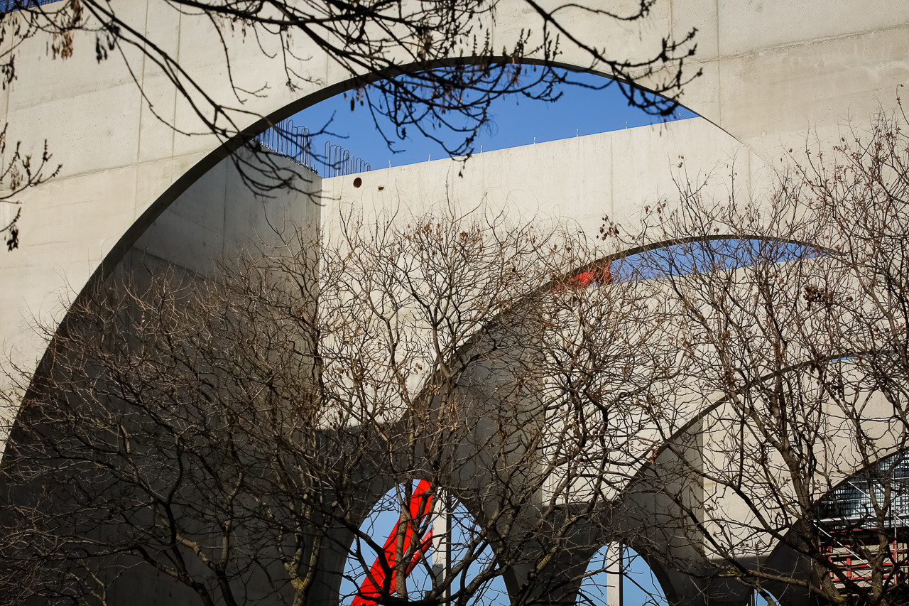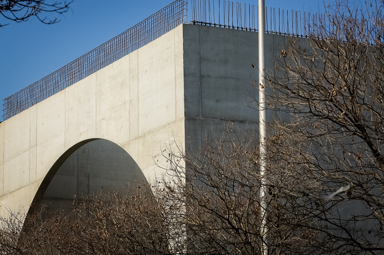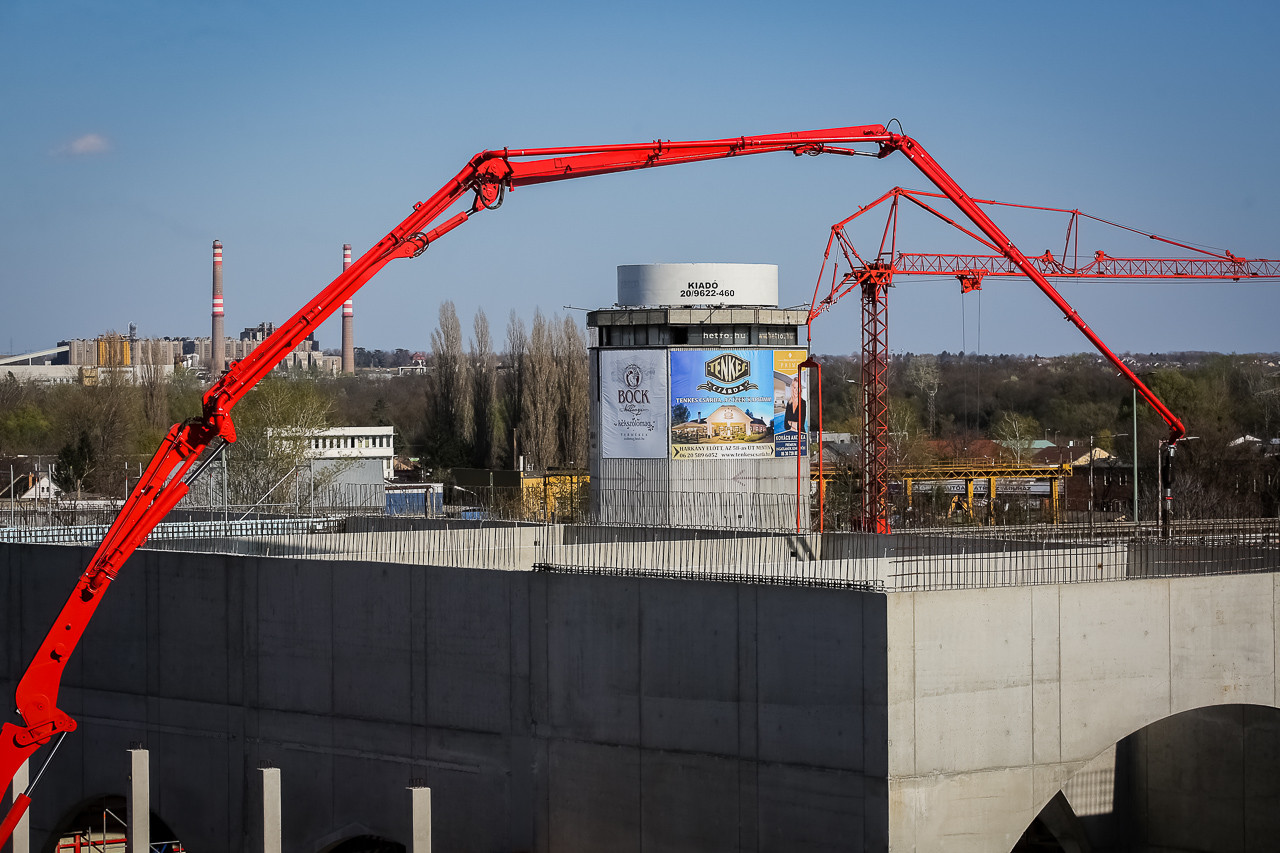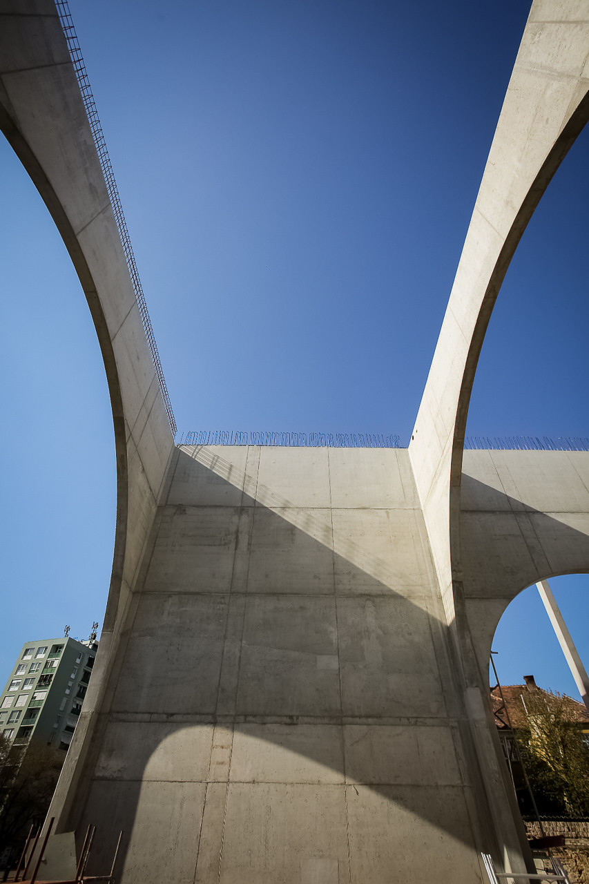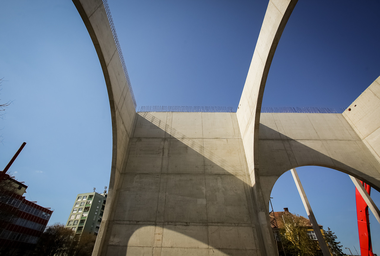 Az íves felület zsaluzásához Tura Kft. acél, rácsos tartószerkezetű kirekesztést készíttetett, mely az állványzaton nyugszik, és a zsaluzatba elsőként építik be. Mozgatása egyben történik daru segítségével. Az íves monolit vasbeton főtartók zsaluzása összesen 607 négyzetméter nagytáblás Mammut falzsaluzattal készül – tette hozzá a MEVA mérnöke.