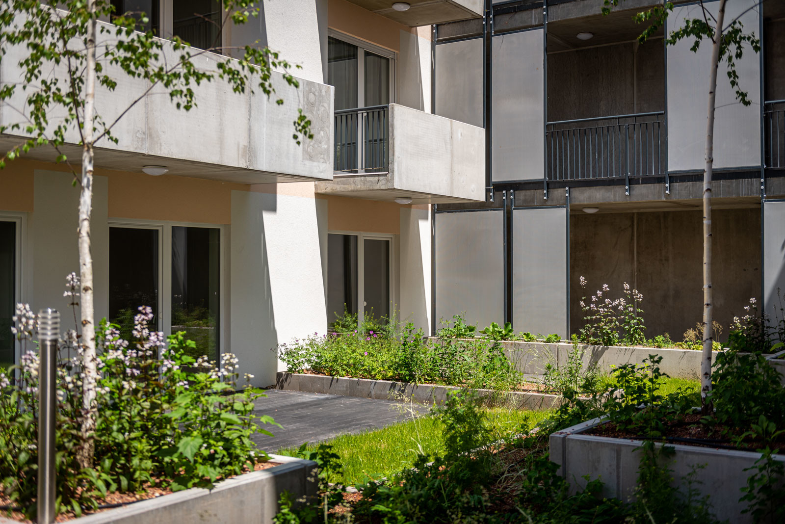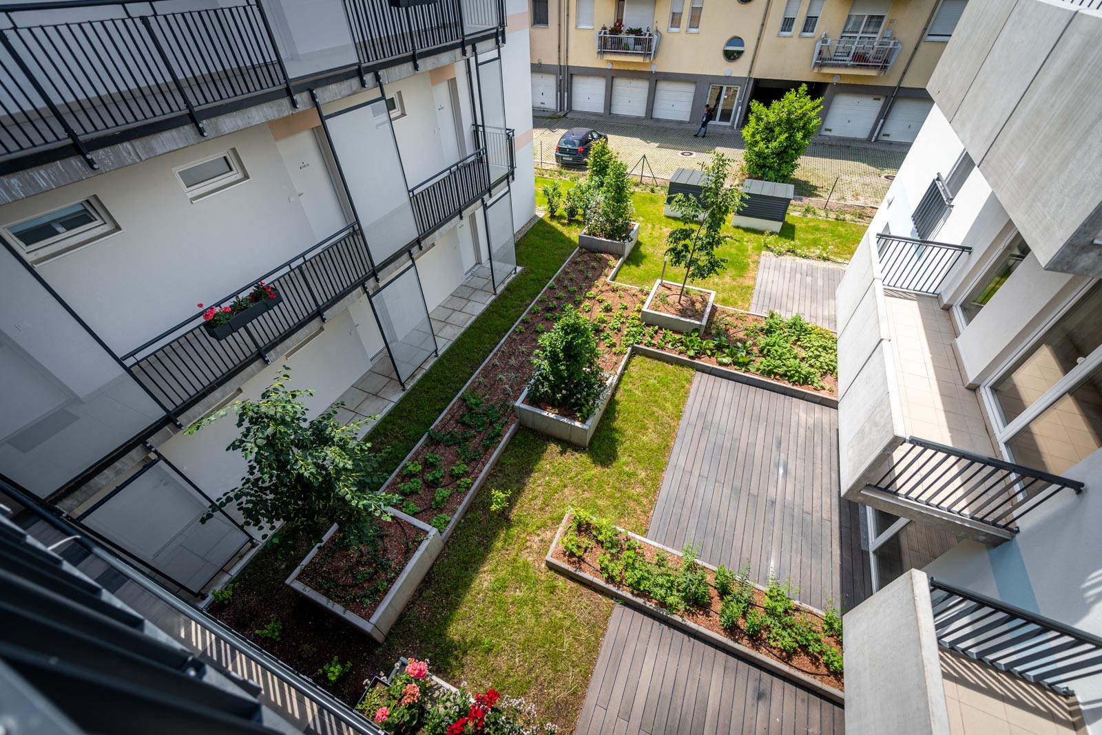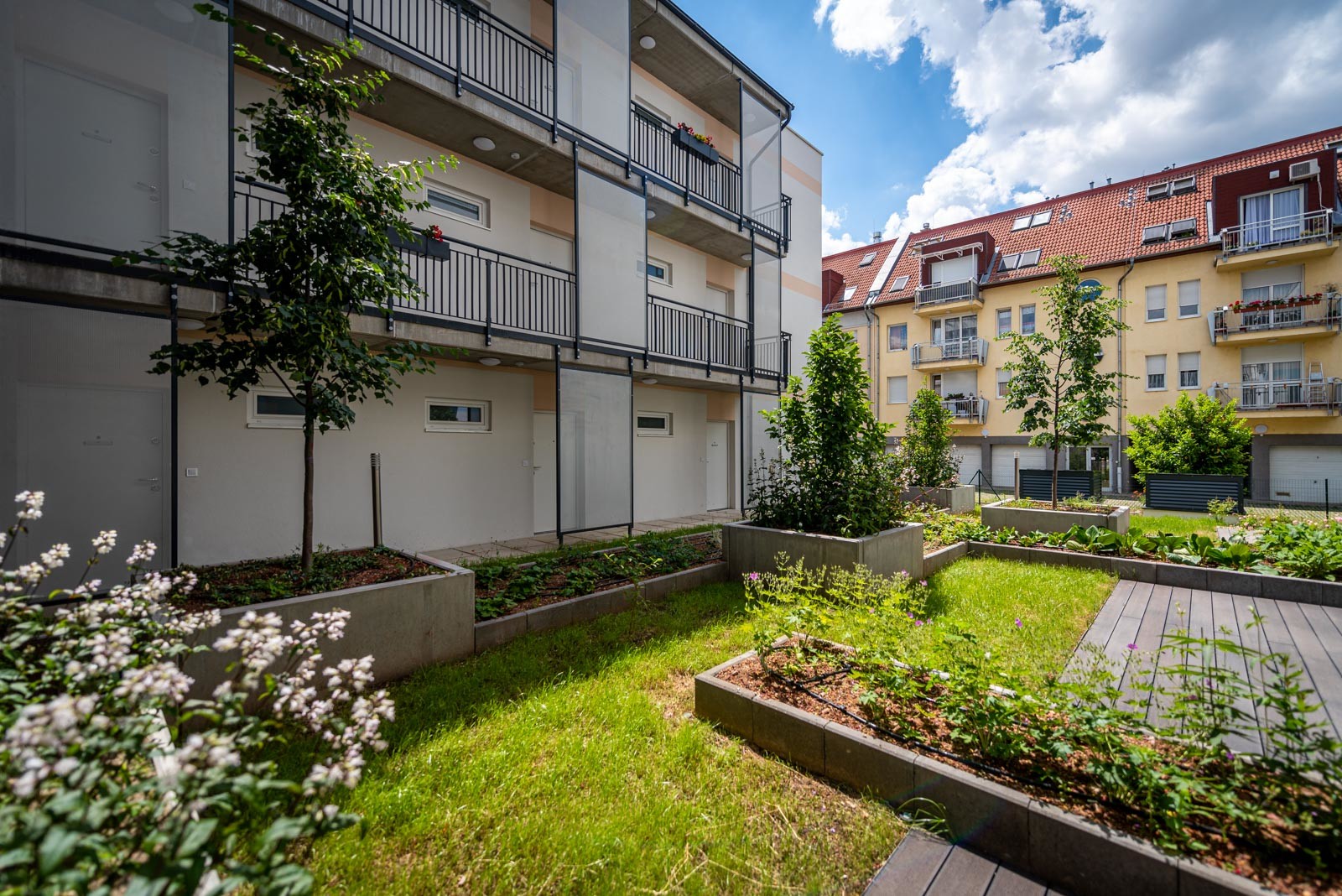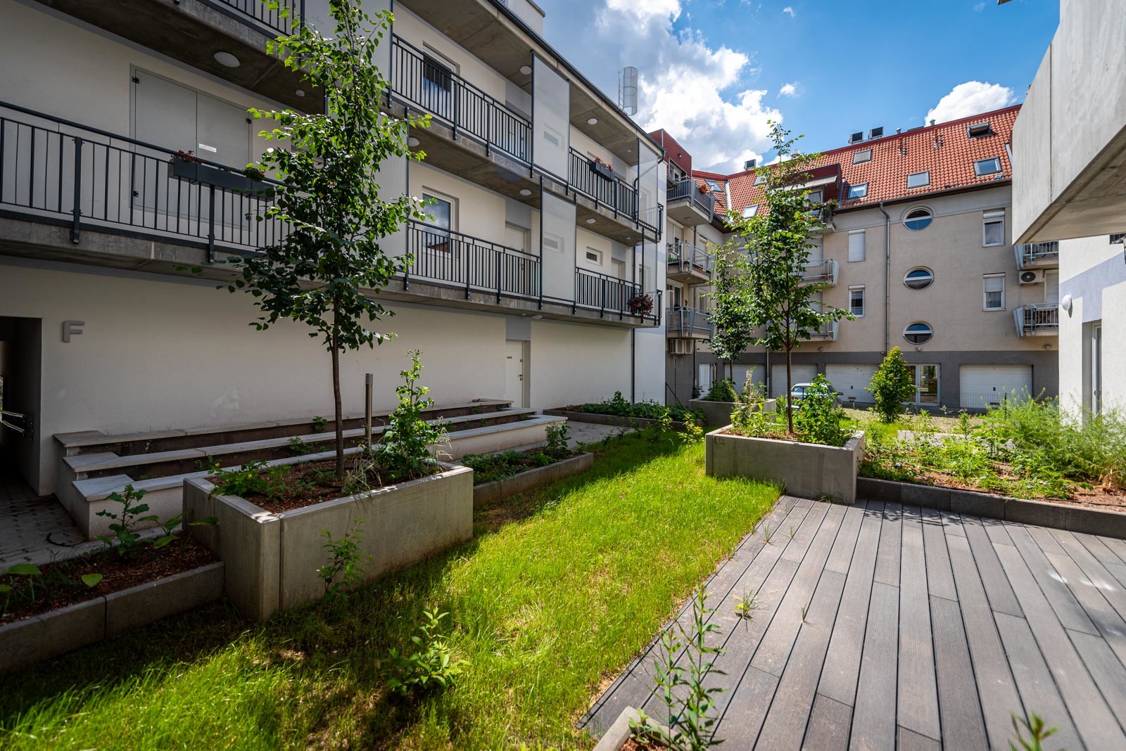 Az egész területet oldalkert, illetve a tömbök között kiépített kis, belső kertek övezik, melyek közös tulajdonú részek. Az egyes kertek között lévő teraszok és növényládák azonban kijelölik azok használatát az ott lakók számára.