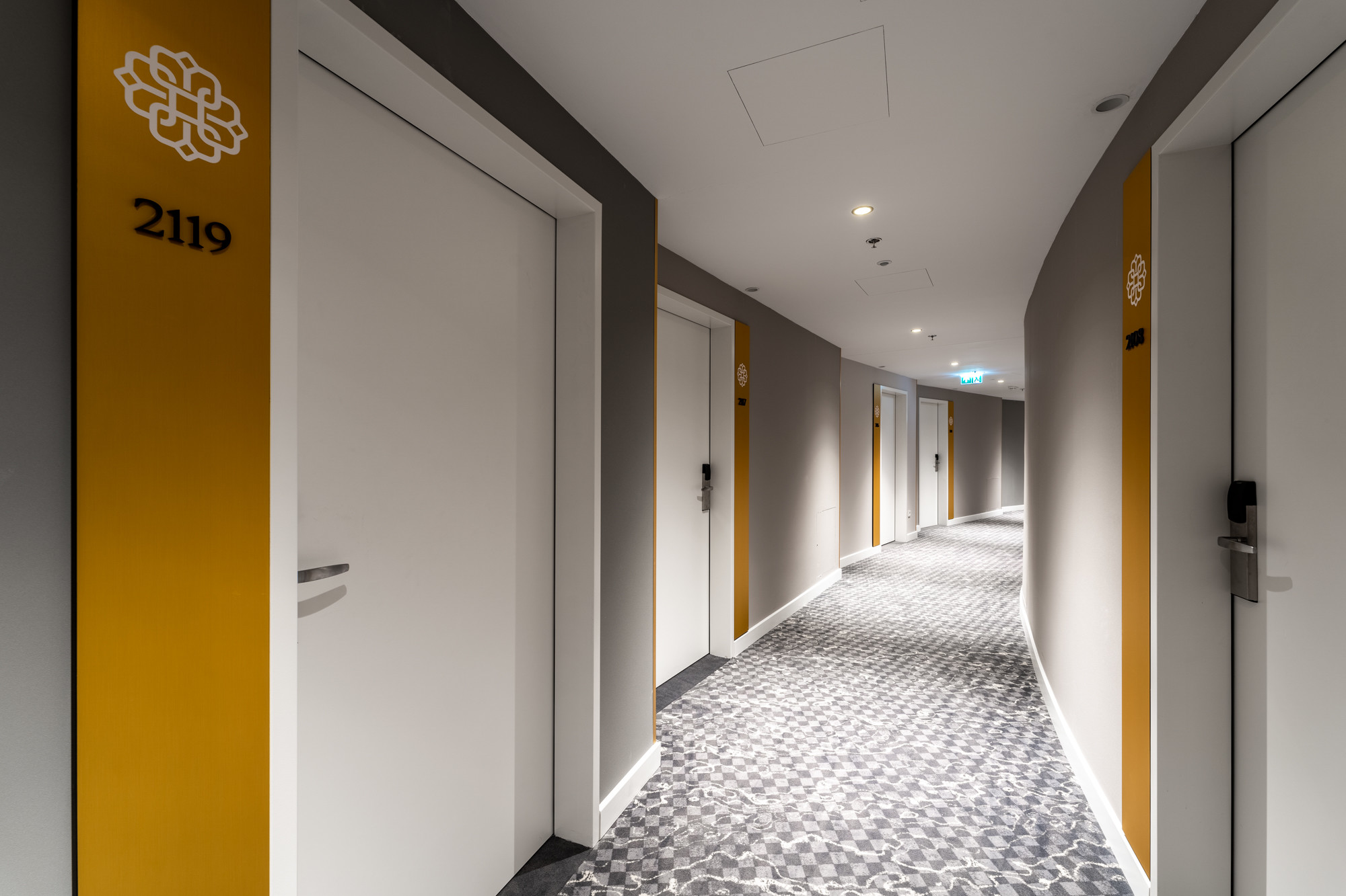 Kihívásként volt jelen a munkafolyamatok során az is, hogy a 12 éve tervezett és félbehagyott szálloda esetében igazodni kellett az azóta megváltozott hatósági előírásokhoz is, valamint a régi szabványokat az új követelményekbe áthelyezni.