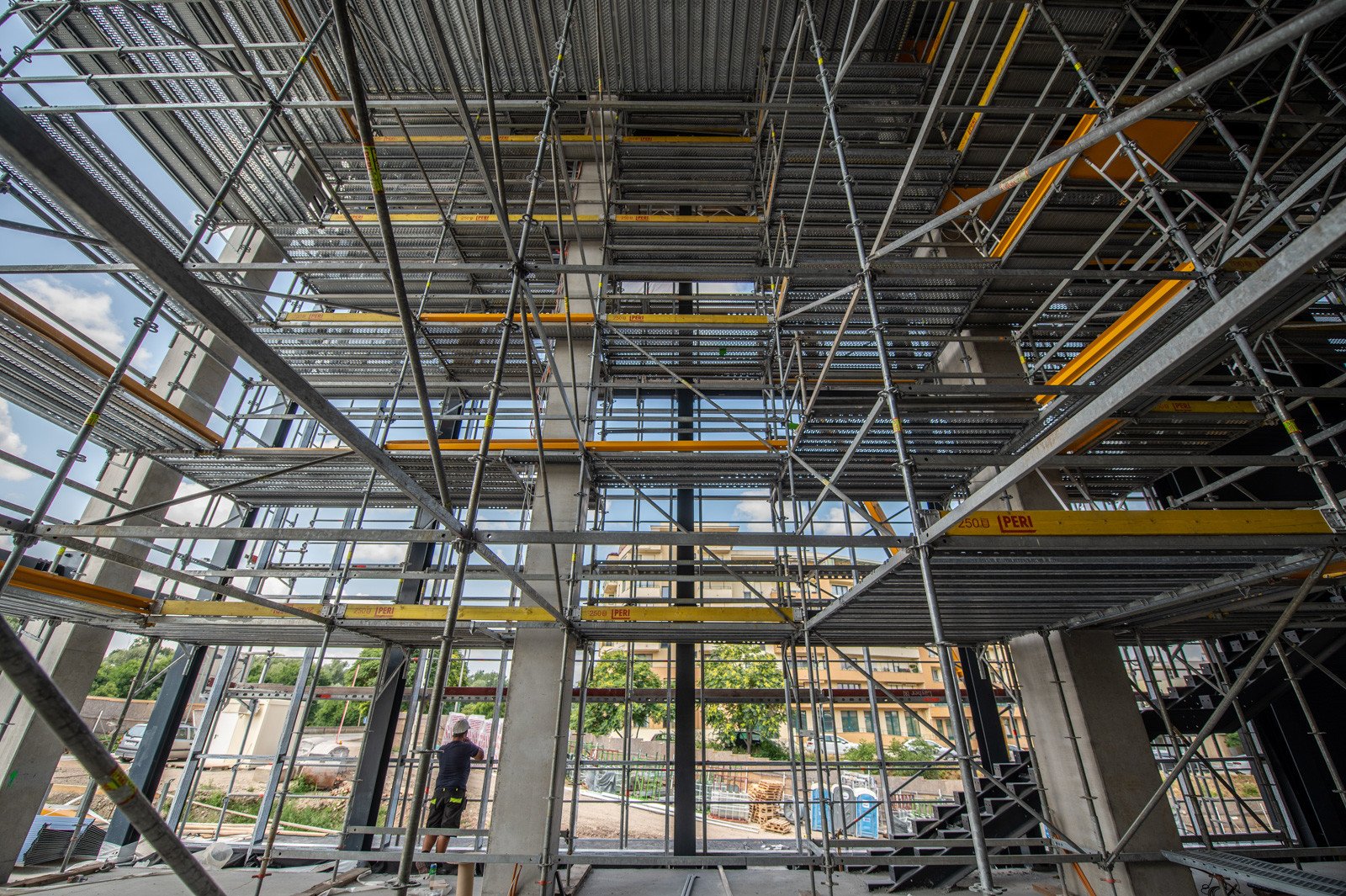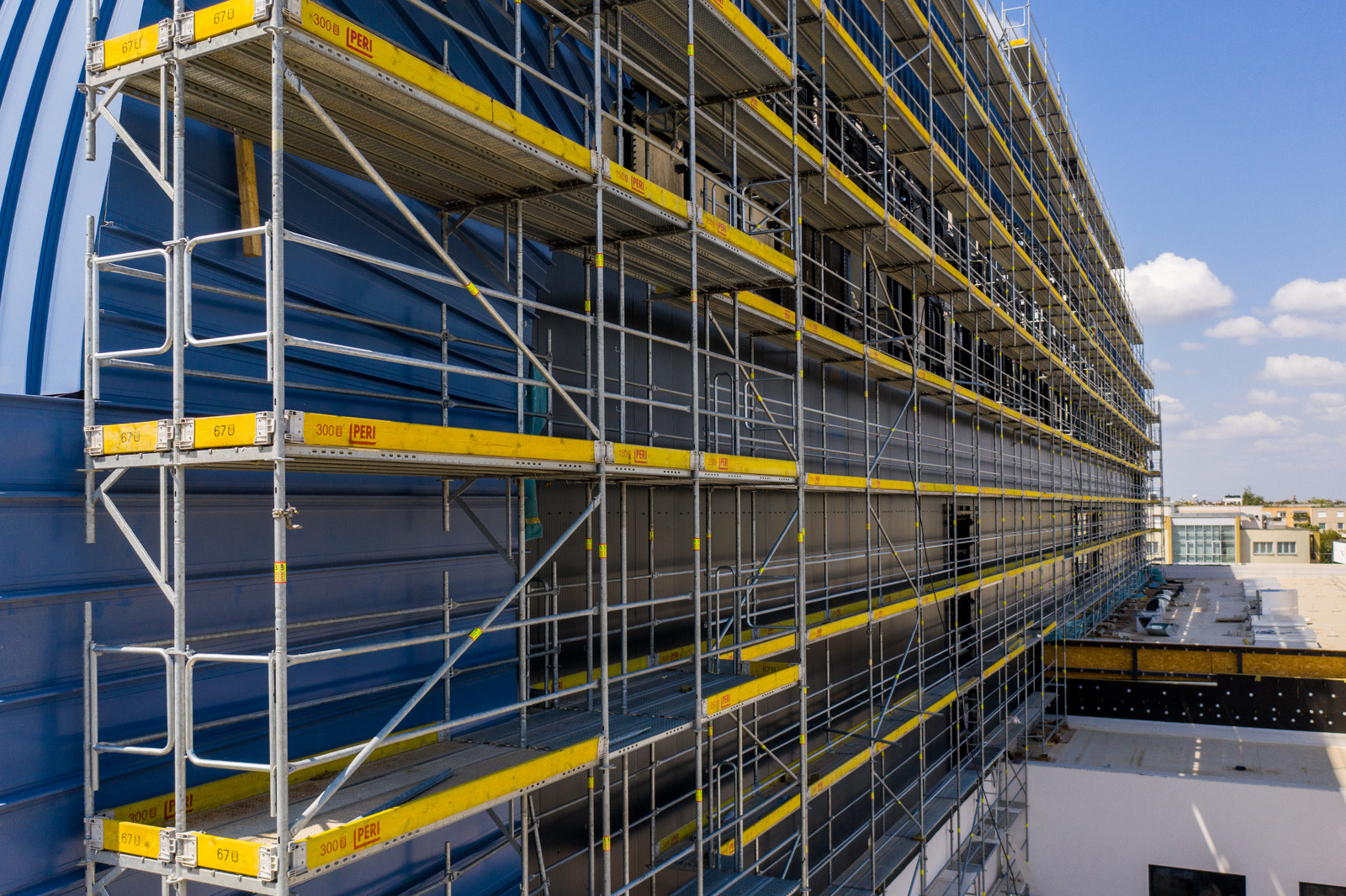 A sportkomplexum szakipari munkálataihoz a PERI stabil munka- és homlokzati állványait alkalmazták.