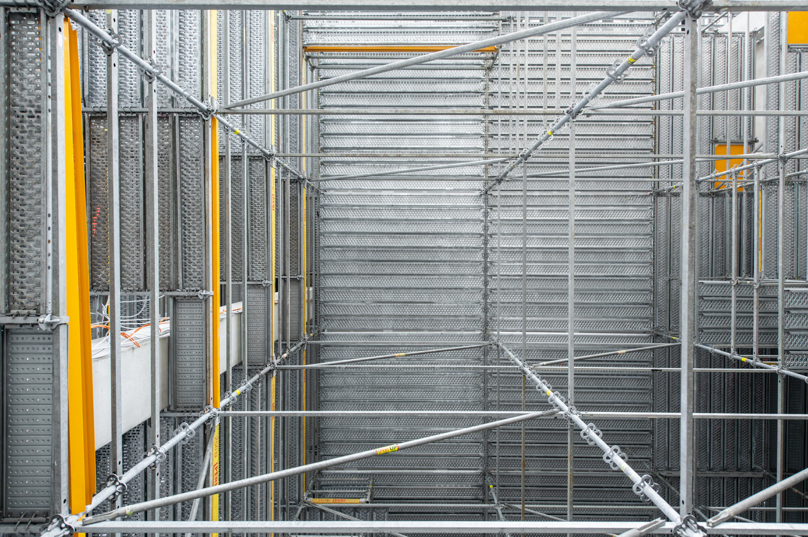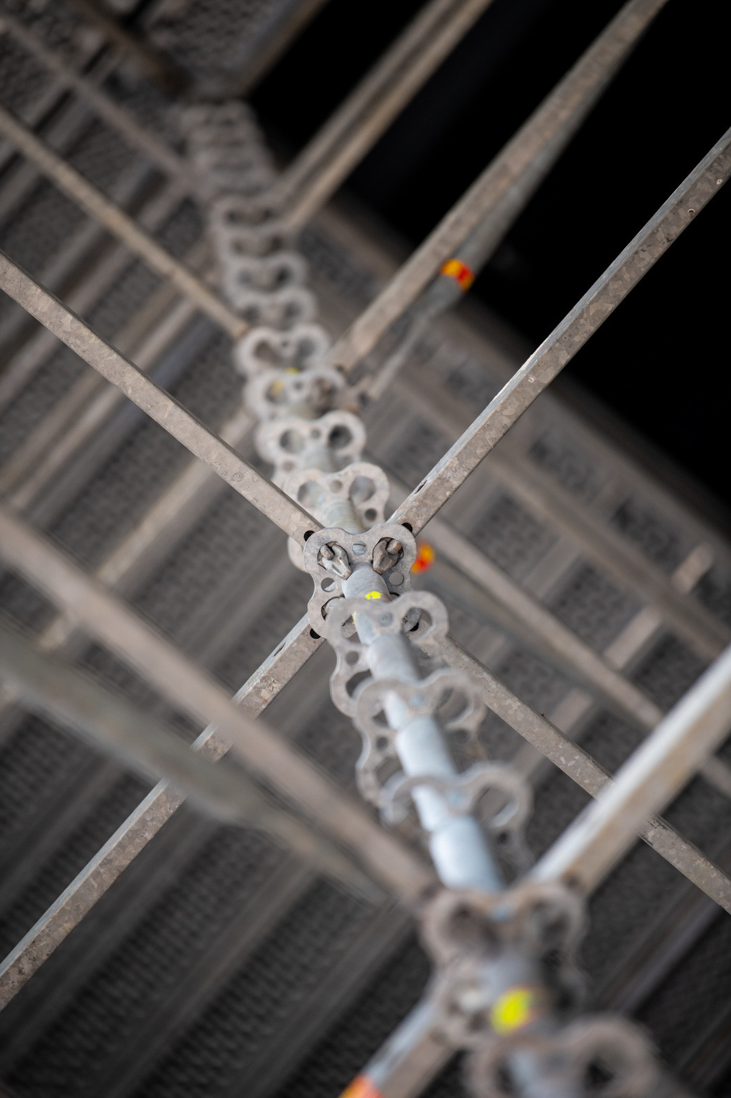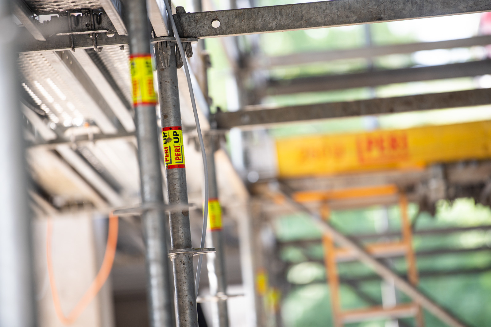 A PERI UP Flex állvány már az összeszerelés kezdetétől kezdve stabil és állékony az átlós merevítők, járótáblák és kikötések nélkül is. Így az állványépítők gyorsan tudtak haladni az építéssel. Az építők először az állványzat vázát szerelték össze, majd felöltöztették az átlós merevítőkkel, a járótáblákkal és a sárgára festett láblemezekkel.