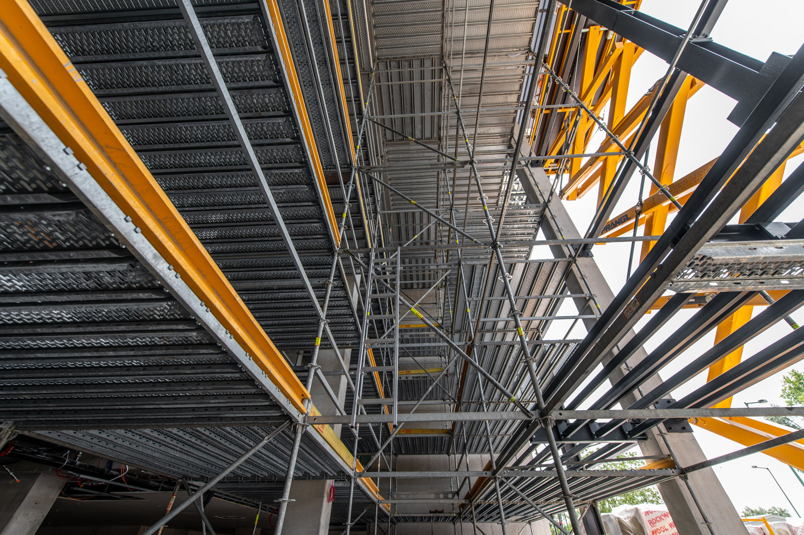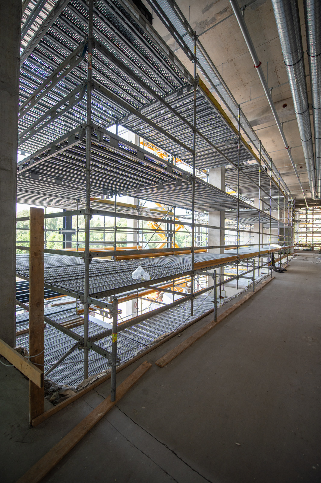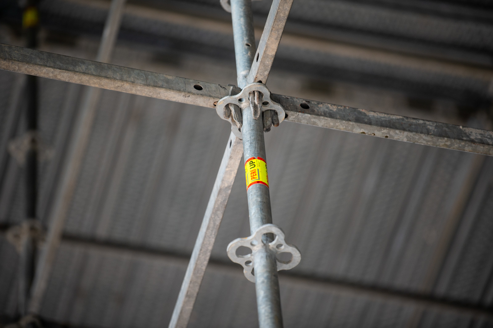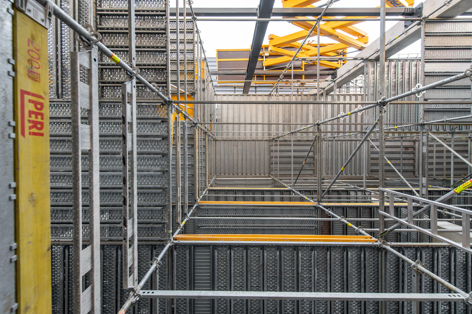 A PERI UP Flex állvány már az összeszerelés kezdetétől kezdve stabil és állékony az átlós merevítők, járótáblák és kikötések nélkül is. Így az állványépítők gyorsan tudtak haladni az építéssel. Az építők először az állványzat vázát szerelték össze, majd felöltöztették az átlós merevítőkkel, a járótáblákkal és a sárgára festett láblemezekkel.