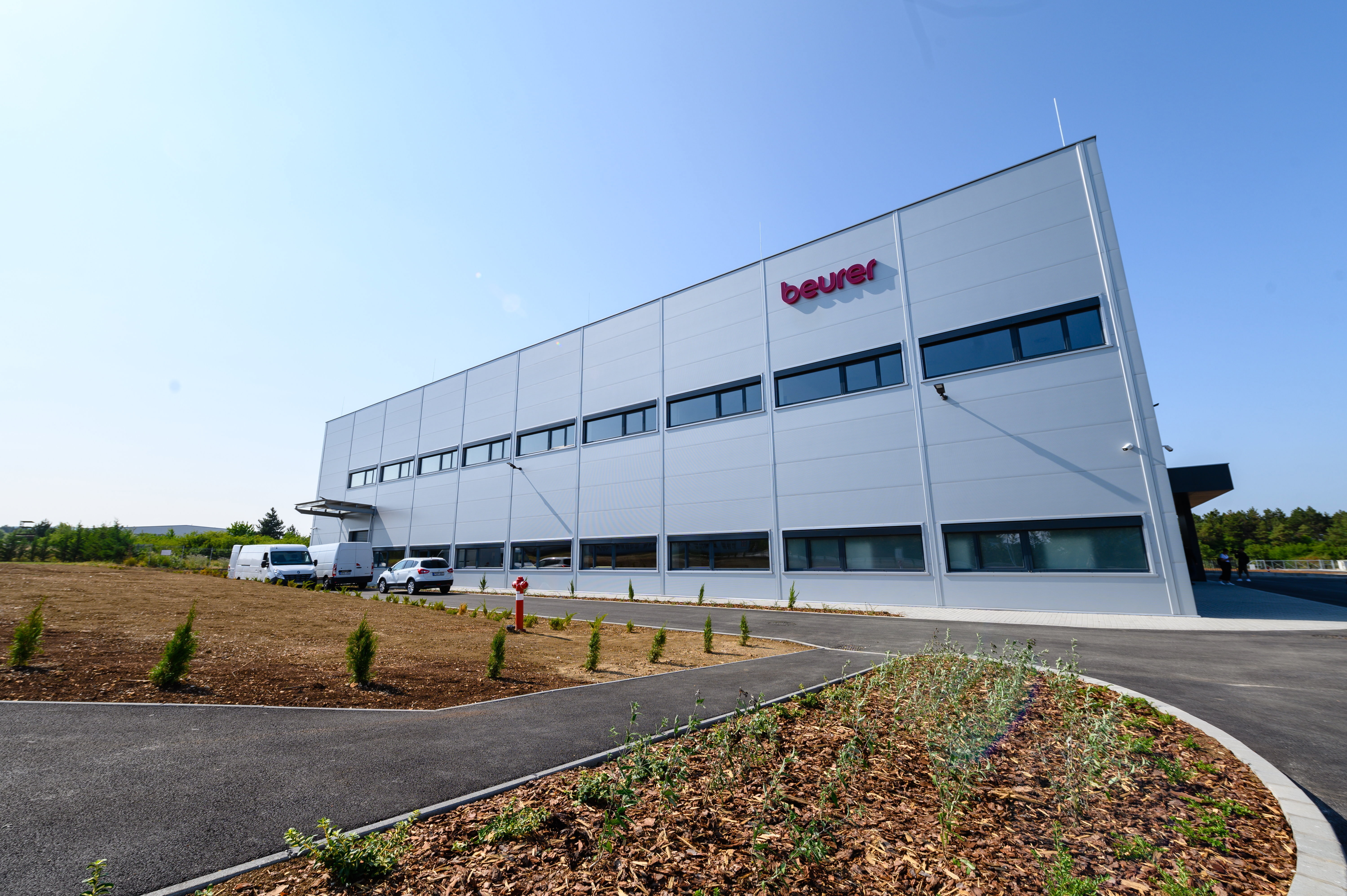 Beurer-Hungaria új veszprémi kétszintes 3000 négyzetméteres épülete mellett egy 1250 négyzetméter alapterületű alapanyagraktárt is kialakítottak.