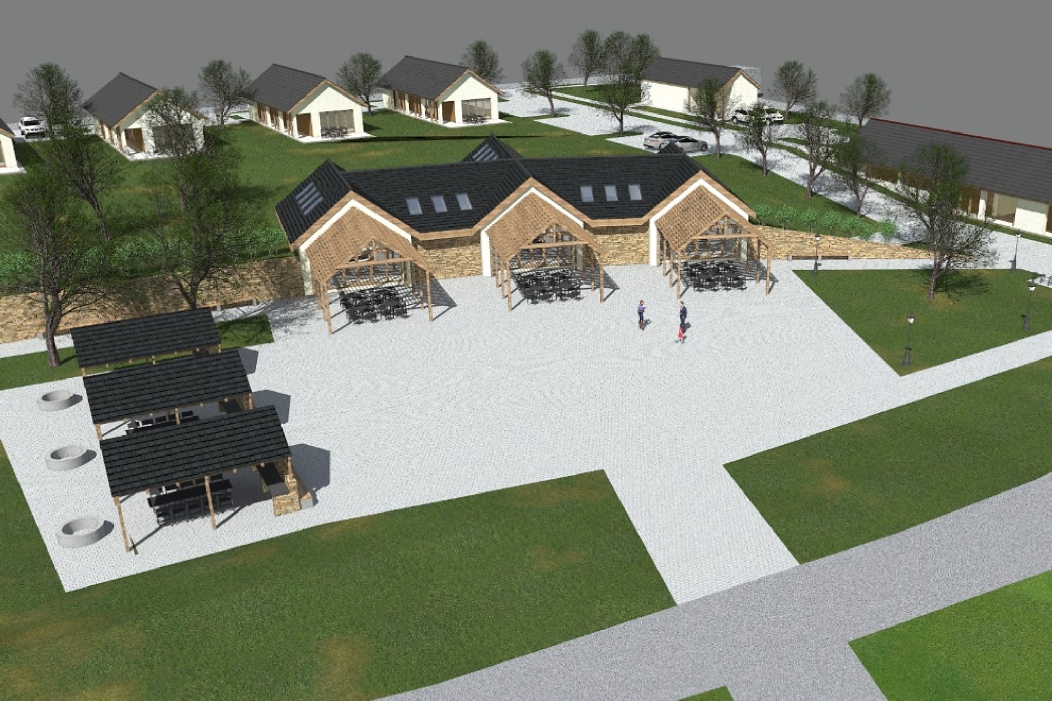 A quad tárolóban quad mosót és garázst helyeznek el. A gasztrofalu magában foglal egy gasztroházat, egy pénztár épületet, valamint 2 apartmanházat, melyből 1 akadálymentes.