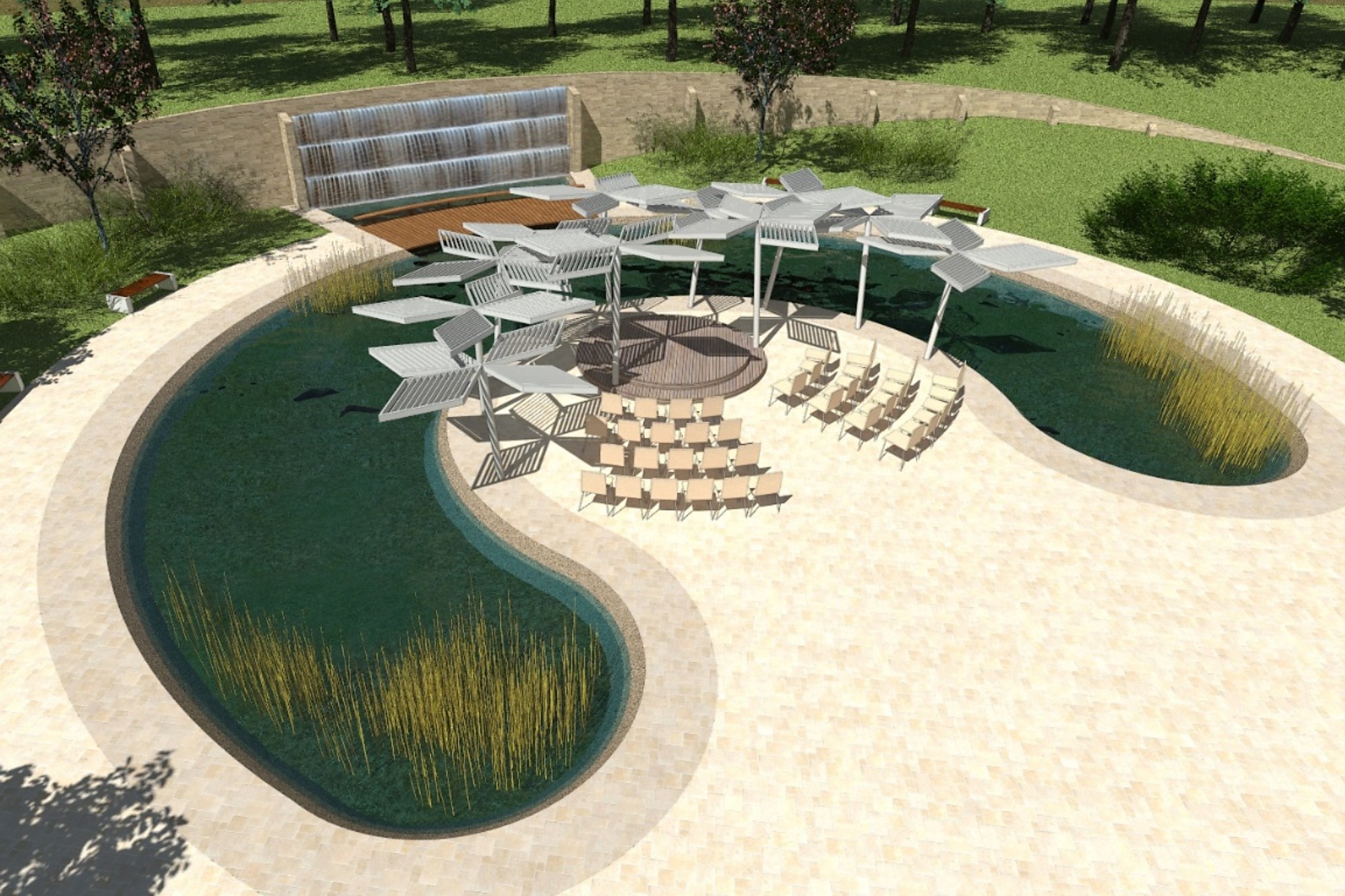 A harmadik szakasz a szintén kör alaprajzú, a rendezvénytérrel metszésben lévő központi vízfelület. Innen íves lépcső vezet a felső sétányra. A sétány egy része a vízfelület fölé nyúlik majd, ahonnan egy konzolból vízfüggöny hullik a medencébe.