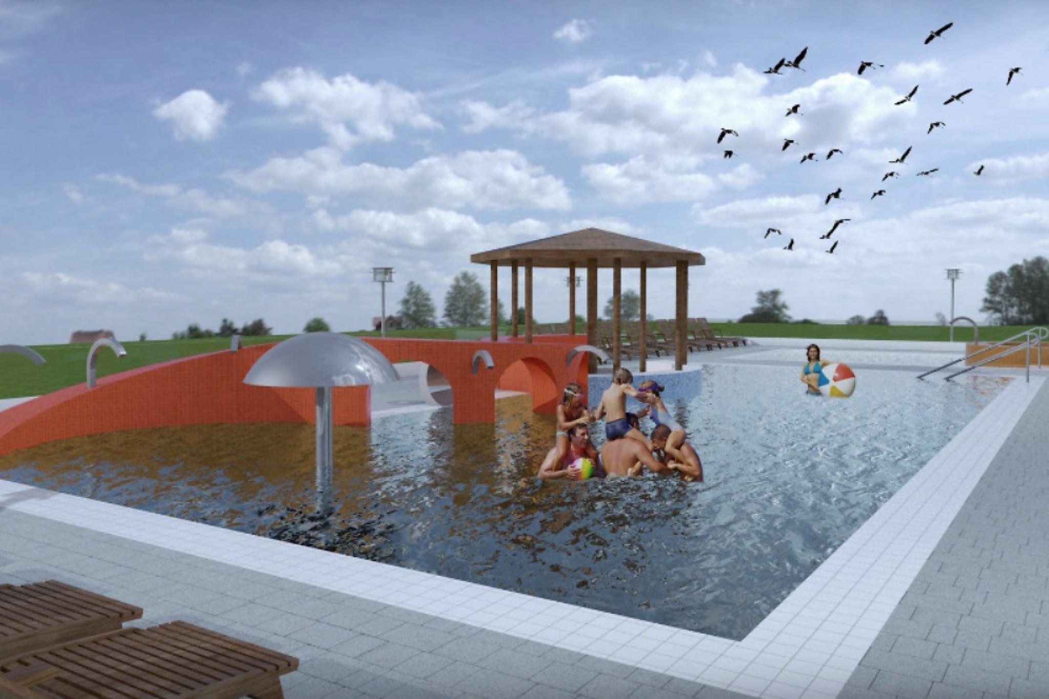 A második szakaszon lesz a park központi, kör alaprajzú rendezvénytere, amely körül medencét alakítanak ki programozható vízsugárral.