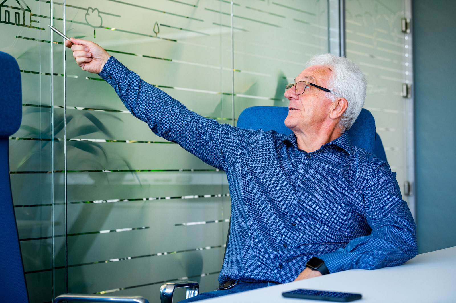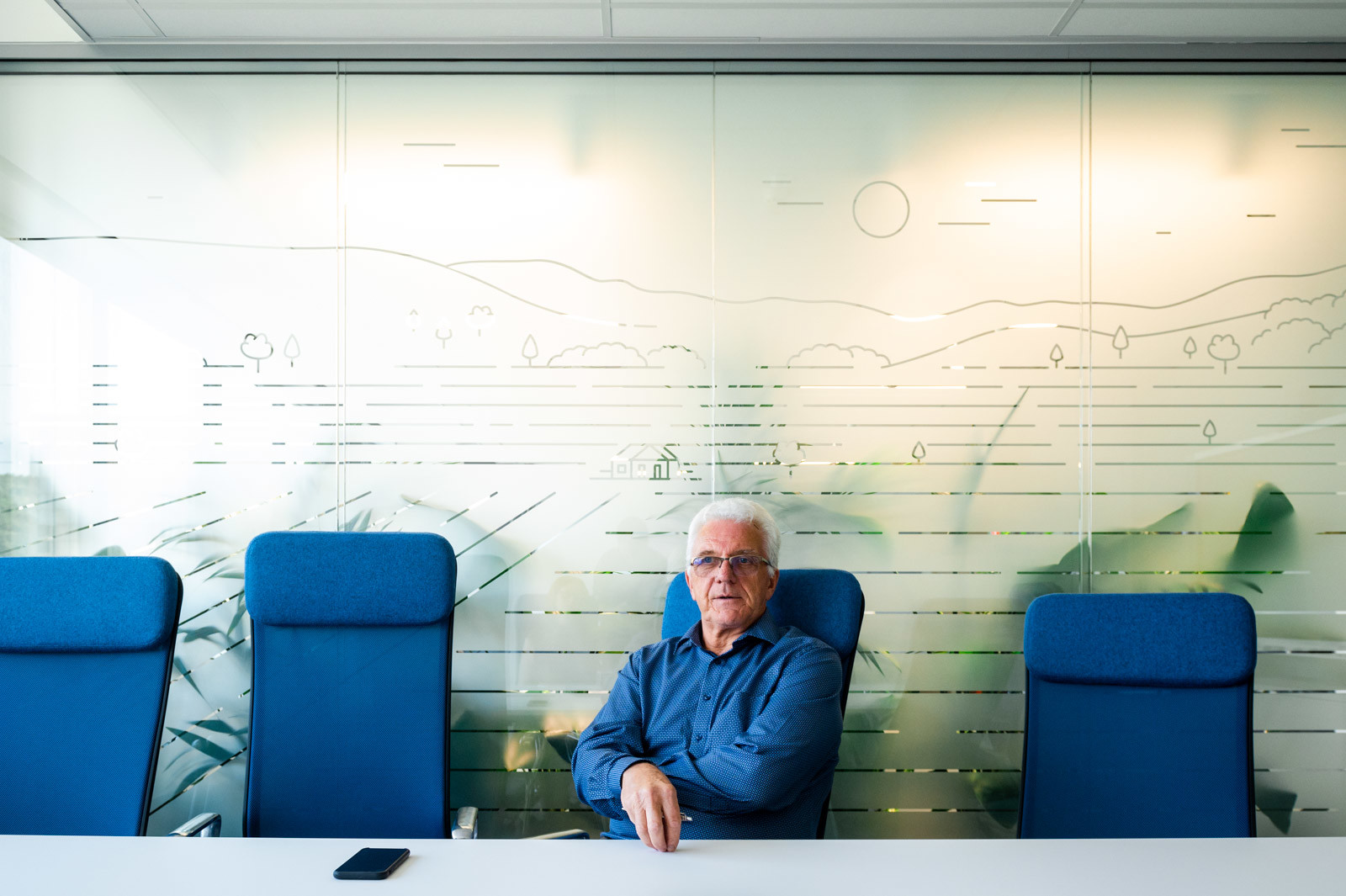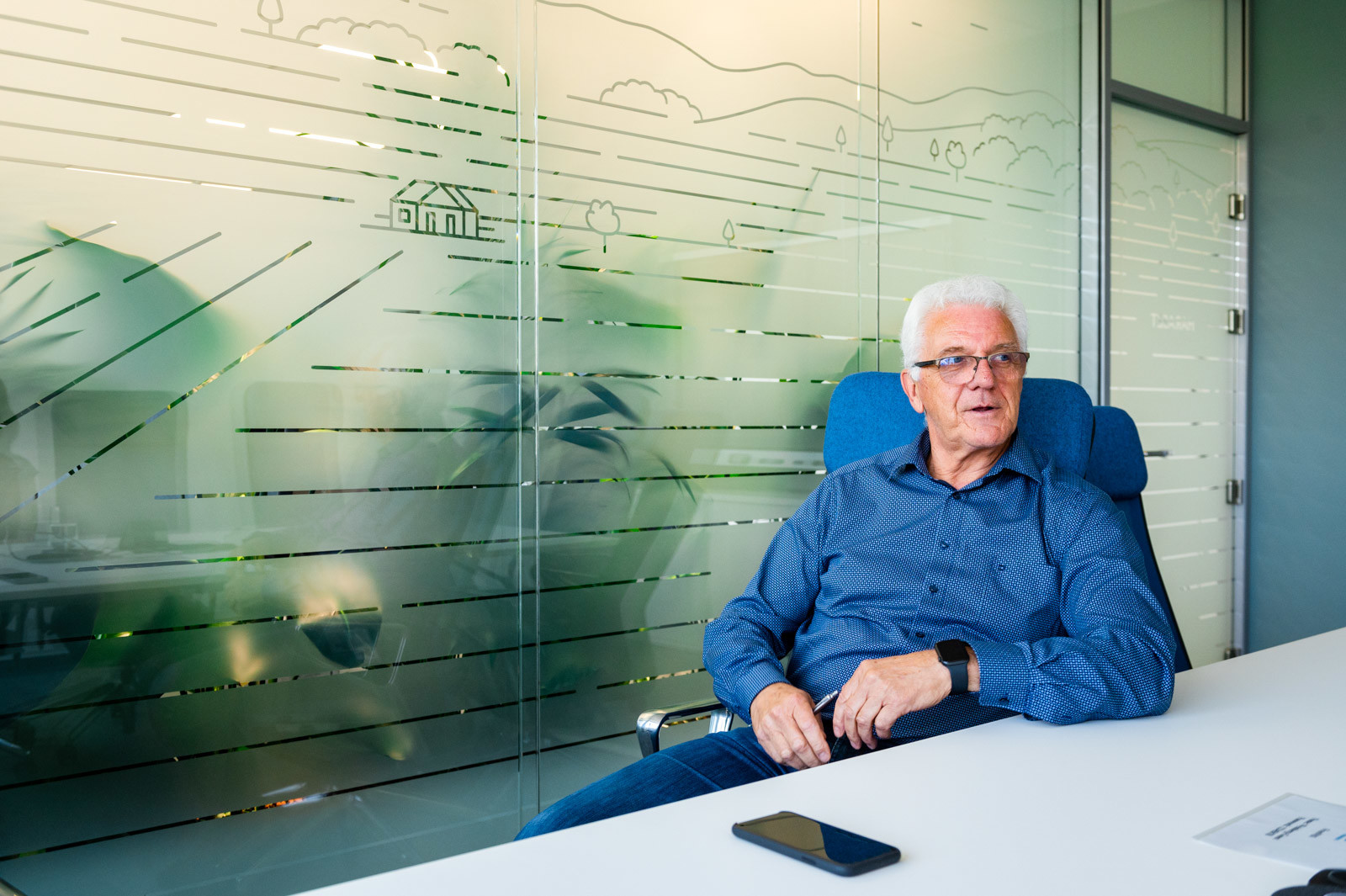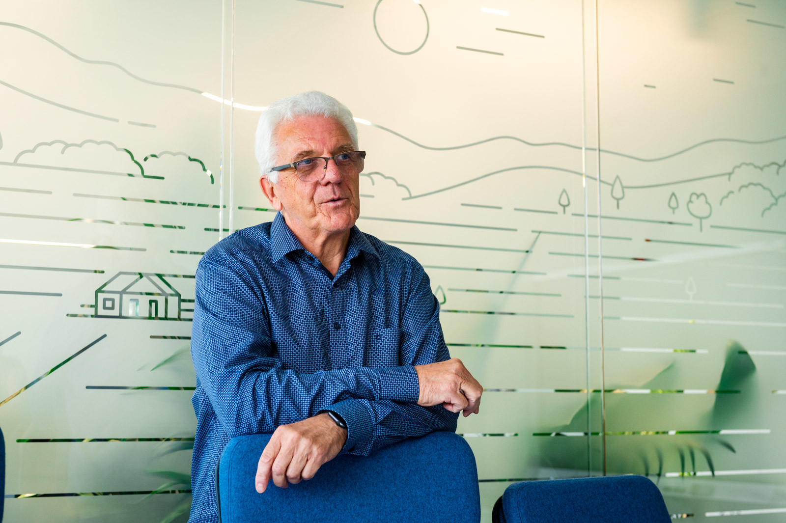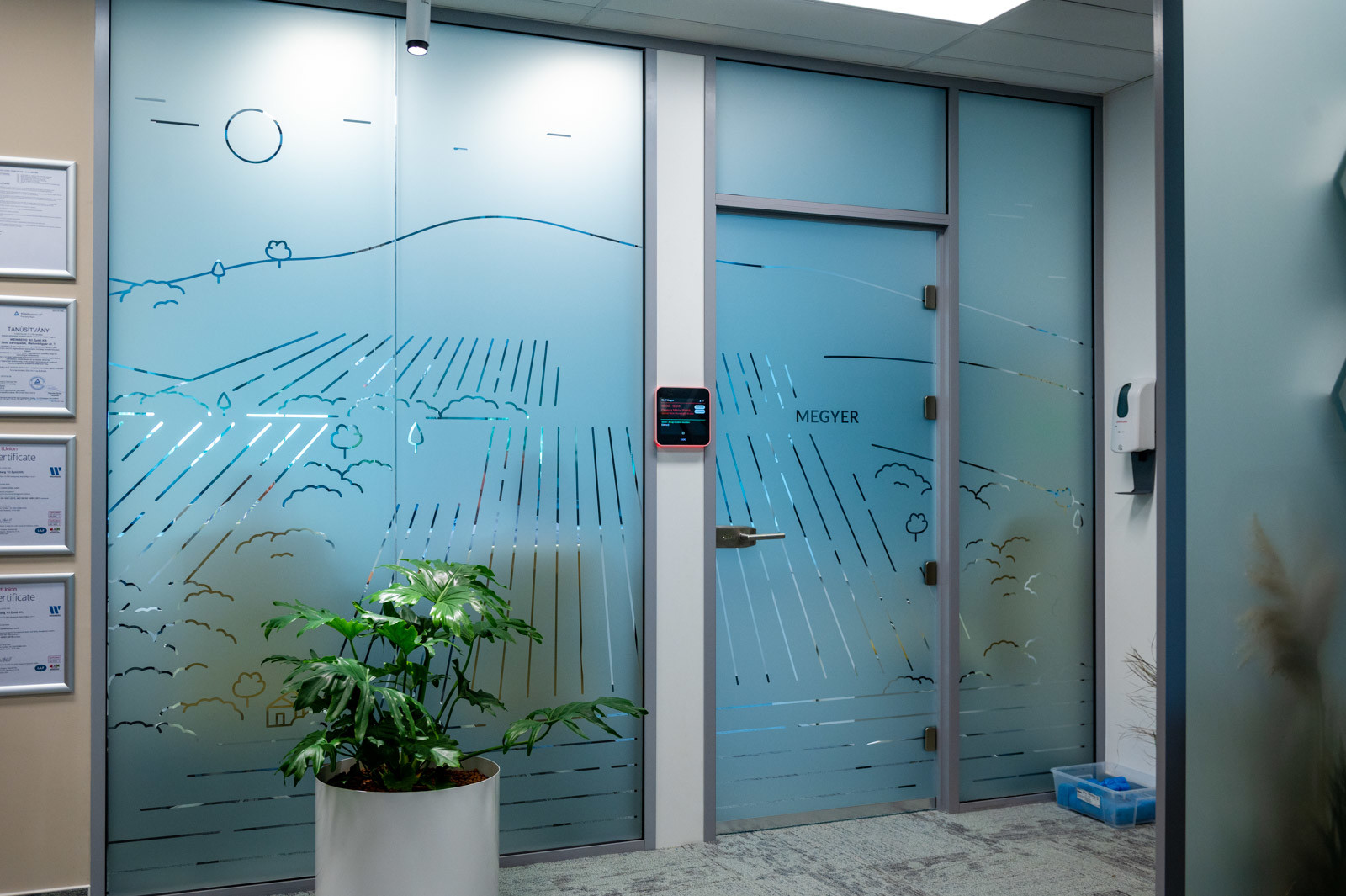 a szakember büszkén mutatta a tárgyalók üvegfalain látható, szőlőbirtokokat szimbolizáló, légi felvételek alapján készült stilizált grafikákat, amelyekről a helyiségek a nevüket is kapták.