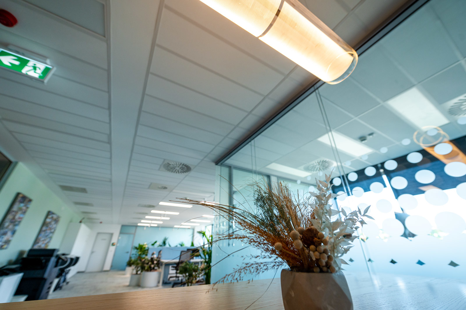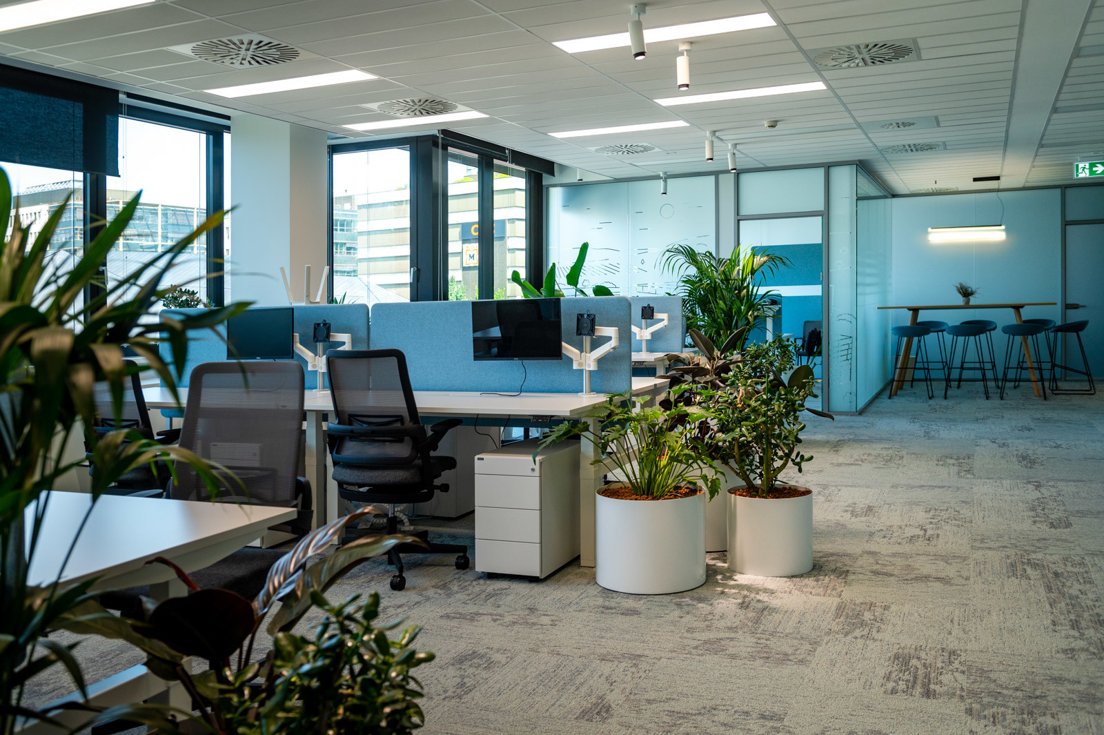Az irodában rengeteg növényt láttunk, amelyek térelválasztó szerepükön túl, komfortnövelő funkcióval is bírnak, és külön erre a célra telepített lámpák biztosítják számukra a megfelelő fényviszonyokat.