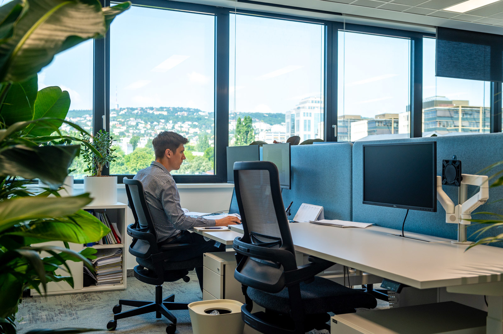 18 munkaállomást alakítottak ki a jelenleg 11 fős állandó létszám részére, így a vidékről beugró kollégák számára is mindig van hely. A helyiséget állítható magasságú asztalokkal, és ergonomikus székekkel rendezték be.