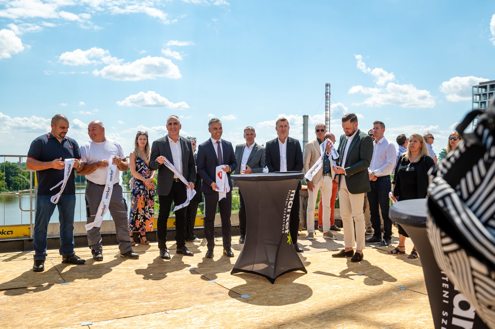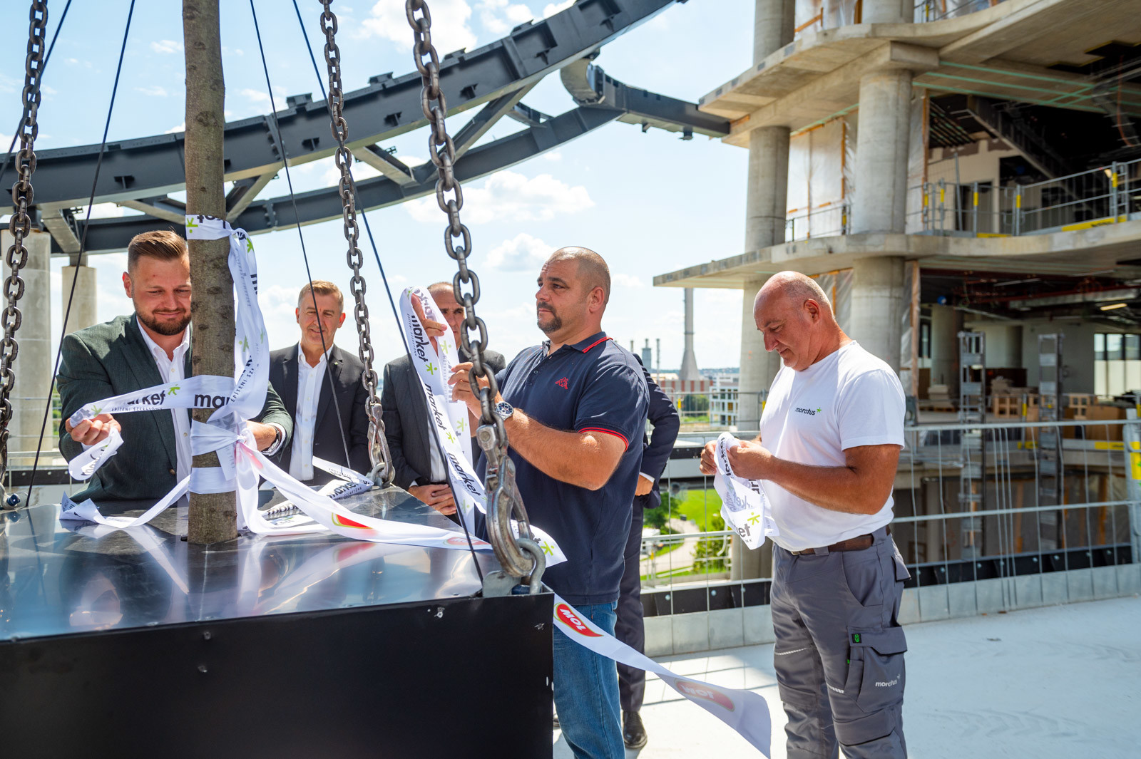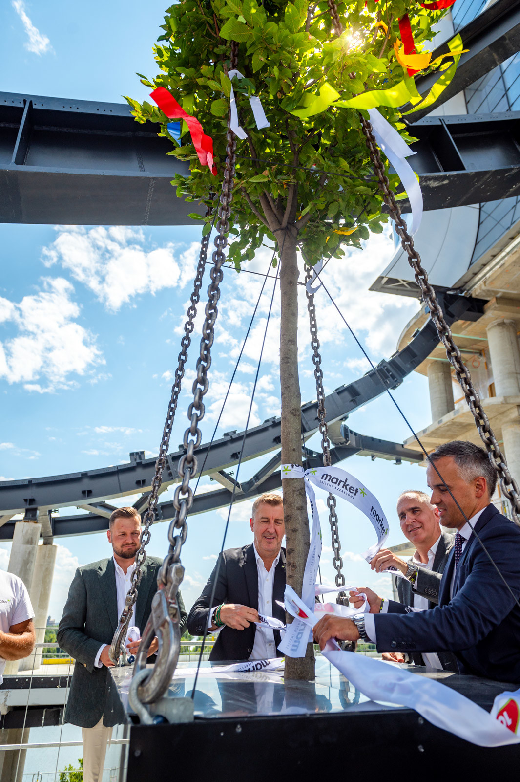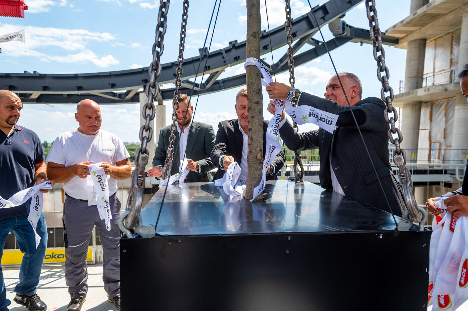 A beszédek végeztével Scheer Sándor, Ratatics András és Ritter Ádám, valamint Wolf András, a Market műszaki igazgatója Czégény Zoltán vezető vasszerelővel, illetve Bressai László ács brigádvezetővel közösen helyezte el a koszorút a darun mely azt mintegy 140 méter magasra emelte.