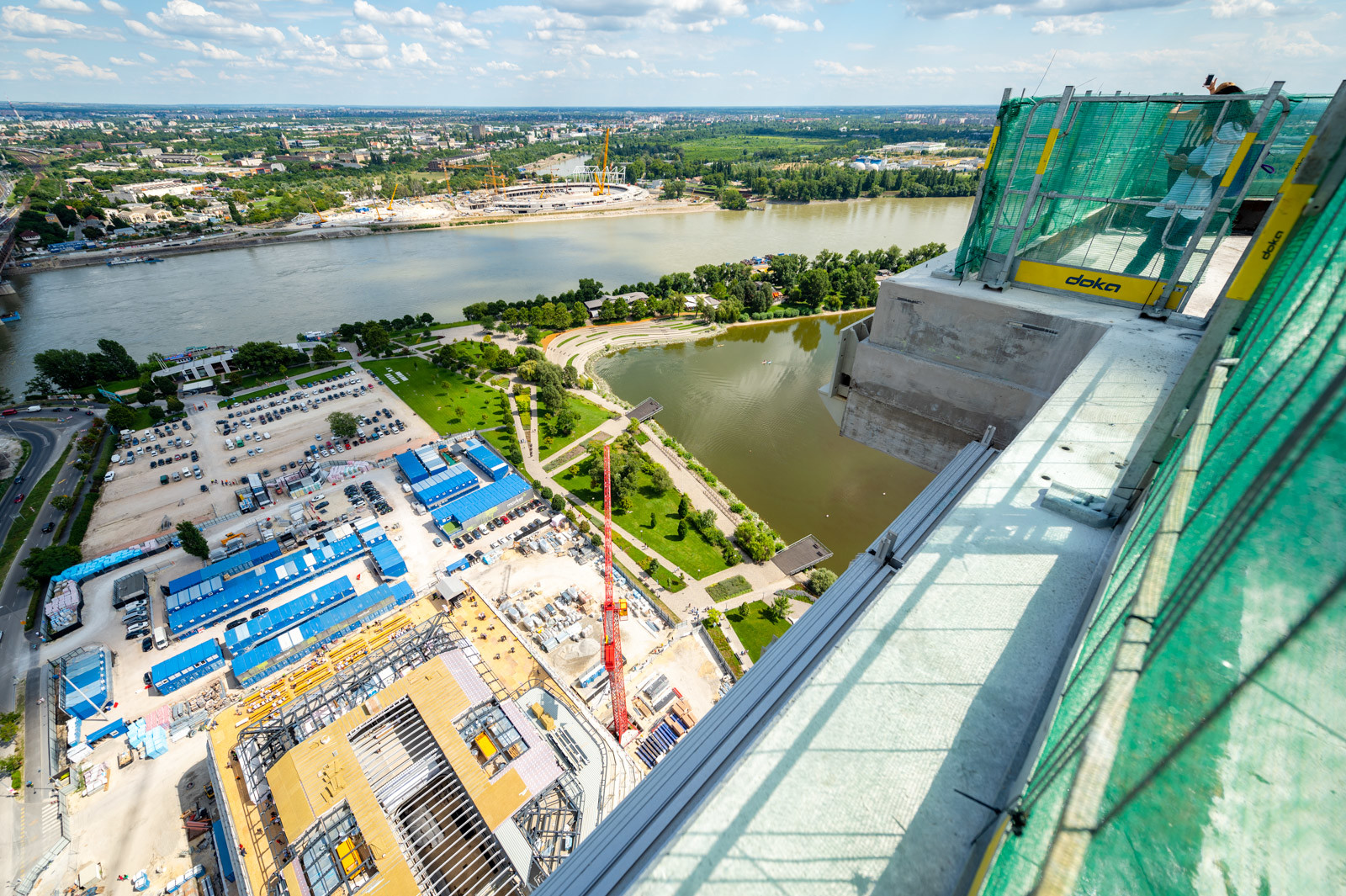A magasban folyó munka miatt a magyarországi magasépítésben egyedülálló technológiát, úgynevezett automata szélpajzs-rendszert kellett alkalmazni, ami a biztonságos munkavégzést és a szakemberek komfortérzetét szolgálja – ez összesen mintegy 100 tonna zsaluzatból épült meg. A rendszer az épülő tartószerkezethárom legfelső szintjét körbeölelve védte a magasban dolgozókat, és hidraulikák segítségével folyamatosan felfelé kúszva követte a szerkezetépítés aktuális készültségi fokát.