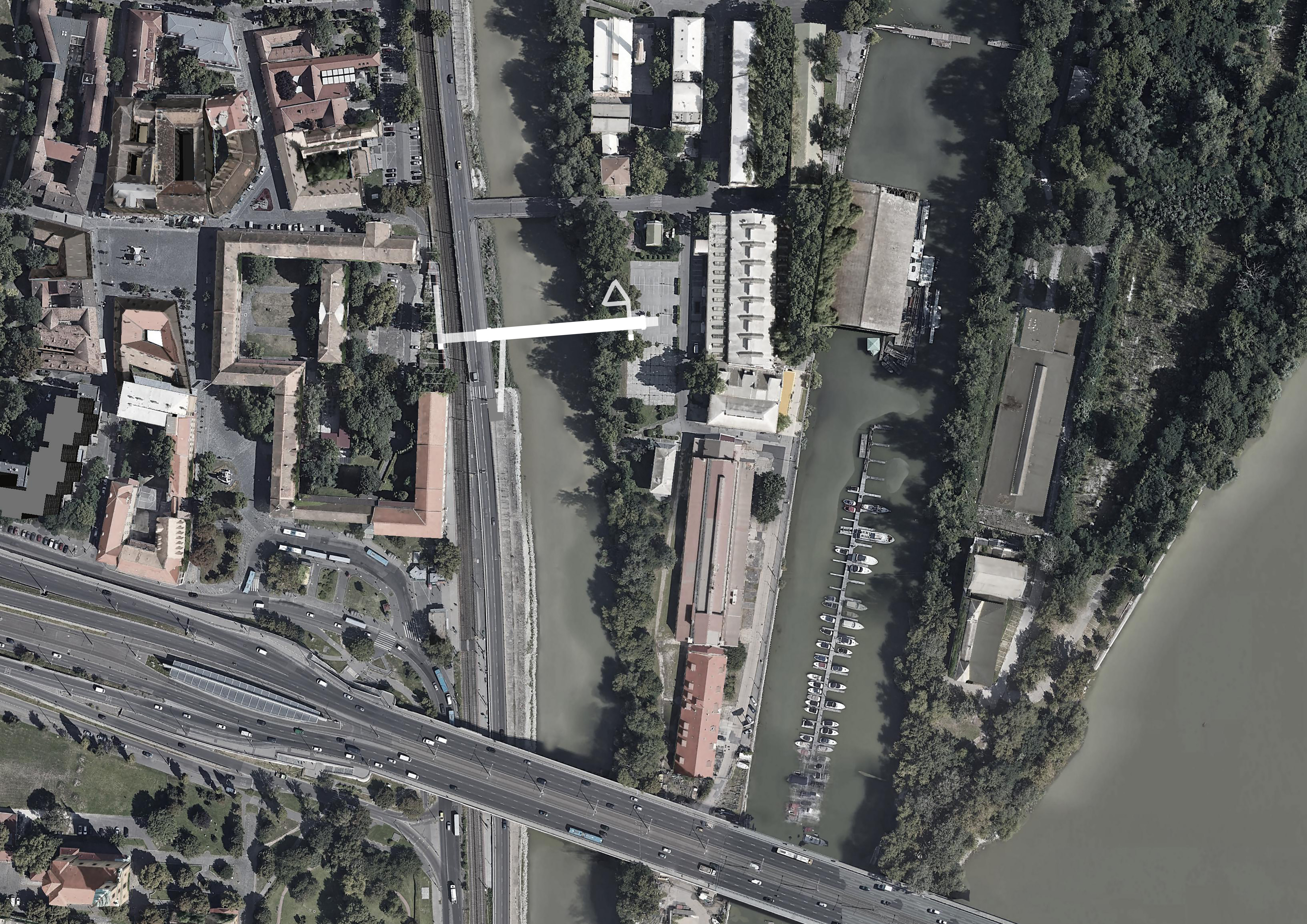 „A Hajógyári-sziget déli csúcsának budai átkötése a meglévő, közúti forgalmat kiszolgáló H-híddal jelenleg egyik parton sem csatlakozik szervesen a környező városszövetbe. A budai hídfő környezetében a rakparti út és a H5 HÉV vonala erős akadályként jelenik meg az óbudai óváros és a dunai átkelő között. Egy ide elhelyezett hídelem kétszintű gyalogoshídként lehetőséget teremt ennek a határvonalnak és a folyó az átlépésére” – indokolták a projekt létjogosultságát a Speciálterv munkatársai.
