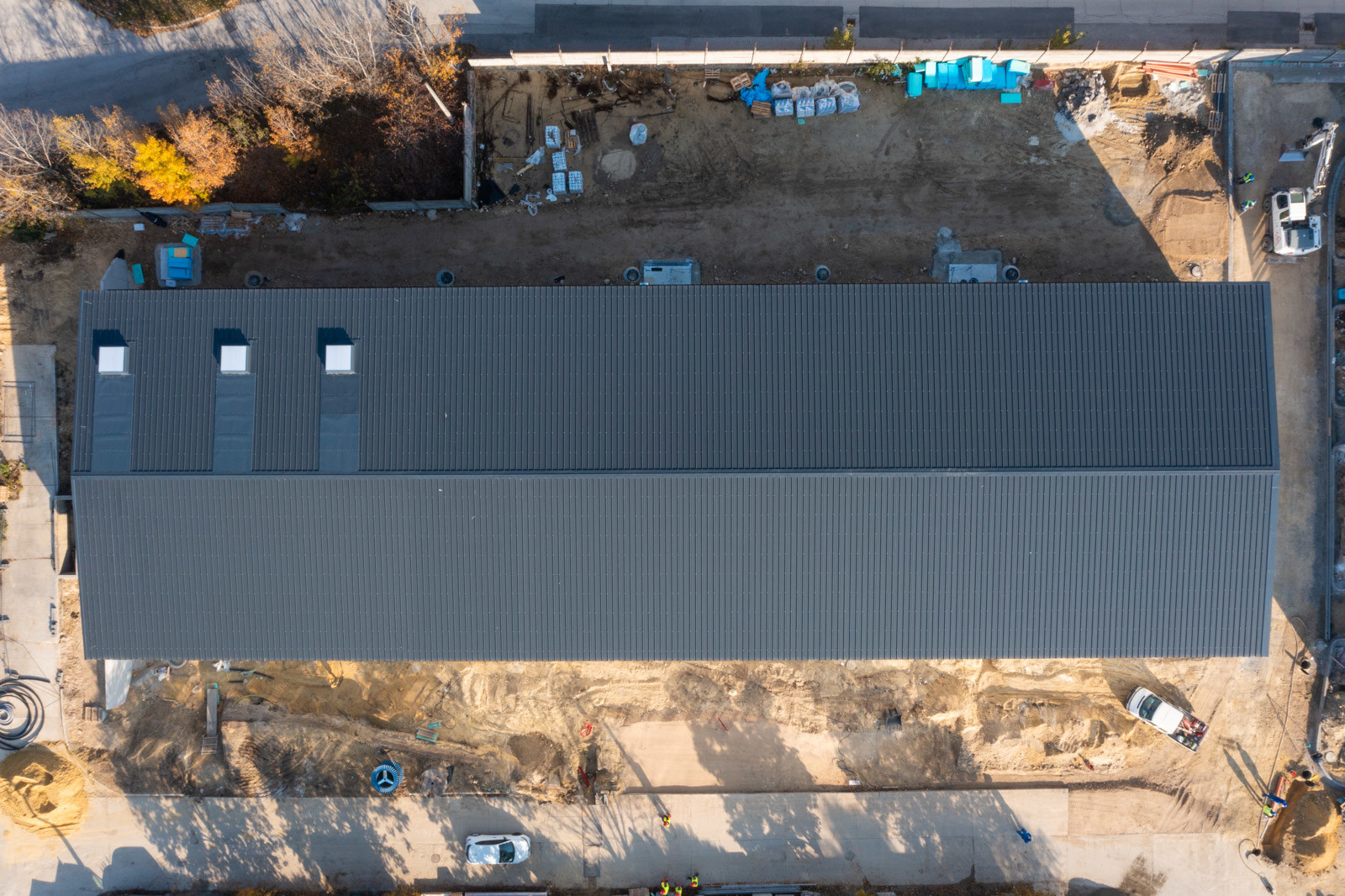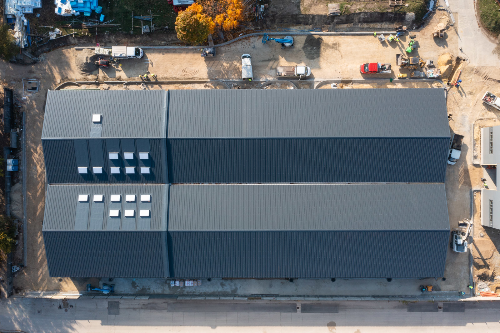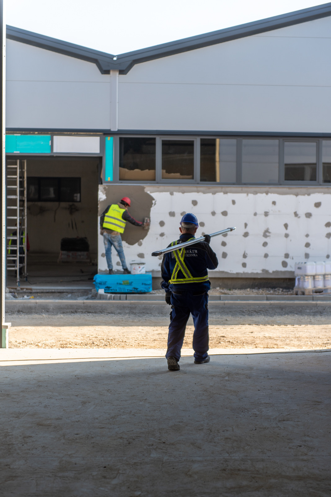 A kivitelezés jelen fázisában már mindkét épületnél elkészültek a fő szerkezeti tartóelemek és ezek héjalásai, valamint beépítették a homlokzati nyílászárókat.