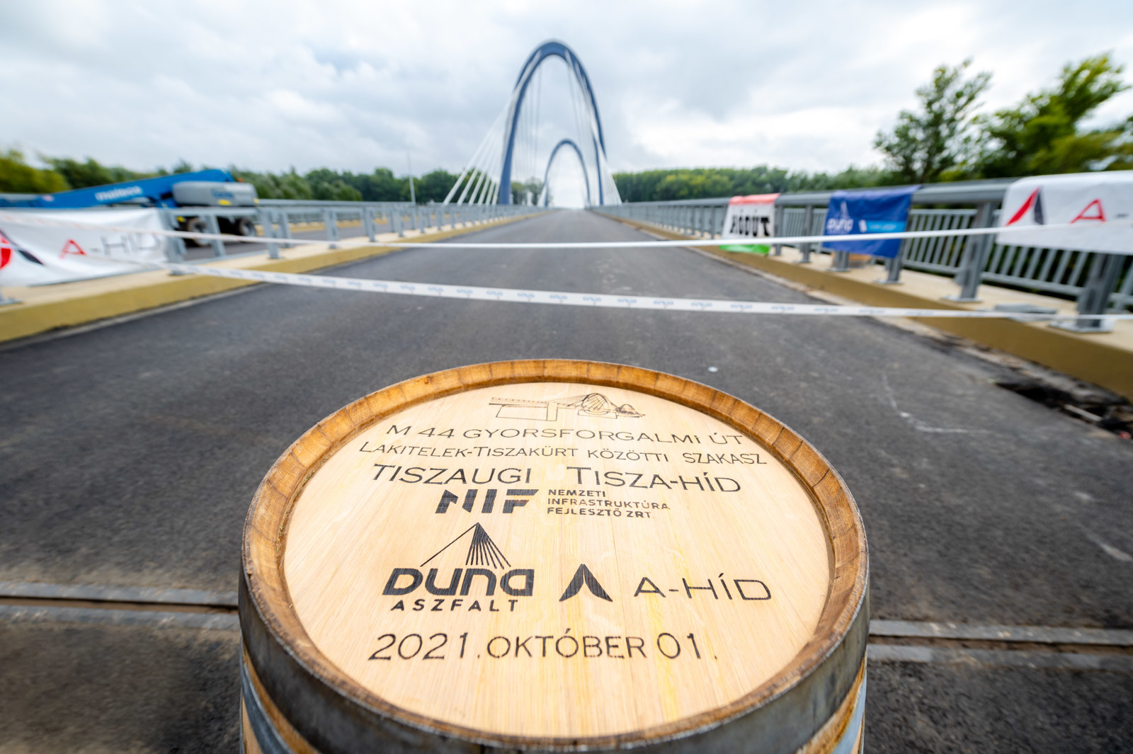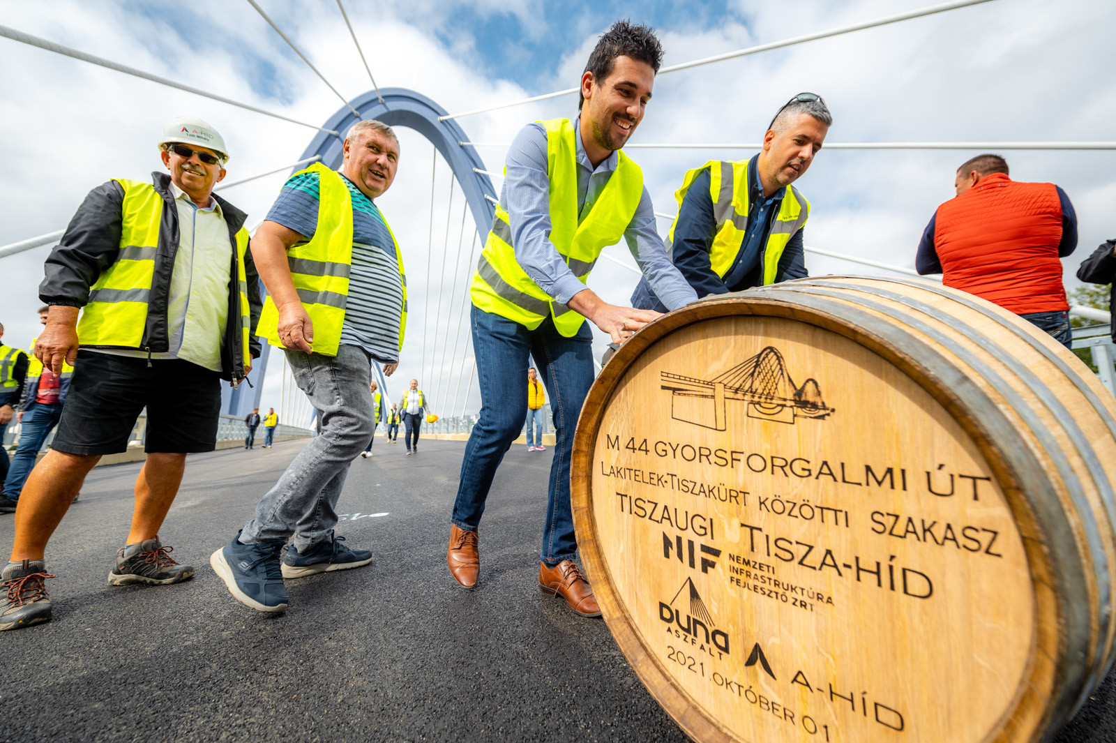 Alig pár napja számolt be lapunk az M44 gyorsforgalmi út új Tiszaugi-hídján történt sikeres próbaterhelésről, most újabb eseményről tudósíthatunk; pénteken délben sor került a hídépítéseknél hagyományos hordógurításra. A hordógurítás szokása abból a hiedelemből ered, hogy aki elsőként megy át a hídon, azt balszerencse éri.