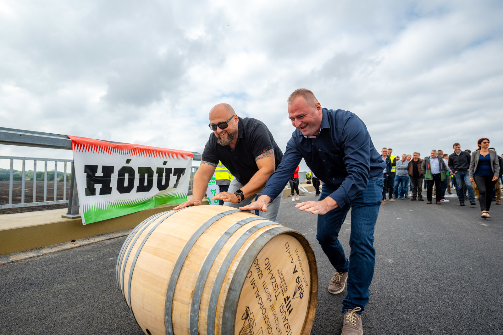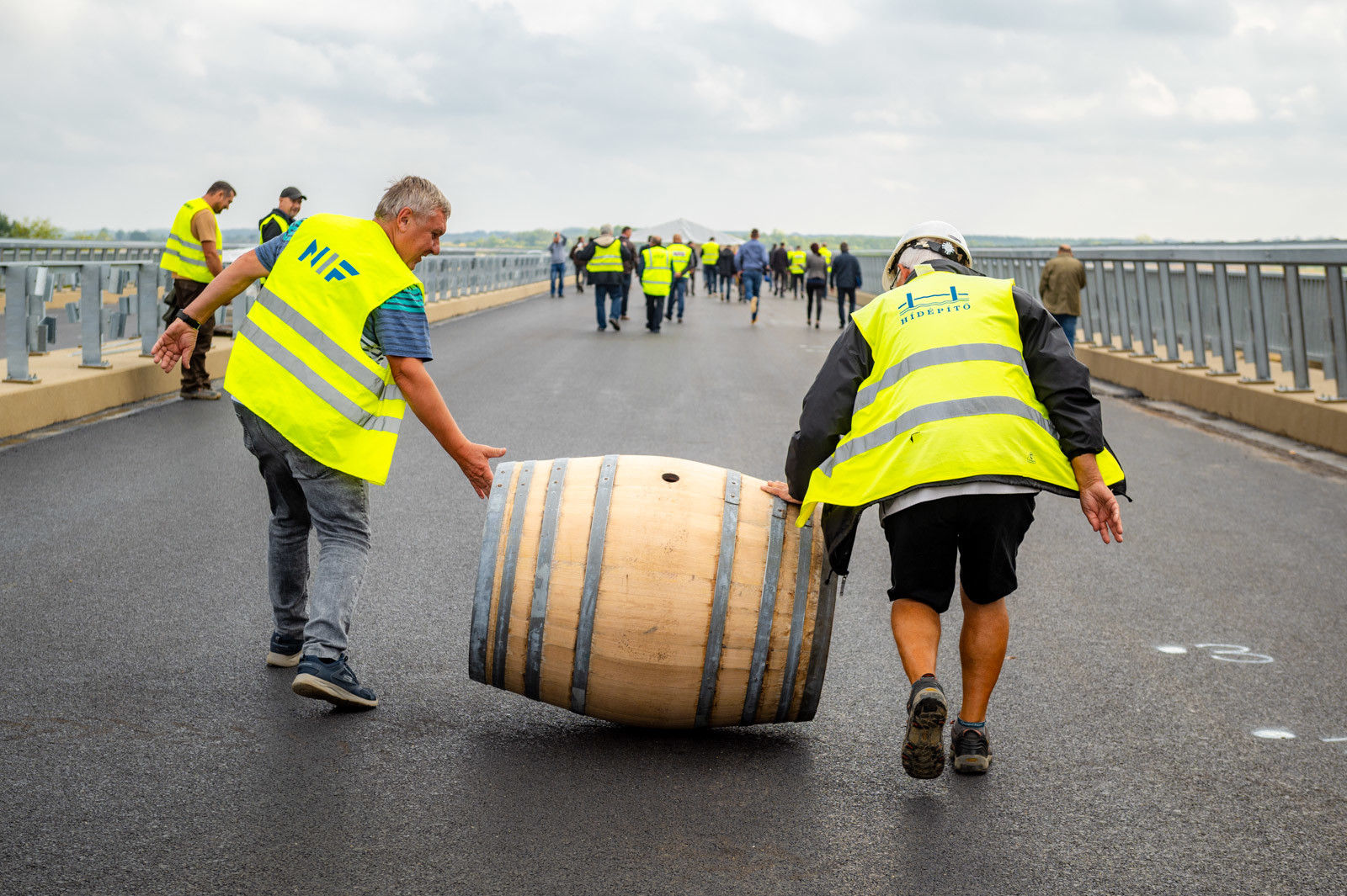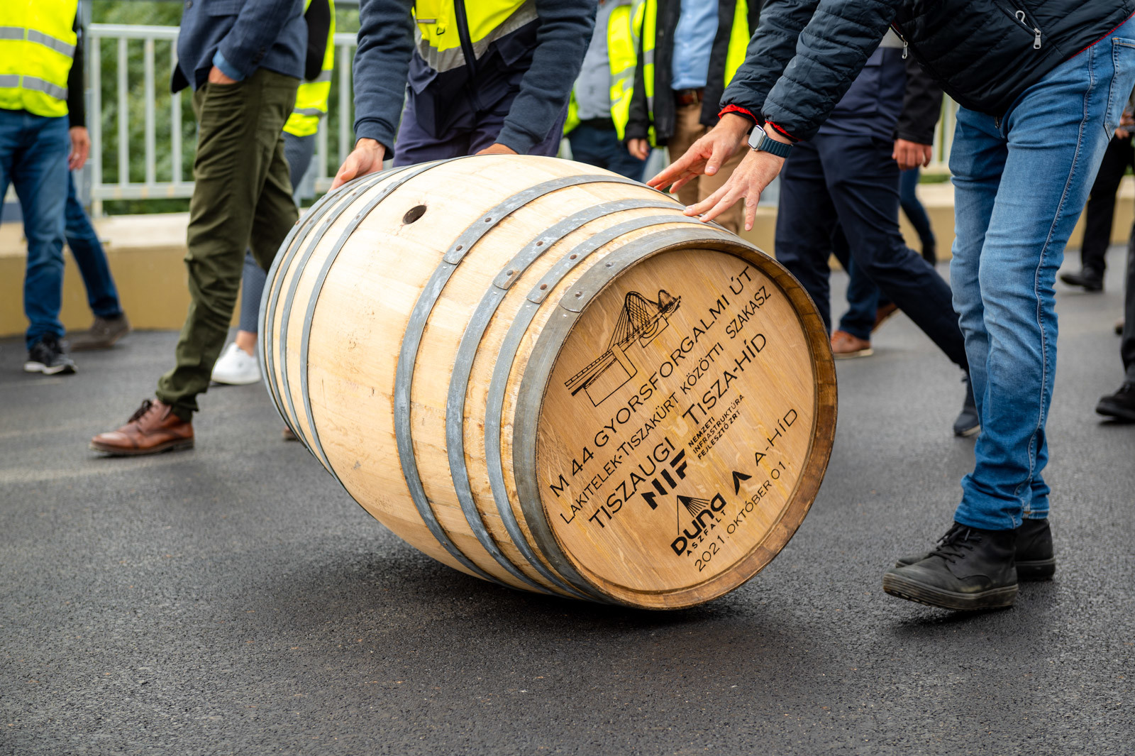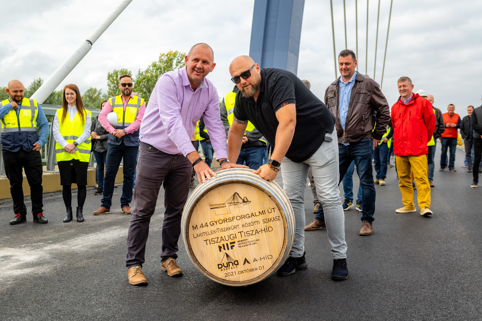 Az ünnepélyes hordógurításon felszólalt Varga Antal, a Duna Aszfalt ügyvezetője és Sal László, az A-Híd vezérigazgatója.