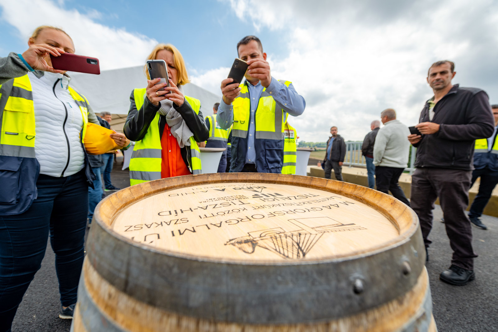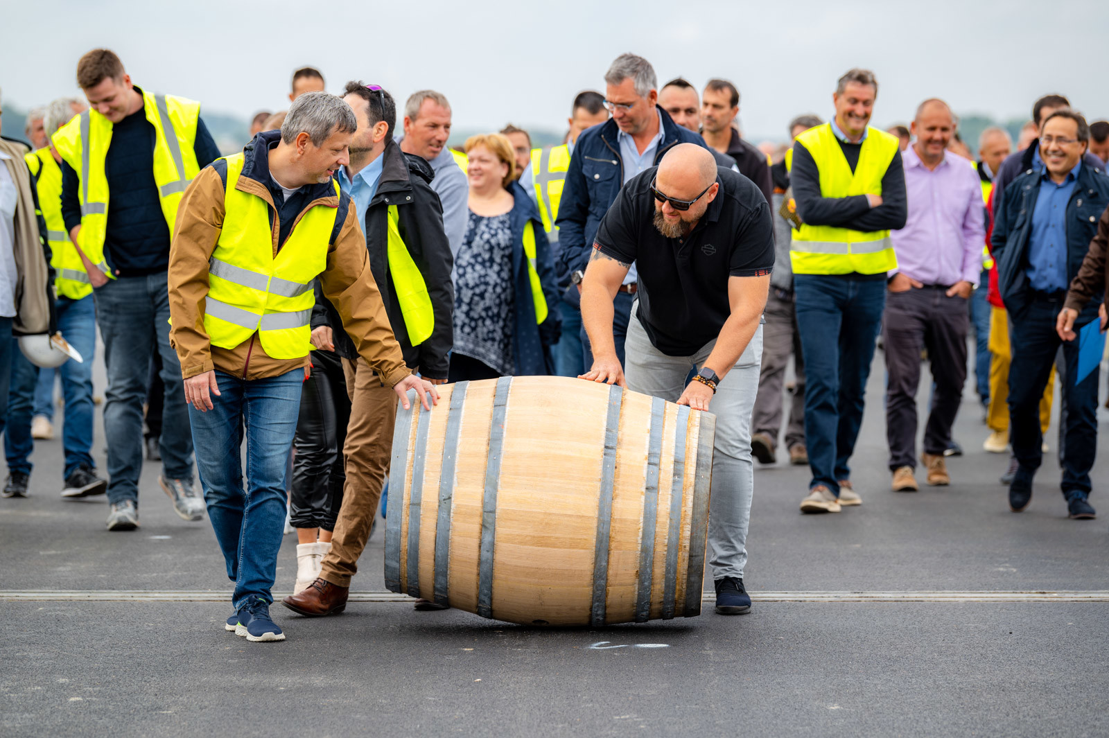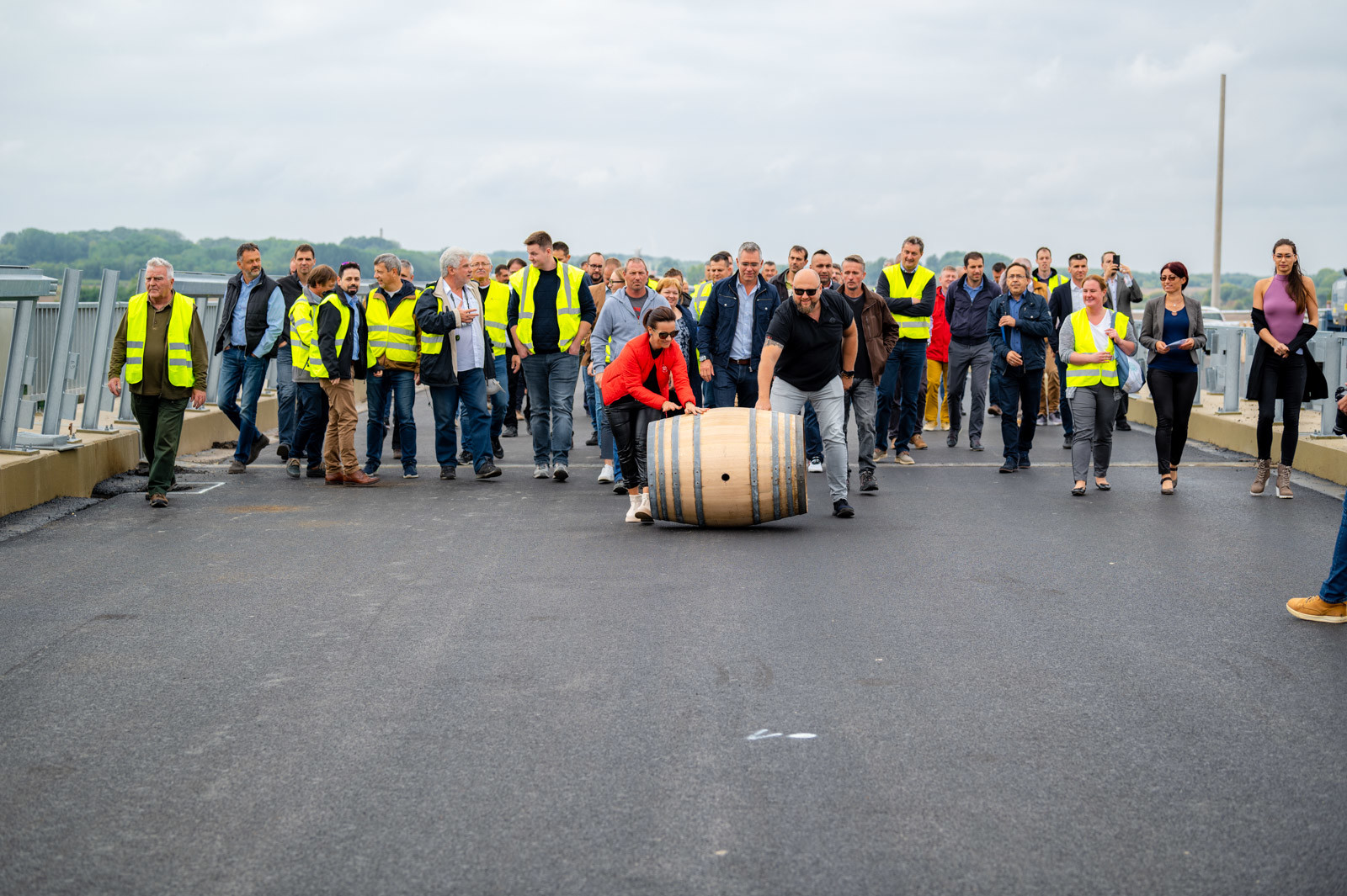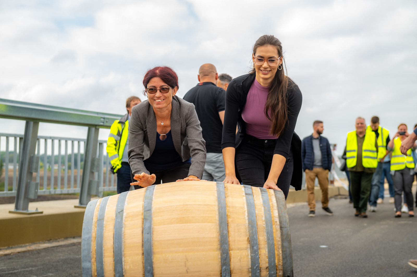 Az ünnepélyes hordógurításon felszólalt Varga Antal, a Duna Aszfalt ügyvezetője és Sal László, az A-Híd vezérigazgatója.