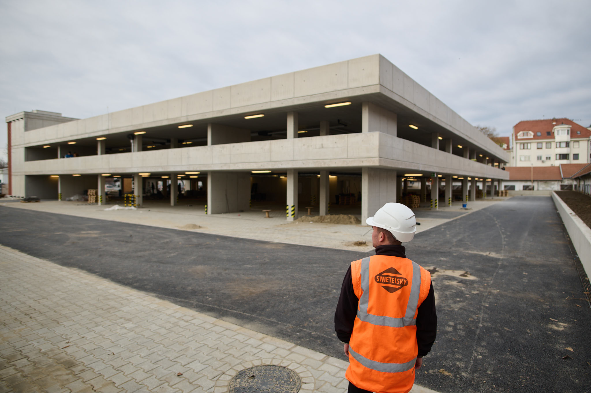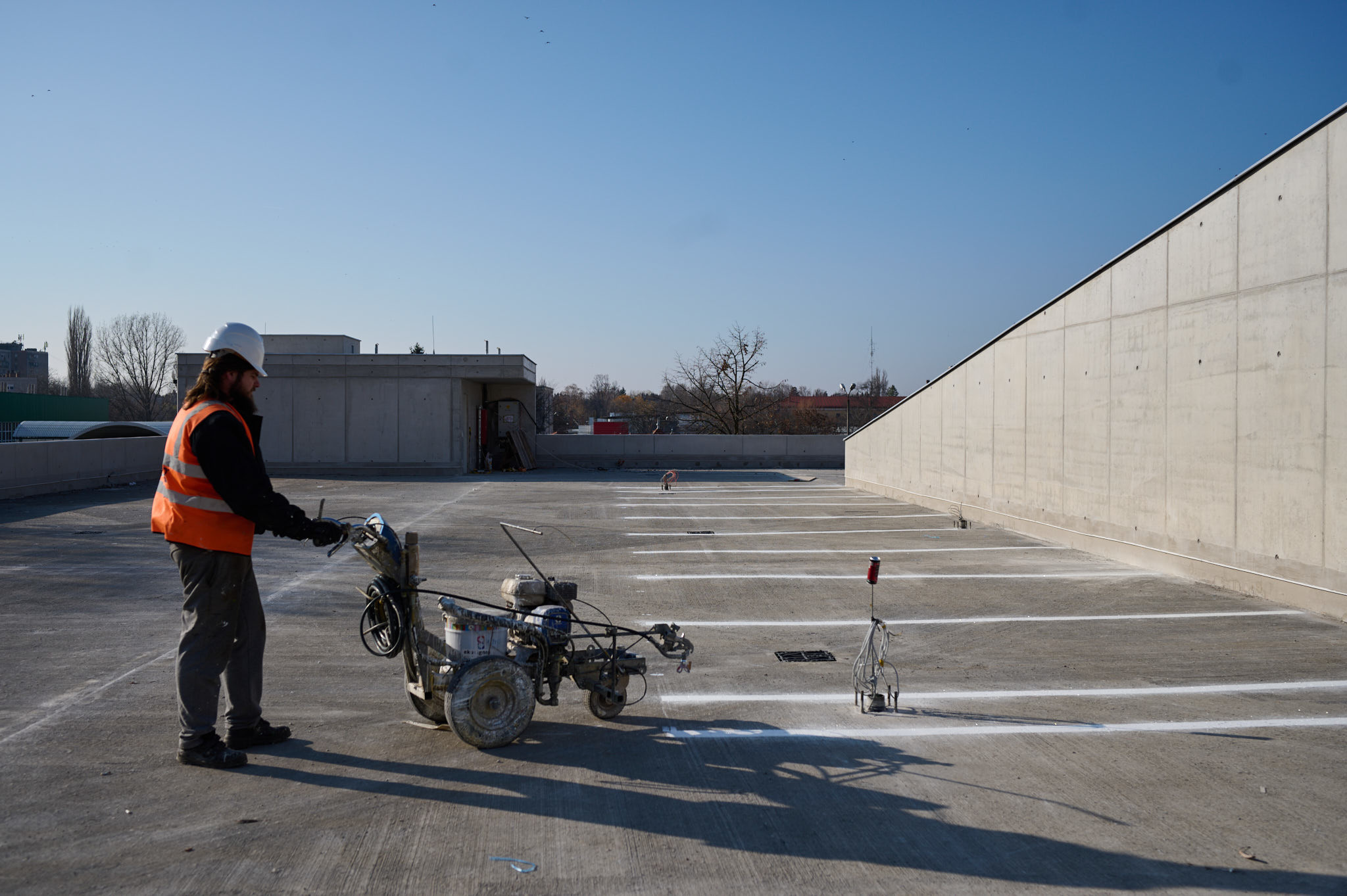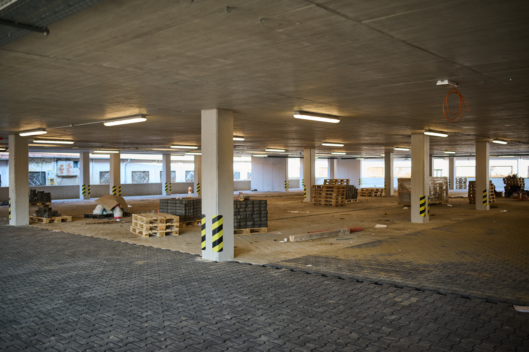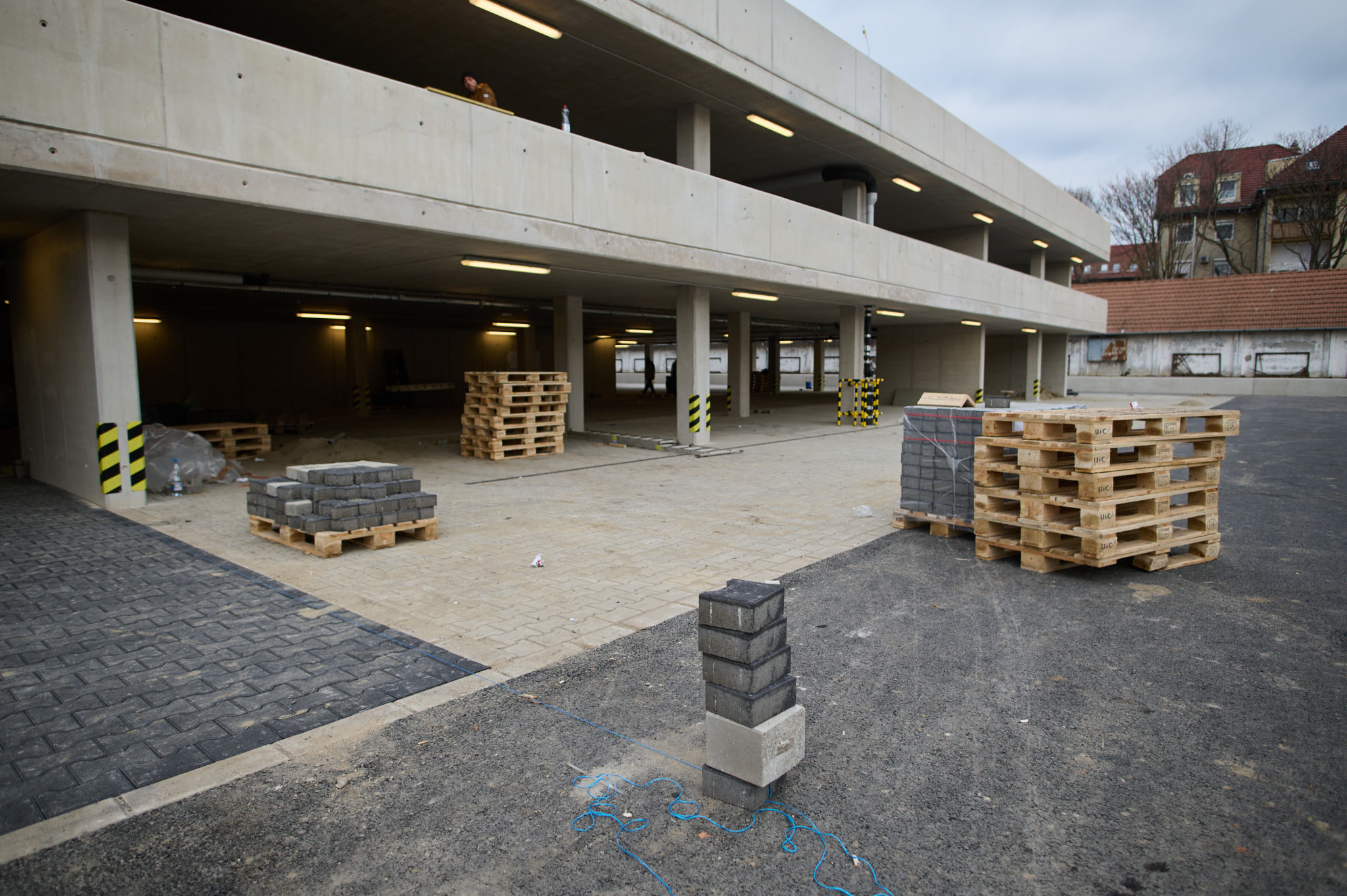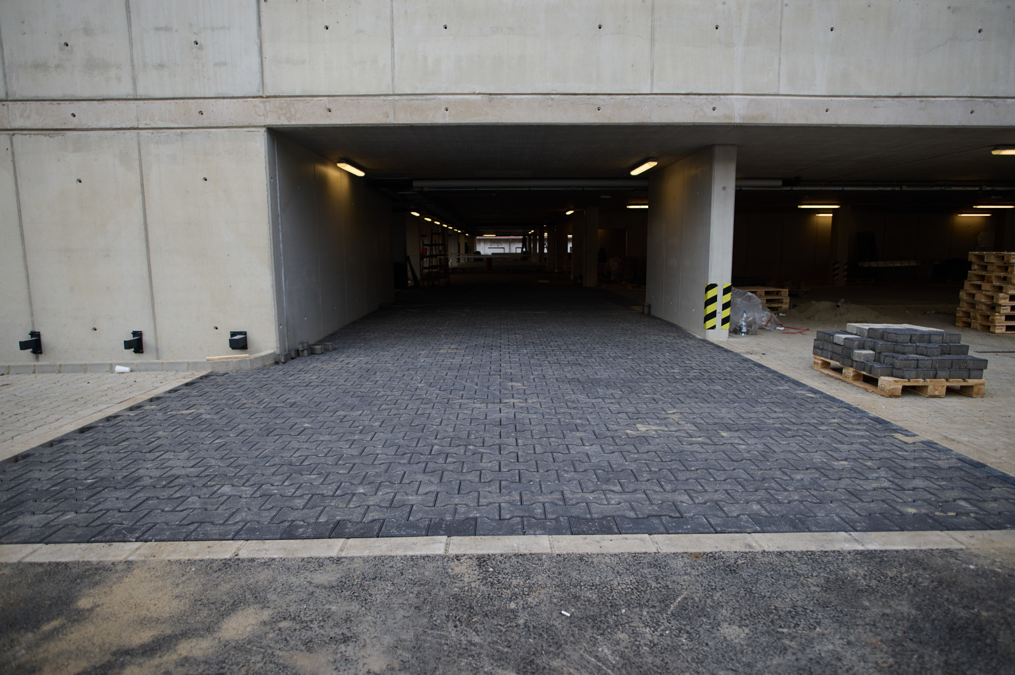 Miután a parkolóház szerkezetileg megvalósult, az épületben elektromos, gépész, műgyanta, lakatos és térkövezési munkálatokat végeznek a kivitelezők.