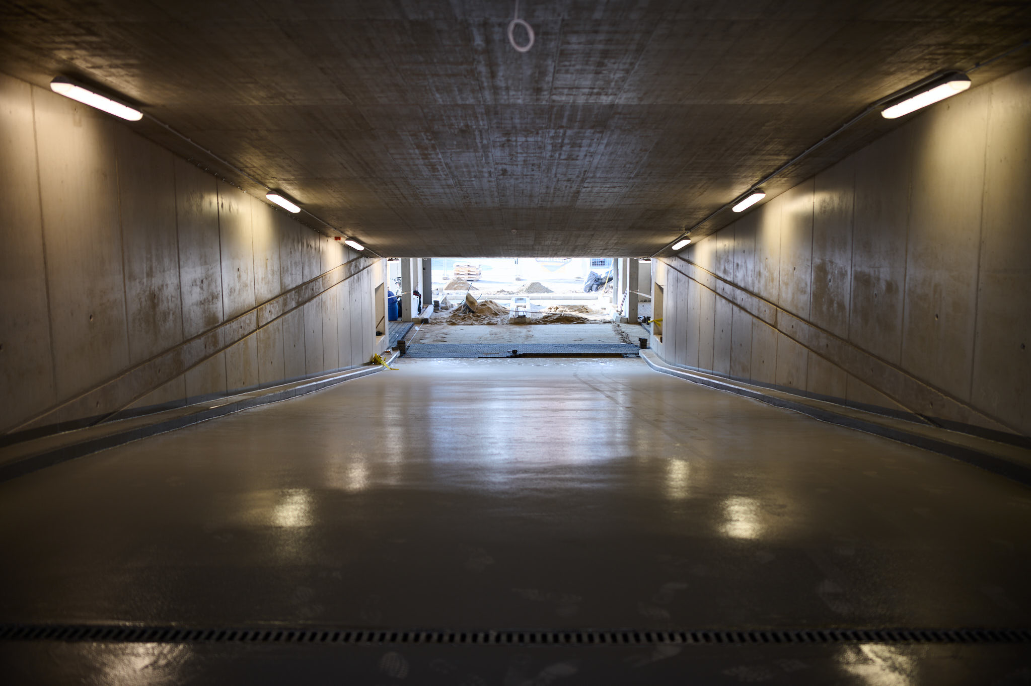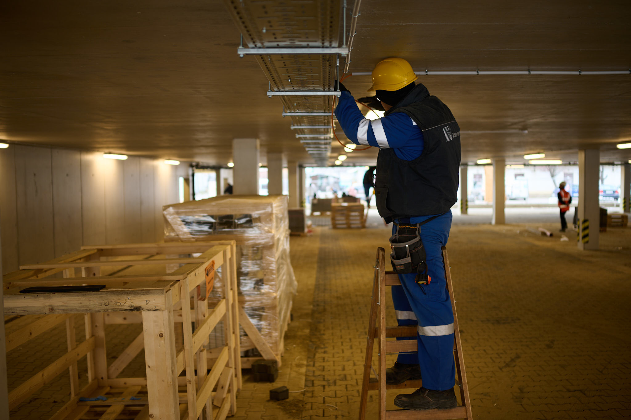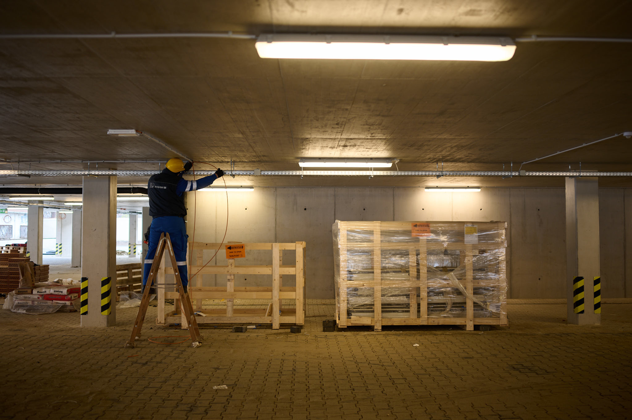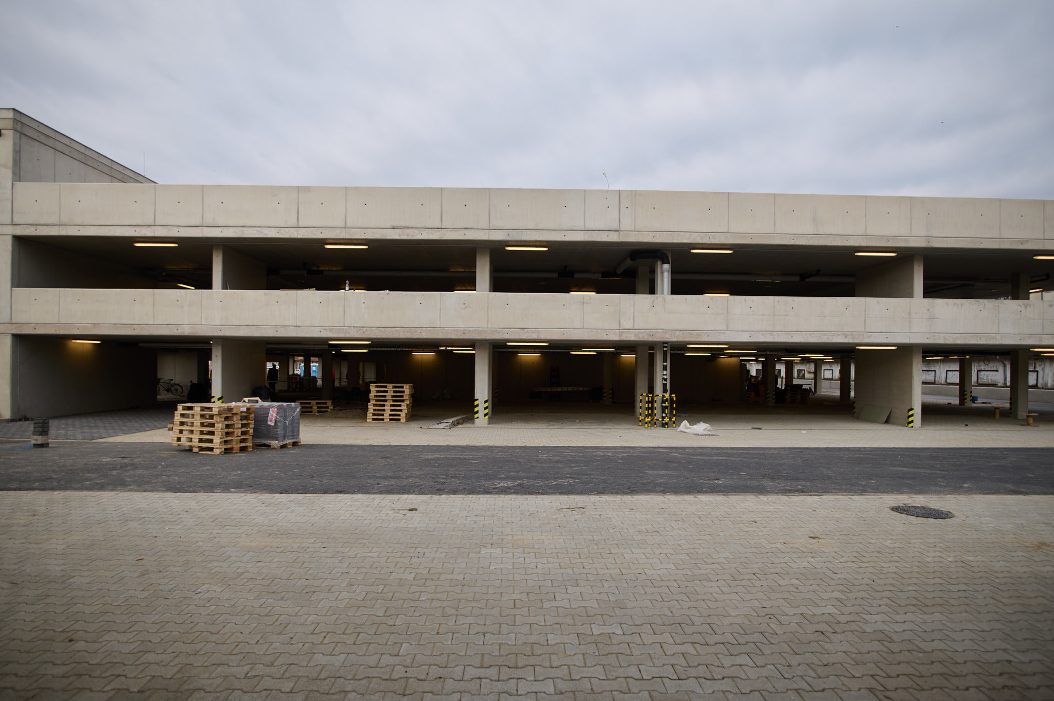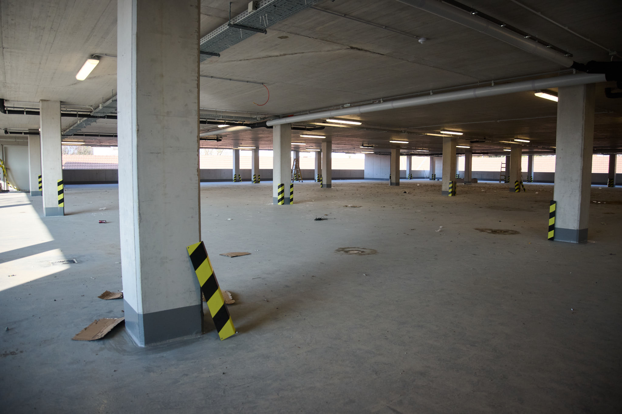 Miután a parkolóház szerkezetileg megvalósult, az épületben elektromos, gépész, műgyanta, lakatos és térkövezési munkálatokat végeznek a kivitelezők.