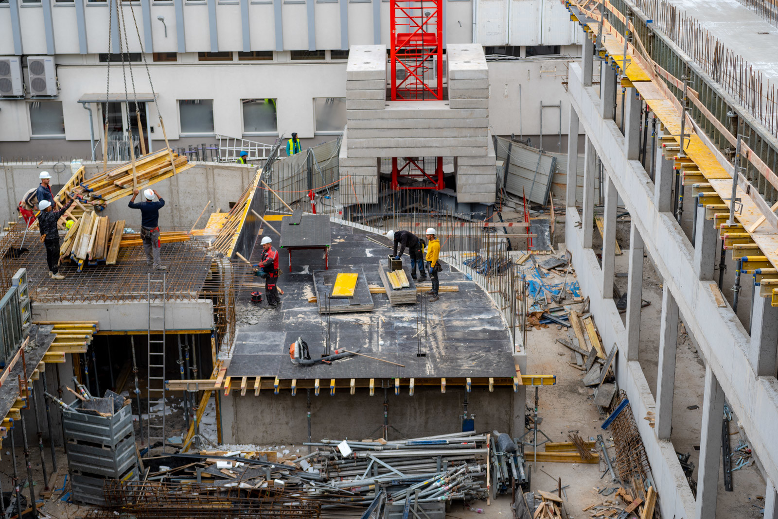 Jelenleg a térszín alatti területeken, - azaz a három pinceszinten – 2021 szeptemberében kezdődtek meg a belső munkafolyamatok, gépészeti és elektromos szerelések, festési munkák, miközben javában zajlik a szerkezetépítés a térszín feletti épületrészeken.