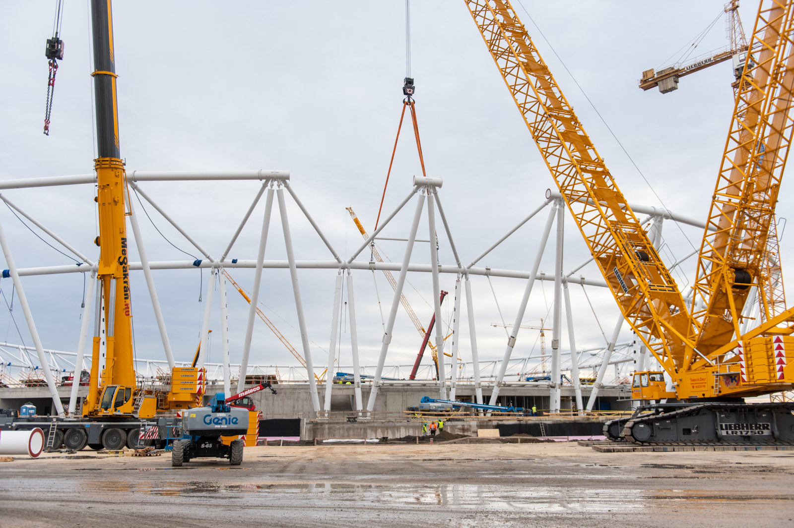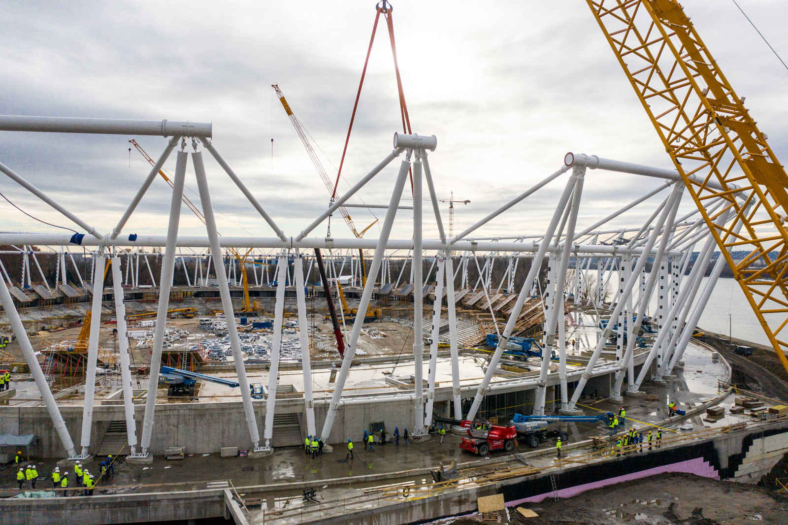A kivitelező csapat 2021. július 12-én kezdte meg az acél tetőszerkezeti elemek beemelési munkálatait, az utolsó elemet pedig december 1-jén helyezték el. A négy és fél hónapig tartó folyamat során ez átlagosan 10 elemet jelentett havonta.