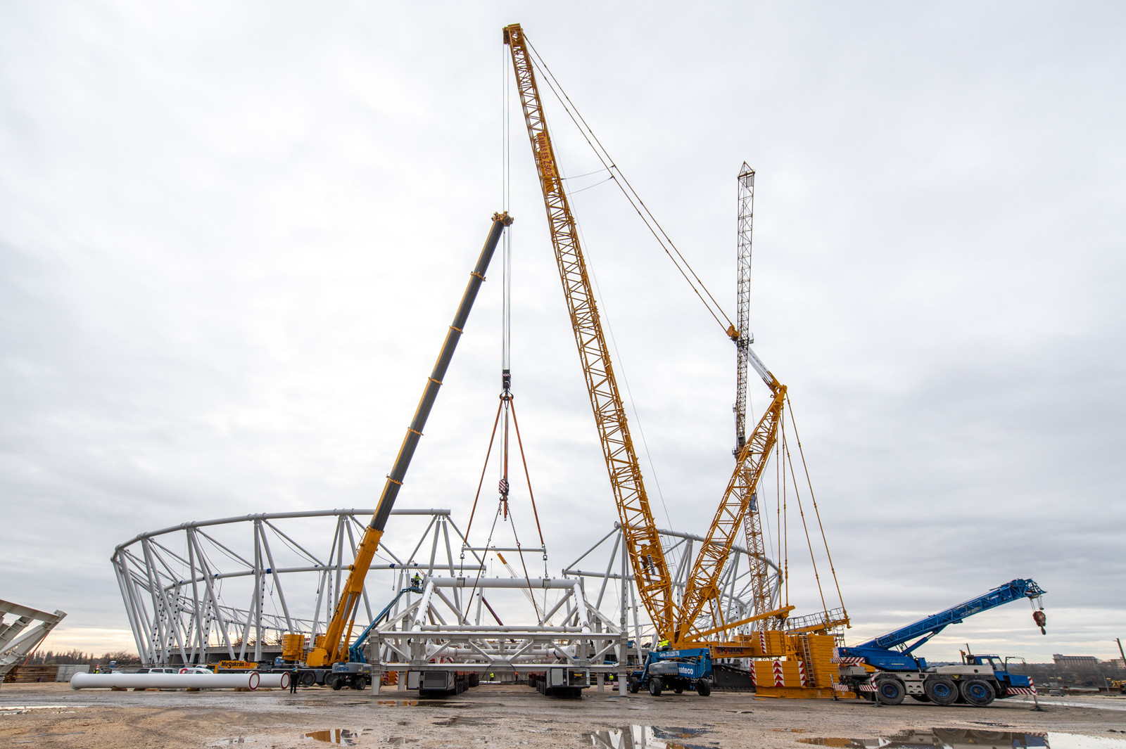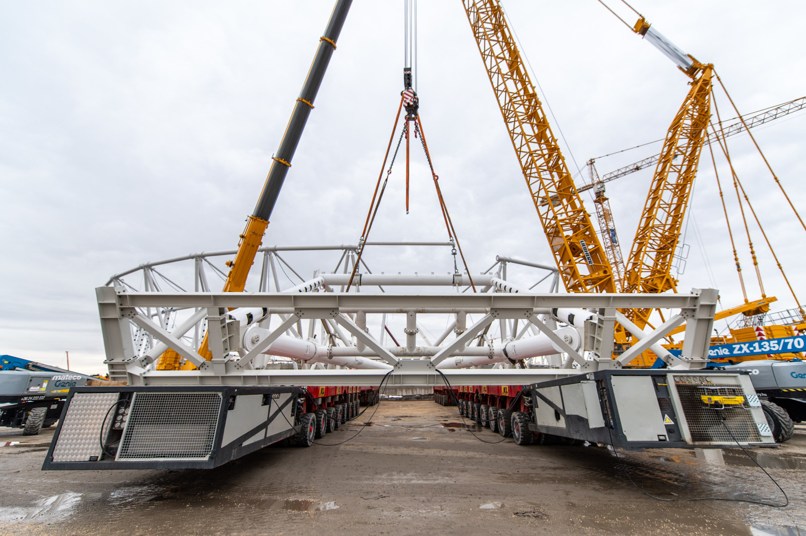 Minden elemet a helyszíni összeszerelést követően egy erre a feladatra használt, kifejezetten nagyméretű áruk szállítására alkalmas SPMT járművel juttattak el egy speciális lánctalpas daruhoz, amely segítségével kerültek végleges helyükre a tetőszerkezeti elemek.