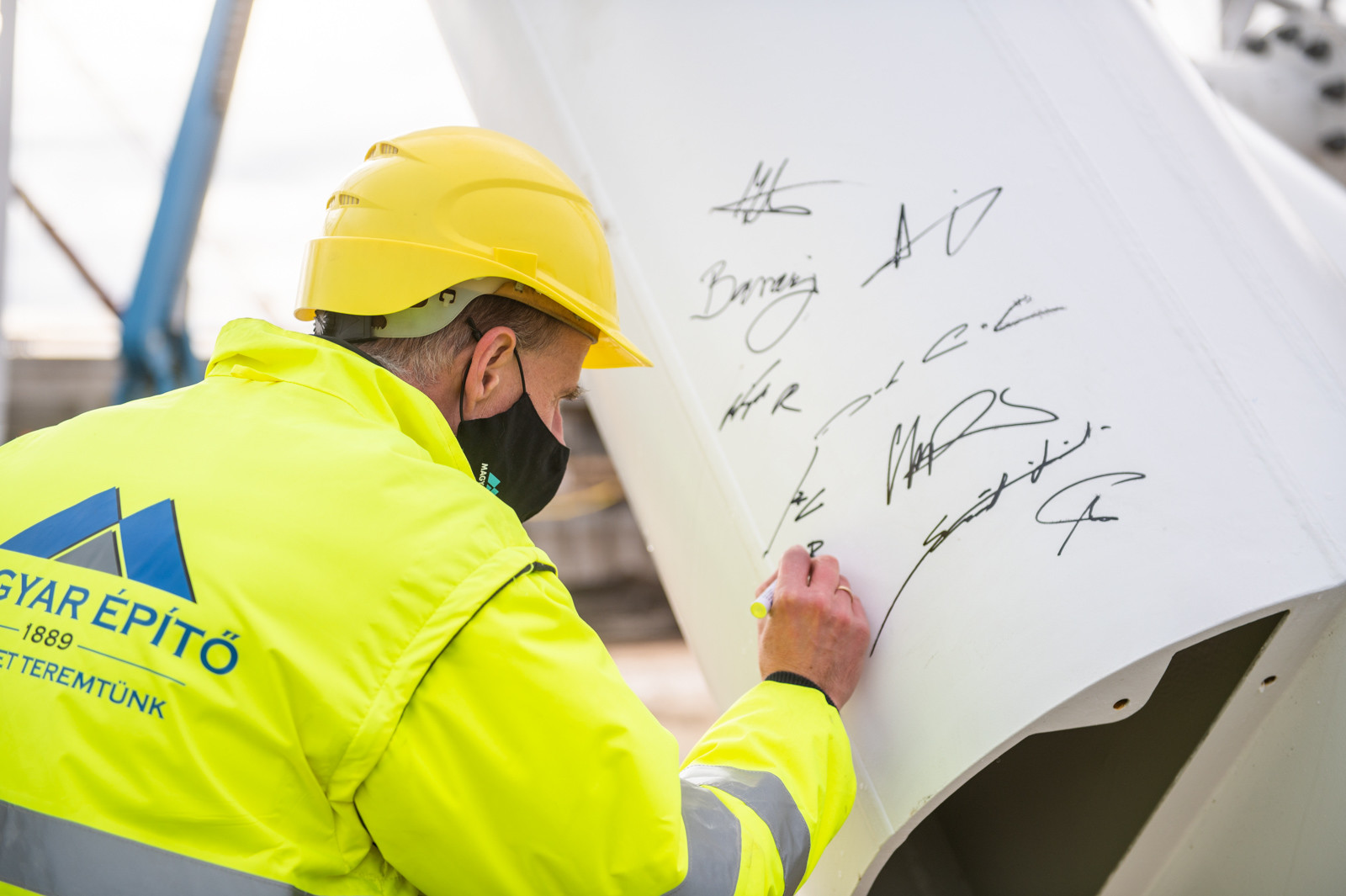 A nagyszabású munkafolyamat részesei voltak a projekt vezetői is, akik a beemelés előtt aláírták az utolsó elemet.